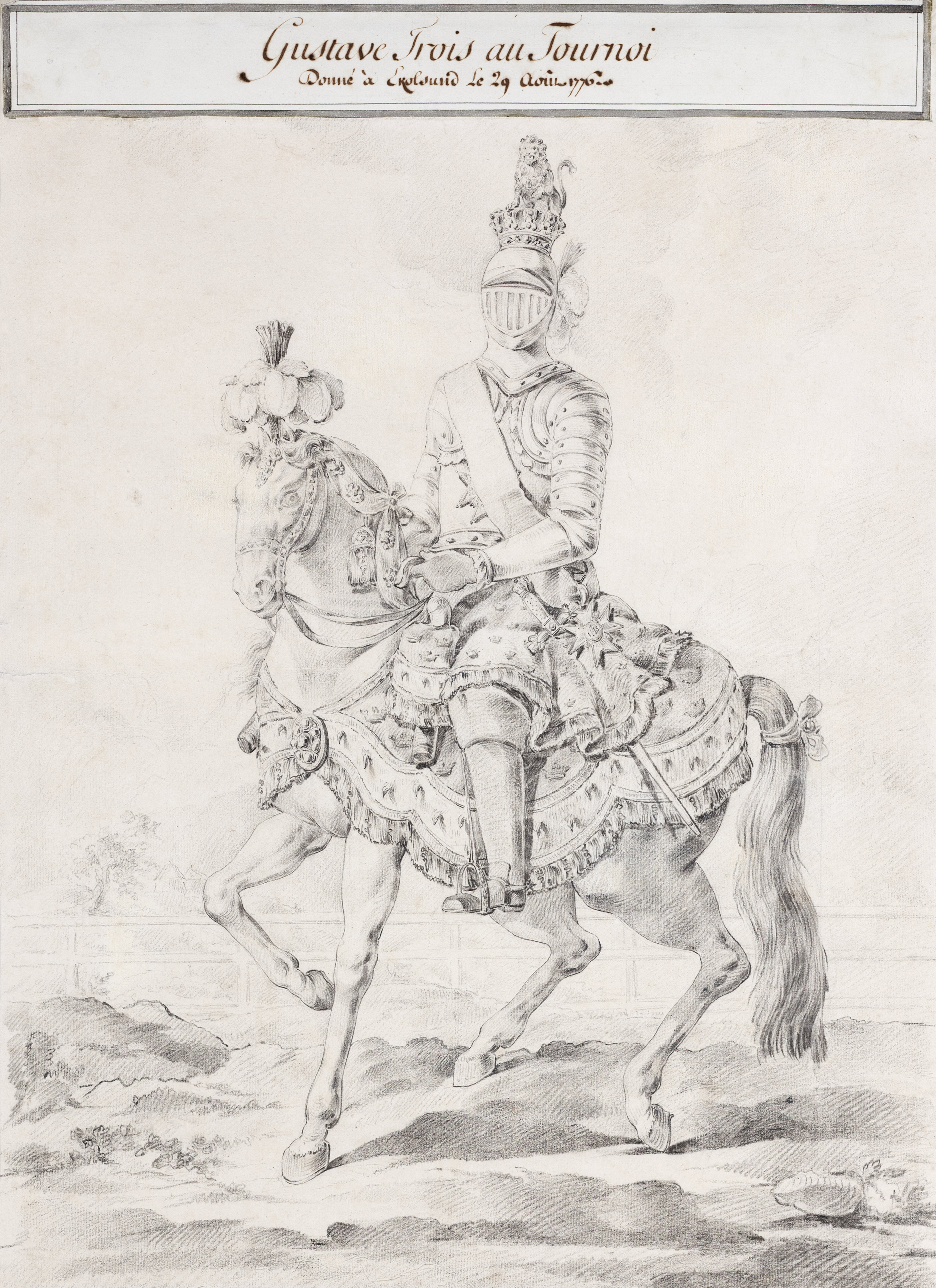Teckning i svart krita föreställande Gustav III till häst vid tornerspelen på Ekolsund 1776. Utförd av Olof Fredsberg.