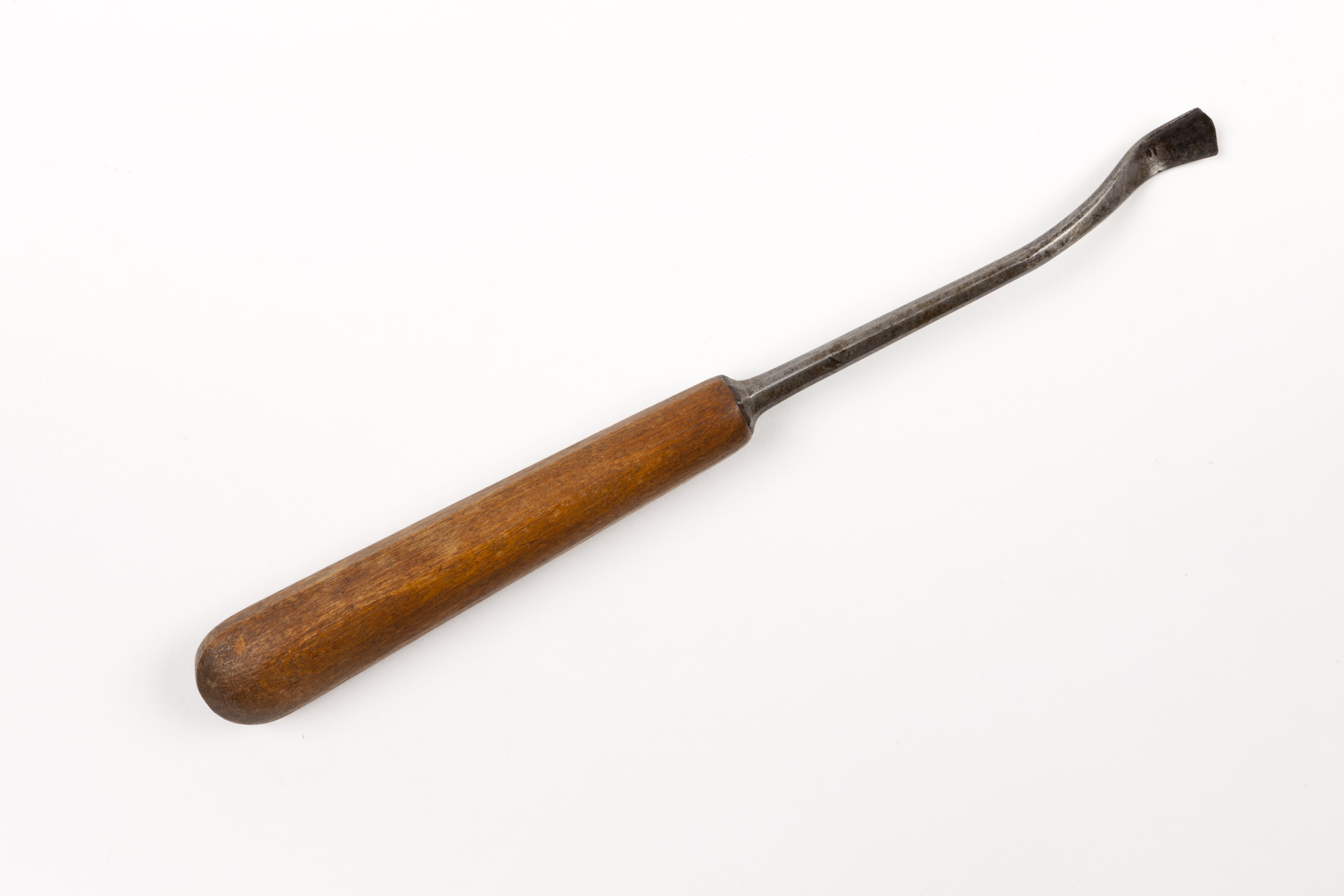 Stämplat på stålet: "4". Klinga med rektangulär genomskärning, avfasade kanter. Böjd, hålig ände. Rundad egg, slipad från undersidan. Vidgad bas. Skuret skaft av lövträ, ovalt med plana kortsidor.