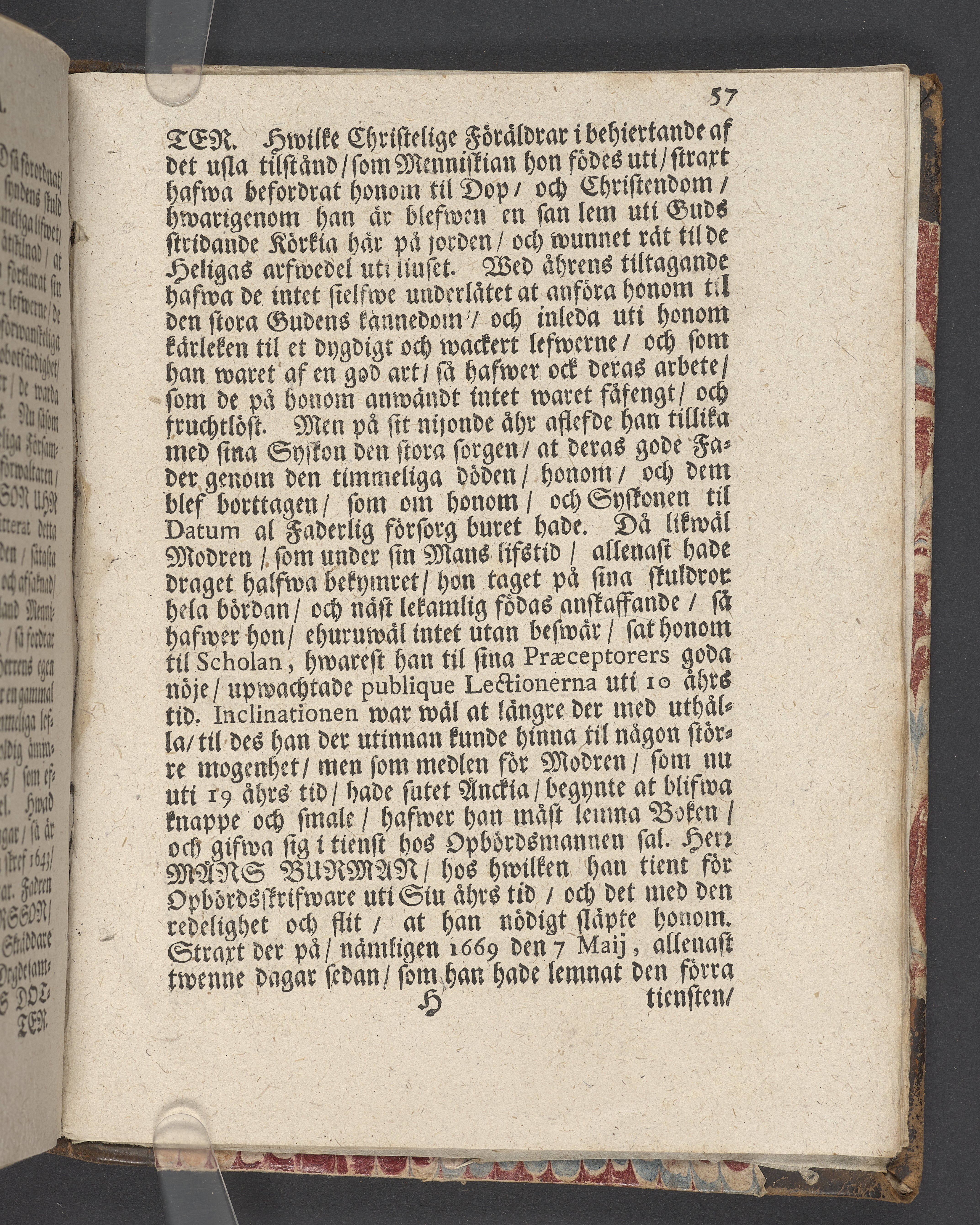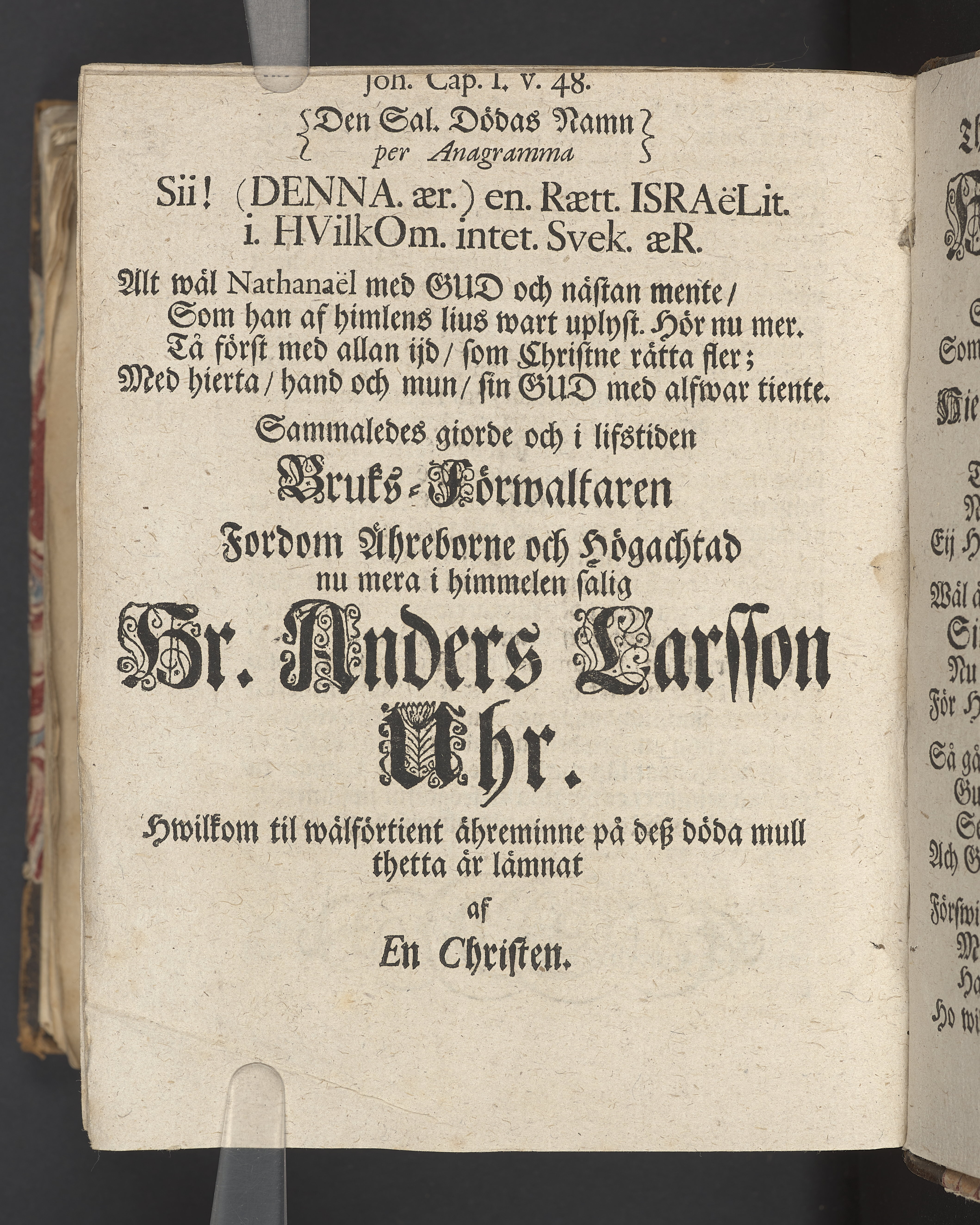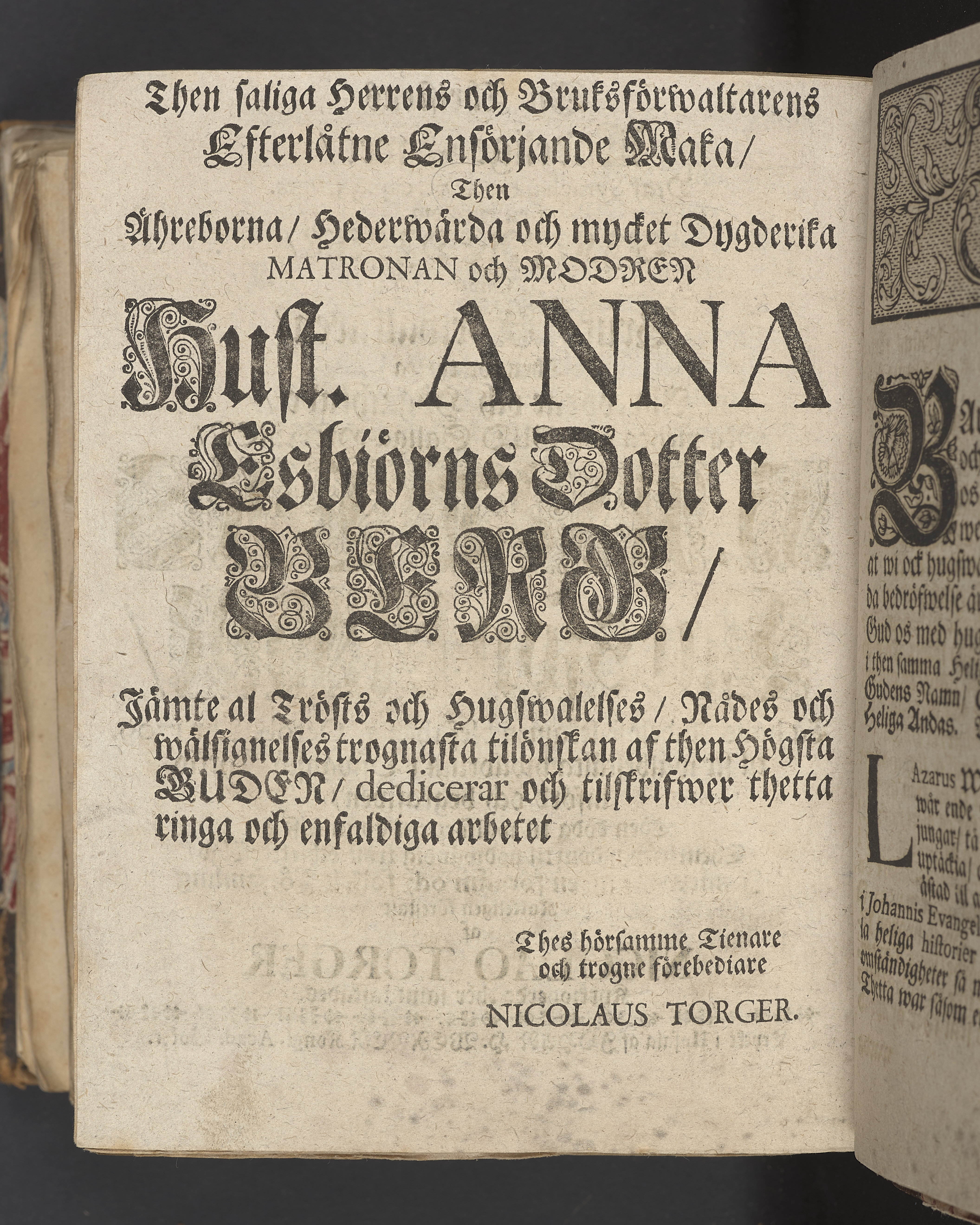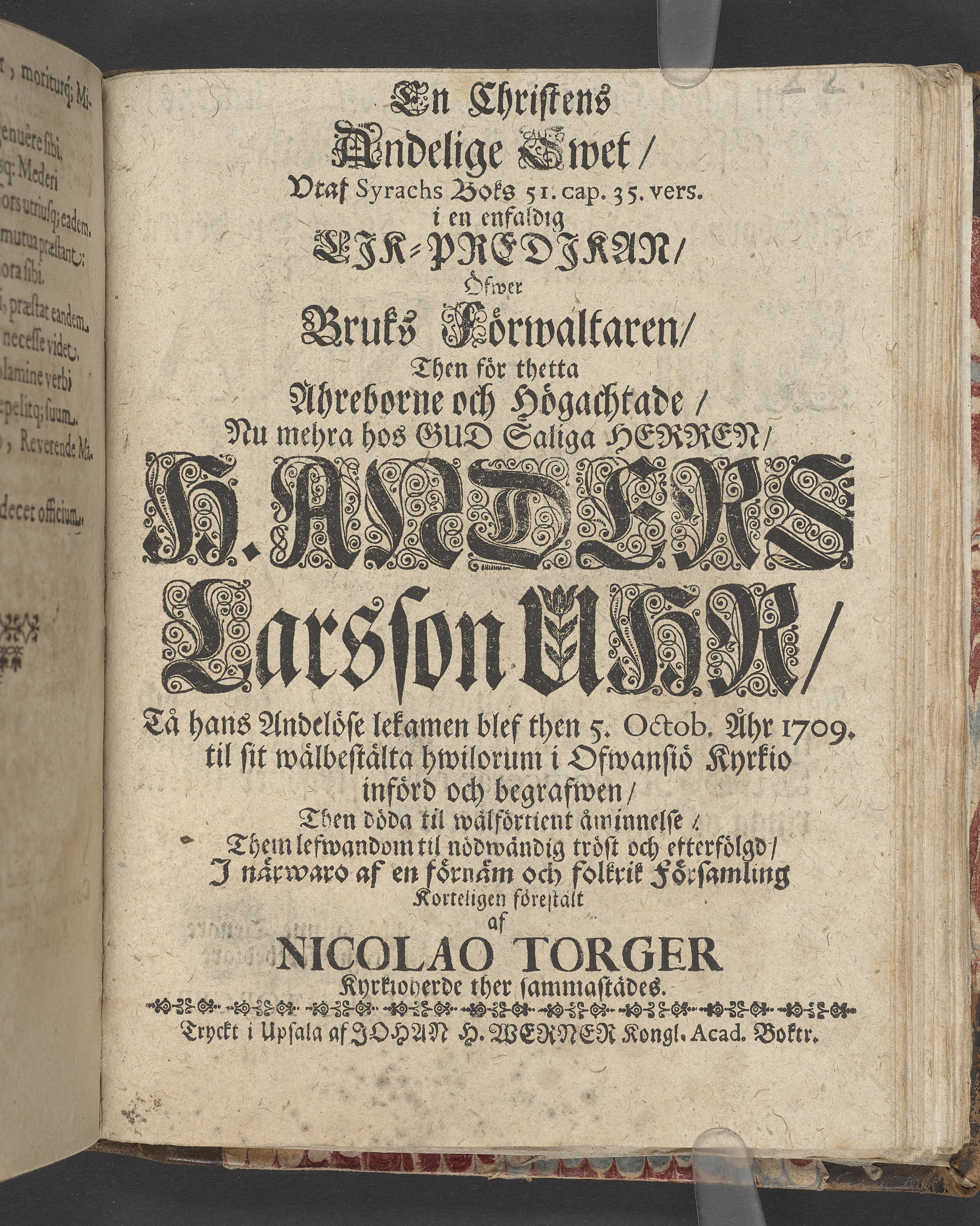 En christens andelige swet, vtaf Syrachs boks 51. cap. 35. vers. i en enfaldig lik-predikan, öfwer bruks förwaltaren ... nu mehra hos Gud saliga herren, h. Anders Larsson Uhr, tå hans andelöse lekamen blef then 5. octob. åhr 1709. til sit wälbestälta hwilorum i Ofwansiö kyrkio införd och begrafwen, then döda til wälförtient åminnelse, them lefwandom til nödwändig tröst och efterfölgd, i närwaro af en förnäm och folkrik församling korteligen förestält af Nicolao Torger ... Tryckt i Upsala af Johan H. Werner kongl. acad. boktr.
