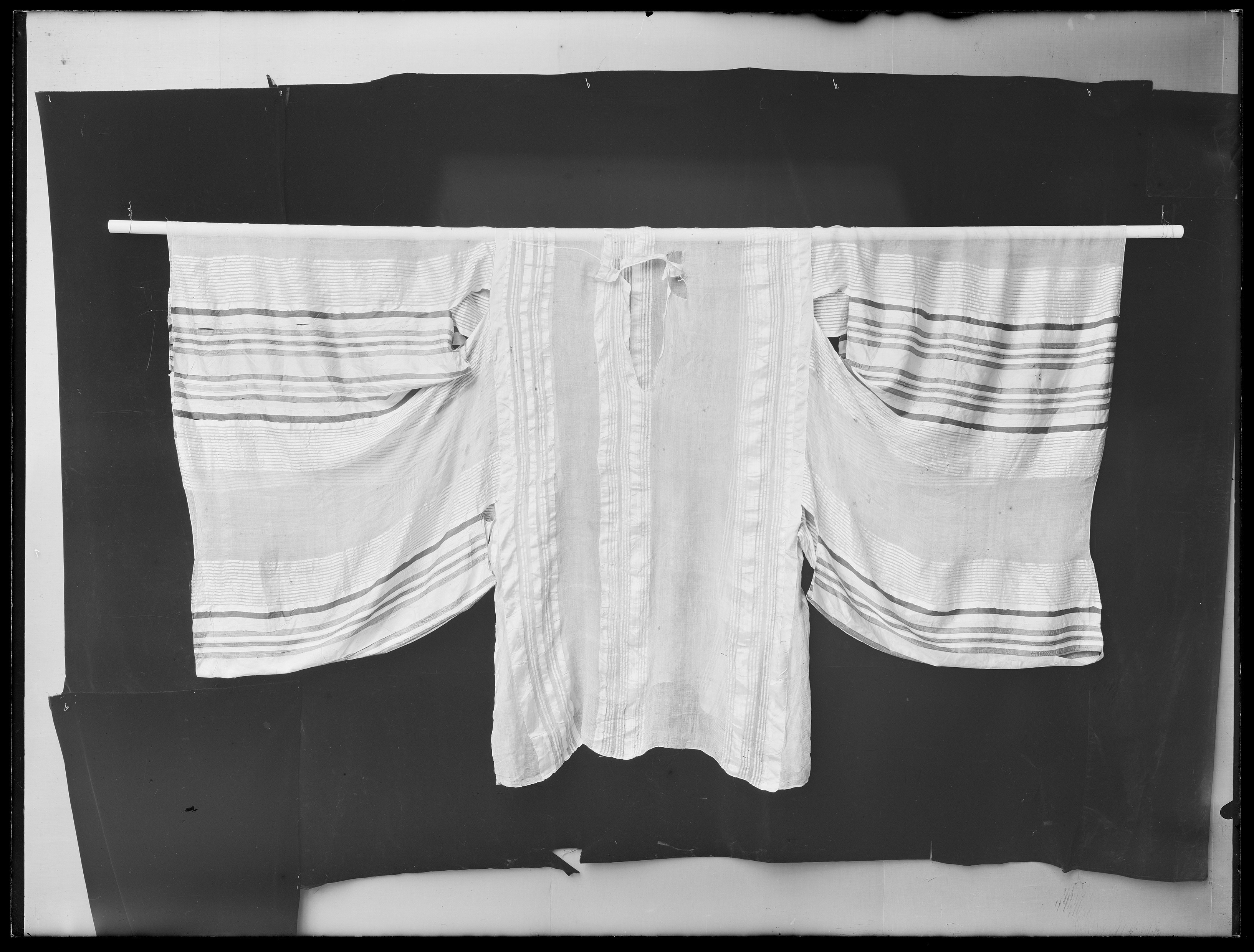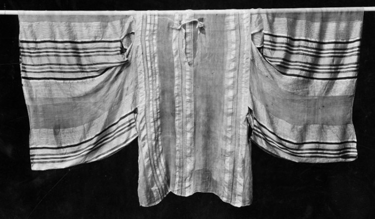 Mycket tunn tröja/tunika i silkeflor alt. silkegas. Mitt fram samt på sidorna är det vävt ett mönster av olika breda vertikala ränder av vitt siden. Framstycket avslutas i sidorna med isydda orangea ränder á ca 30 mm. Ärmarna är mycket vida i samma material som kroppen i övrigt. På vardera ärm sitter det på tre ställen isytt ett multikulört vävt sidentyg som går i färgerna blått/gult/rosa/grönt etc. Mitt på ärmstyckerna är det sydda öppningar (genomgående från bak- till framstycke). Även på vardera axelparti finns det sydda öppningar. Under armen (hålan) är det isytt kilar för extra vidd, dessas kanter avslutas med samma orangea band som på framstycket. Nederkanten på plagget är vågskuret nertill.