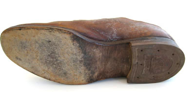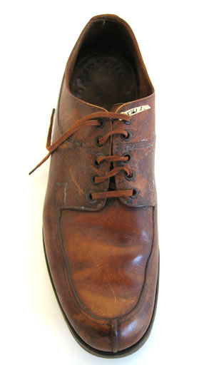 Brun lädersko som är sydd i två sidostycken med söm fram på tån. Sömmen på hälen är täckt av en läderremsa. Invändigt är skons bakstycke i brunt skinn och ovanlädret är av vitt ylle vävt i kypert. Ett brunt skosnöre som är fyra mm brett är trät igenom fem par hål med metalring. Sulan är i 10 mm tjockt skinn och består av läder och stiftlappen är i gummi. Invändigt i hälens parti är en stämpel med texten: "LOTUS EDGE GRIP GOLF SHOE pat. No 414,047".
