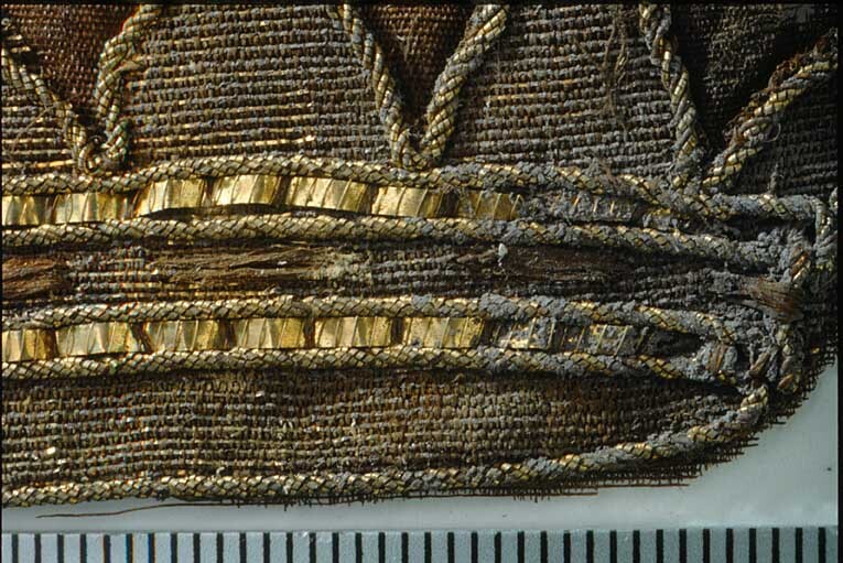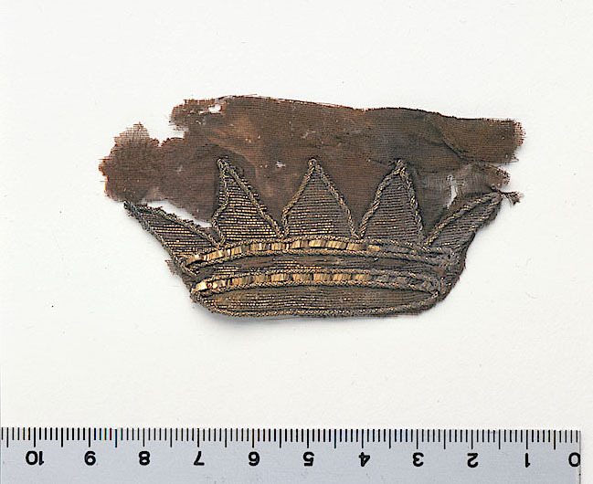 Fragment av siden i varprips med applicerad vävd och broderad femuddig krona. Kronan är klippt ur en väv av silke och guldlan. Kronans hjässband har detaljer av påsydda, veckade förgyllda guldlan samt broderier av grovt silke. Kronans konturer samt de veckade guldlanen kantas av en applicerad guldsnodd. Kronan ursprungligen applicerad på manteln, troligen fastklistrad. De ursprungliga färgerna delvis förändrade, fragmentet numera i brunt och guld. Ovanför den vänstra udden finns en glipa i tuskaftsväven. Fragmentet ingår i en samling fragment tagna som prov ur drottning Kristinas kista vid gravöppningen den 13-14 december 1965. Mantel: Varp: 2-trådigt löst spunnet silke i svag s-snodd. Trådtäthet: 75 varptrådar/cm. Inslag: 2-trådigt löst spunnet silke i svag s-snodd. Trådtäthet: 35 inslag/cm. Material: Silke. Teknik: Varprips, franska: gros de Tours. Kommentar: Inslaget är grövre än varpen. Nuvarande färg är brun. Kronans väv: Mått: b: 78 mm, h: 40 mm. Varp: Knippen av parallellt liggande fibrer. Trådtäthet: 80 trådar/cm. Inslag: Vartannat inslag är silke vartannat är ett lan. Silke av parallellt liggande fibrer. Lanet består av förgyllt silver med förgyllning på båda sidor. Guldskiktet är <0,1 um och något förorenat av klor. Trådtäthet: 40 inslag/cm. Material: Silke och förgyllt silver. Teknik: Tuskaft. Kommentar: Inslaget är grövre än varpen. Snodden runt kronan består av 3 st snoddar av spiralvridna guldlan vridna runt en silkekärna. Snodden är fastsydd på kronan med 2-trådigt silke, spunnet i z-snodd och tvinnat i s-snodd. Lanet består av silver, förgyllt på båda sidorna. Guldskikt <0,1 um. Tjocklek 0,01 mm. Litet klor på ytan. De veckade lanen på hjässbanden består av förgyllt silver. Guldförgyllningens tjocklek är <0,3 um. Tjocklek 0,05 mm. Den högra delen av de veckade lanen är skadade och saknas bitvis, för övrigt är de i gott skick. Lanen är fastsydda med 2-trådigt silke spunnet i z-snodd och tvinnat i s-snodd. Metalltråden som är virad runt de veckade lanen består av förgyllt silver med spår av klor på ytan. Förgyllningsskiktet <0,6 um. Diameter ca 0,07 mm. Broderiet på hjässbandet är sytt i grovt silke med långa stygn som bildar fem partier.
