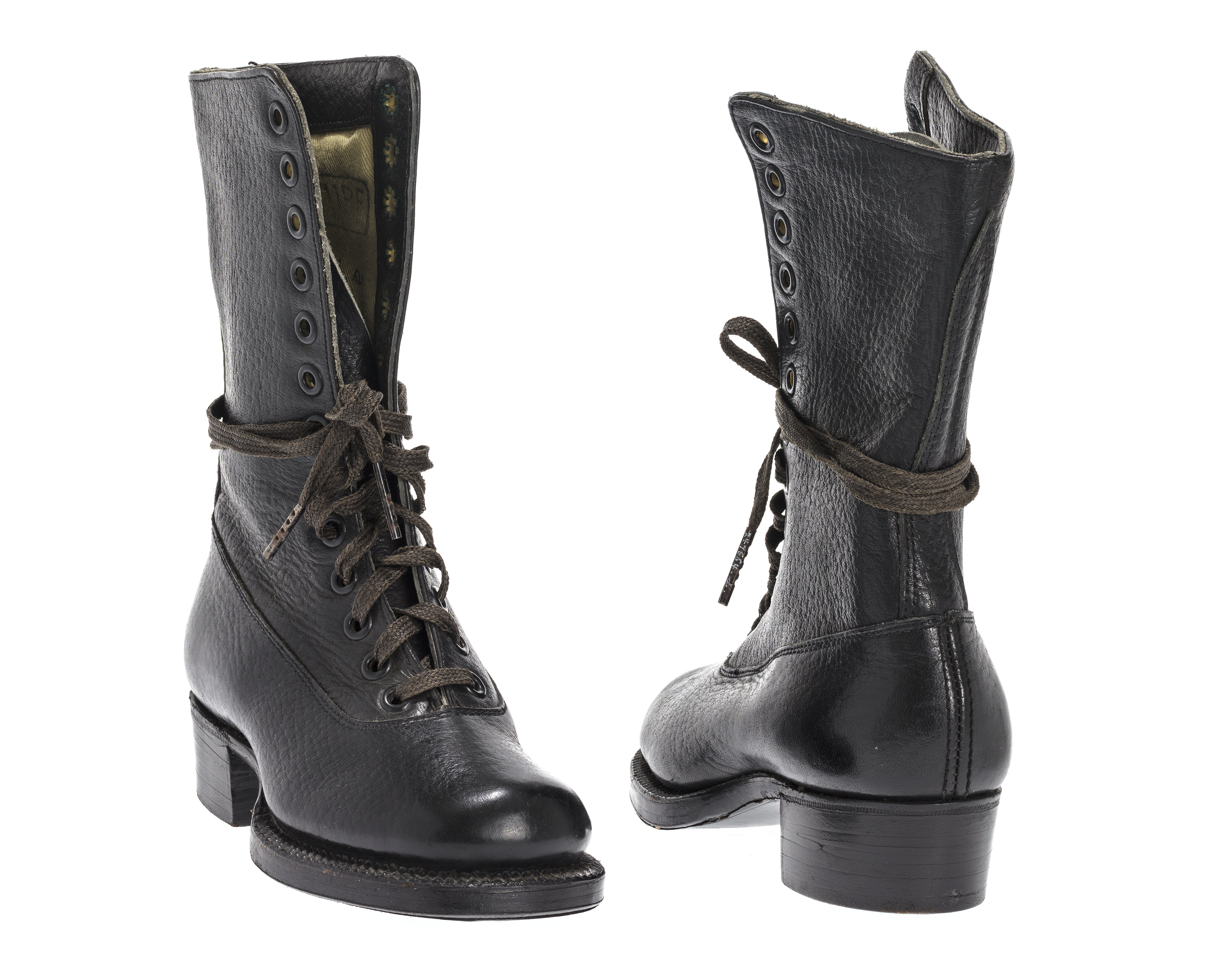 Uniformskänga, storlek 25, av svart läder; skaftet av grovt läder med struktur; 13 par svartmålade mässingsöljetter för snörning, ärgade på insidan; hättan, sidorna och hälen skurna i ett stycke; häl och tå blankslipade; randsydd lädersula med bågformad punsning, s.k. sulförsirning; sulan märkt 25 / Sture / A; klack av läder, fäst med 21 nitar i ytterkant; foder av khaki-färgad bomull, stämplat med tillverkarens firmamärke i svart STURE inom en rektangel samt med serienummer 6870-4147-25; innersula av läder med en hällapp av filt; skosnöre av brunaktig bomull, möjligen ursprungligen svart. Buren av HM Konung Carl XVI Gustaf vid tre års ålder 1949. Utställd tillsammans med konungens uniform nr 11039-11042.