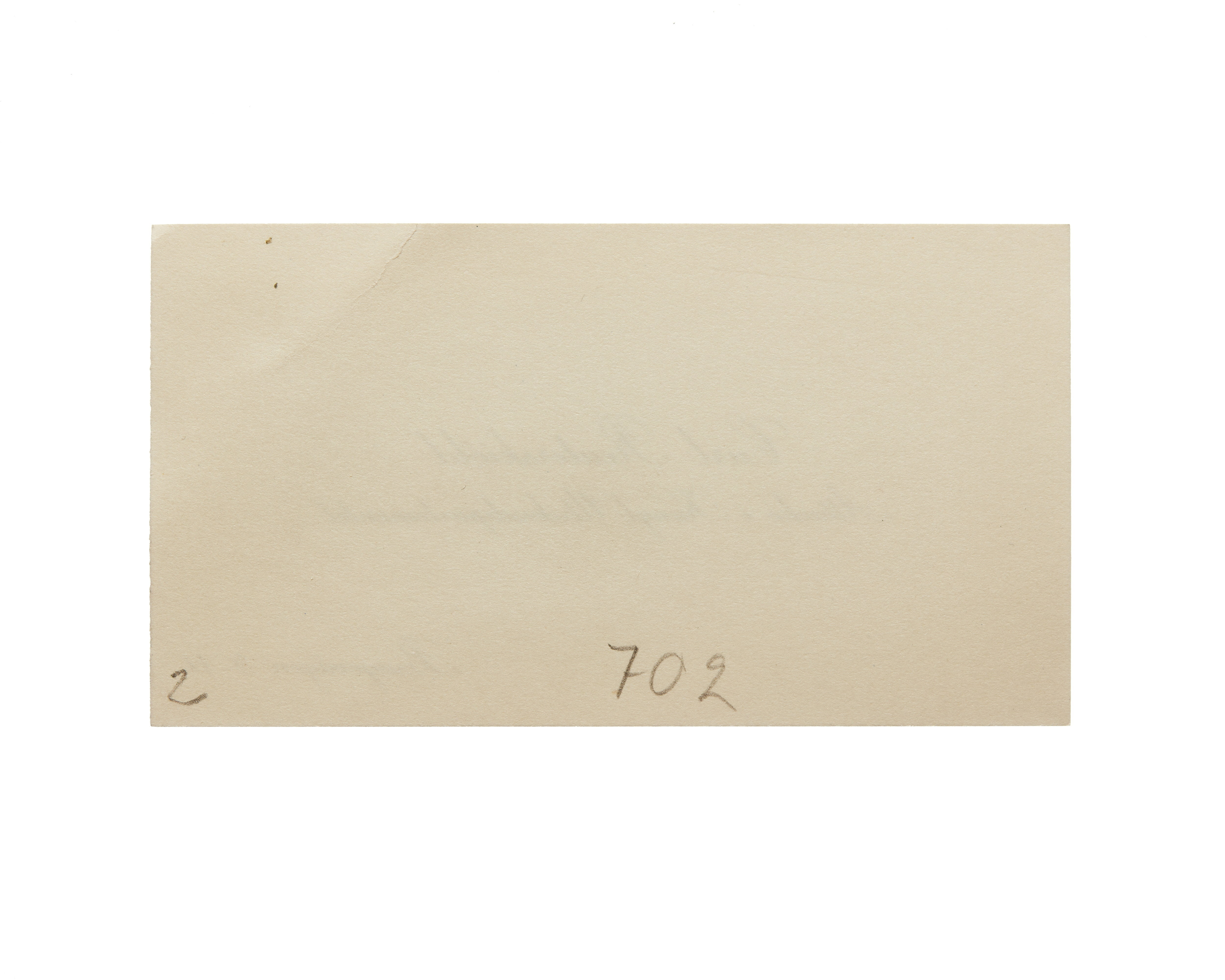 Två visitkort från Carl Reuterskiöld, attache i Kungl. Utrikesdepartementet, båda är utan datum, vikt i övre högra hörnet. Adress (nedre högra hörnet) Bragevägen 9-11.