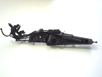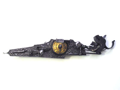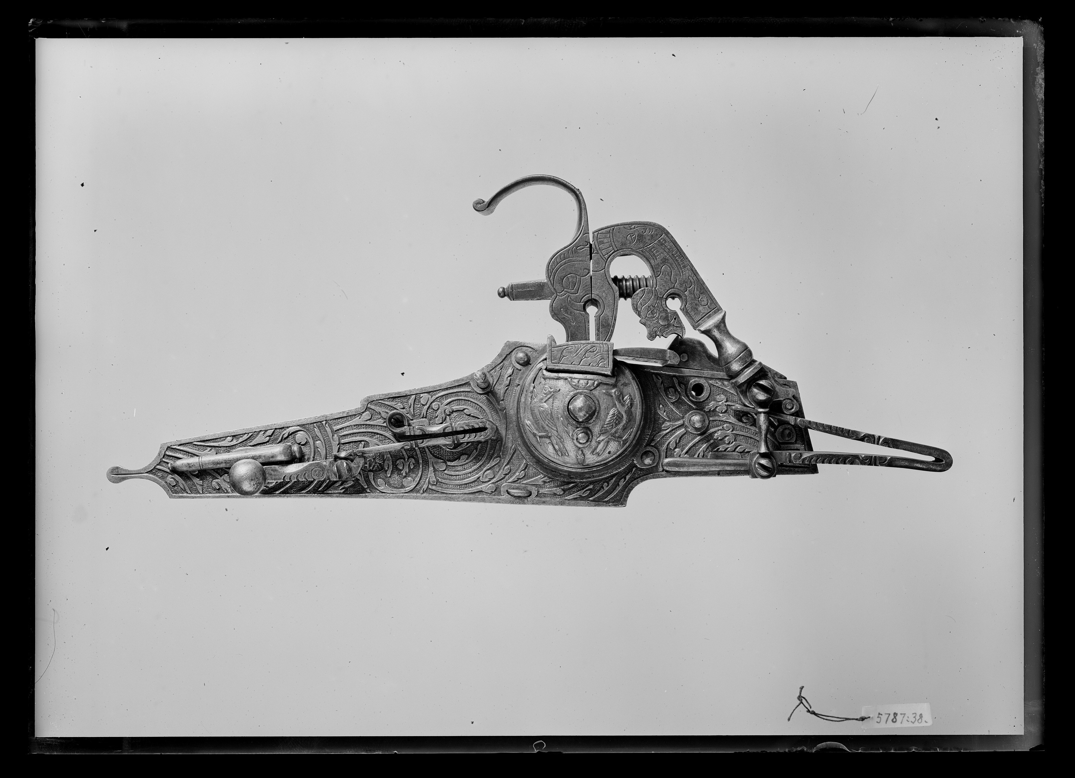 Rombiskt, plant låsbleck med bakåt utdragen spets med knopp. Ytan täckt med ciselerat rankverk mot punsad, försänkt bakgrund. Utvändigt hjul fäst med ring samt välvd hjulkapsel av förgylld mässing med i relief en krona och två fåglar. På fängpannans gavel graverade akantusblad, antydan till eldskärm. Fängpannelock med rörlig arm, på locket graverat en maskaron. Platt hane med lös överkäke, uppsvängt fingergrepp, kantig käkskruv med knopp. Hanhals och läppar graverade som odjurshuvud, skägglös ansikte med hatt(?) och på en liten skärm en skäggprydd profil. Balusterformig hankropp och hanstudel. Graverad hanfjäder med delvis fasade kanter, lång, rak, välvd flik. Nedanför säkringen en stämpel: W H och stjärna (Stöckelnr 4771). Säkring: Bakom hjulkapseln en virvelsäkring.