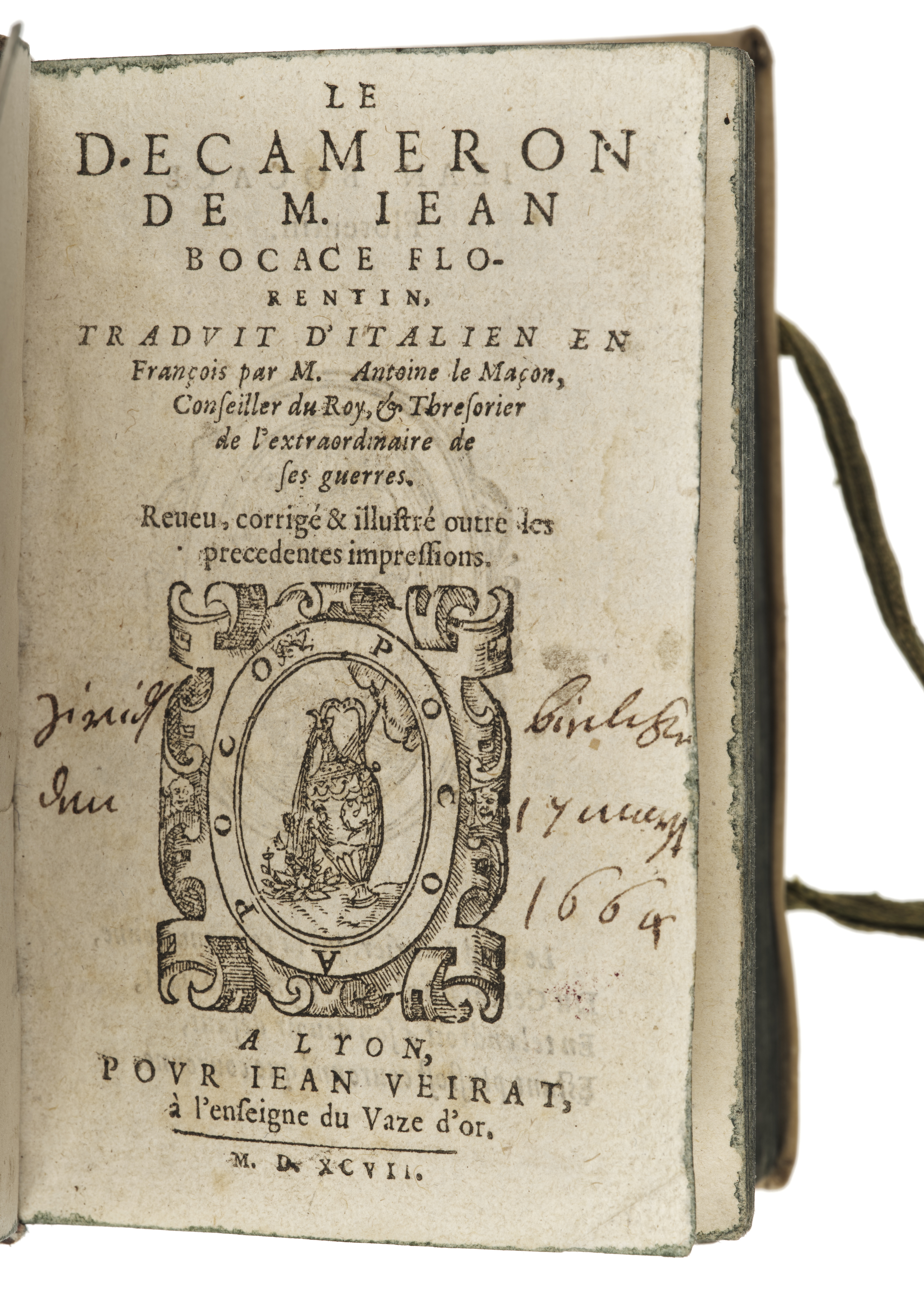 Le Decameron de M. Jean Bocace florentin, tradvit d'Italien en François, par M. Antoine le Maçon ... Revue, corrigé & illustré outre les precedentes impressions. A Lyon, povr Jean Veirat ... MDXCVII.
