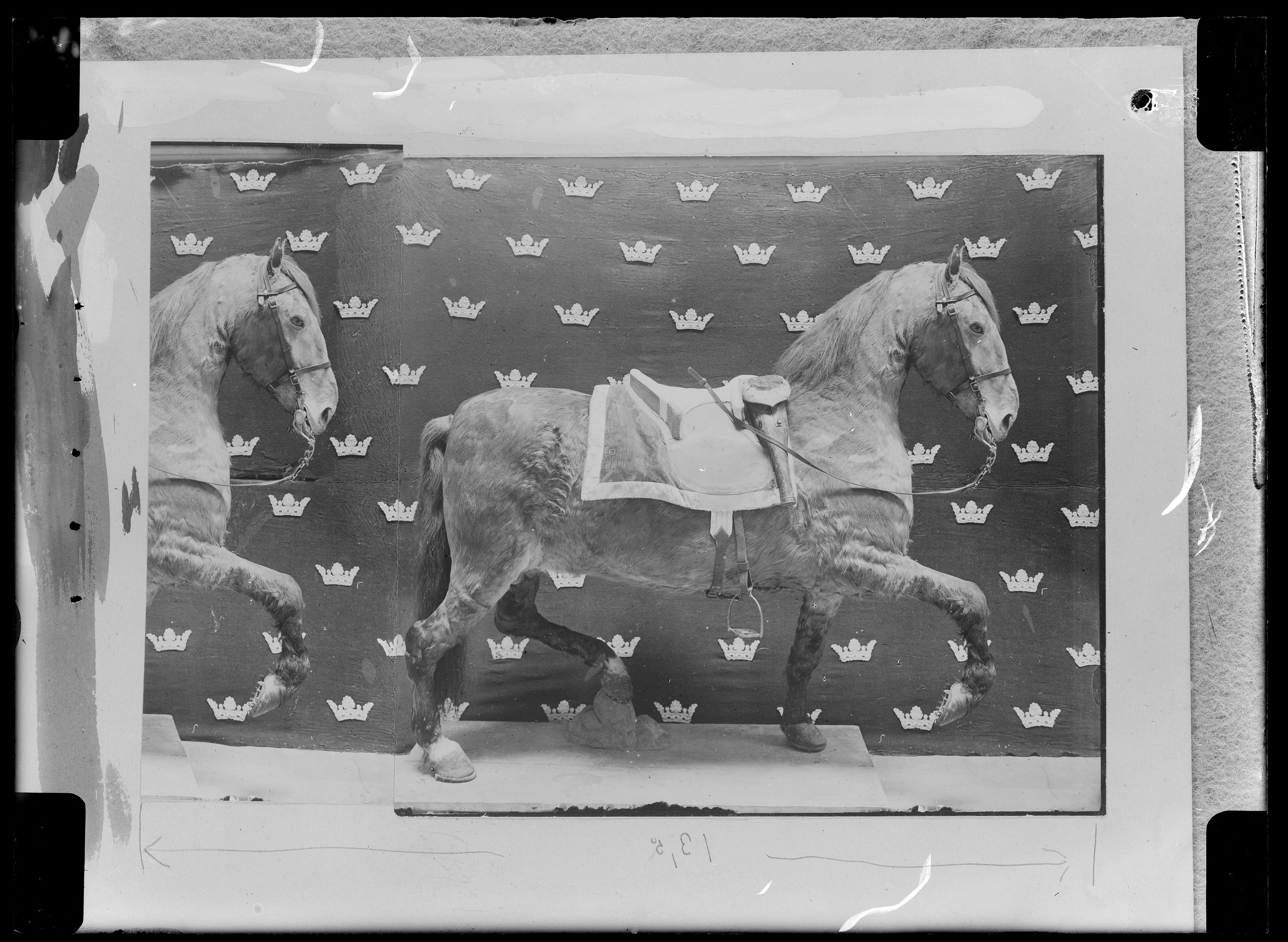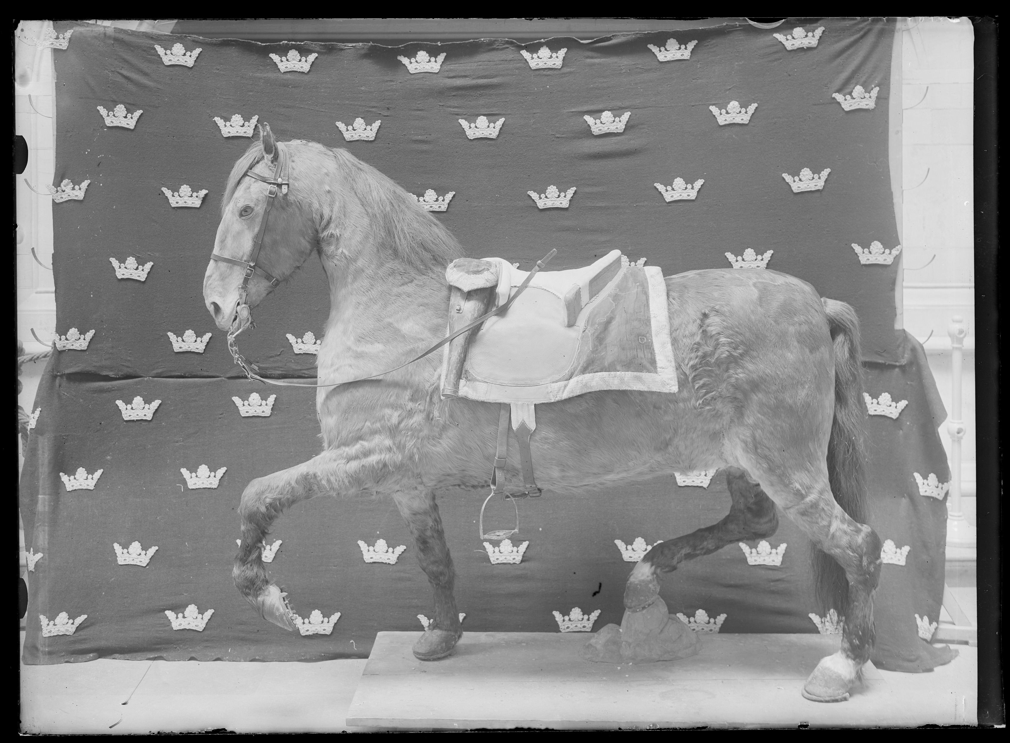 Sadel med rektangulära kappor, kantade med bred guldgalon. Delvis överklädda med röd sammet. Från bommarna ned till kanten ljusbrunt läder. Låga bommar, vars insidor liksom sitsen är klädda med ljust sämskat skinn med vågformiga stickningar. Fram- bommen delad 60 mm hög. Bakbom 75 mm hög med små stödbommar. Framtill hölster av mörkbrunt läder fastsydda på sadeln. Kappor av röd sammet kantade med guldgalon fästade vid hölstret med läderstropp. Bom överklädd med läder. Bossa av naturfärgat linne kantat med brunt läder. Rektangulära hål för stigläder. Nedtill på kapporna fastsytt sadelgjord av naturfärgat hampgarn (?). med smala mörkare ränder. I ändarna stroppar av läder, den ena med hål, den andra med sölja av stål. Fyra stroppar av läder för bukgjord. Sadeln skall enligt tidigare kataloguppgifter ha varit brukad av Gustav III i Ryska Krigen 1788-1790.