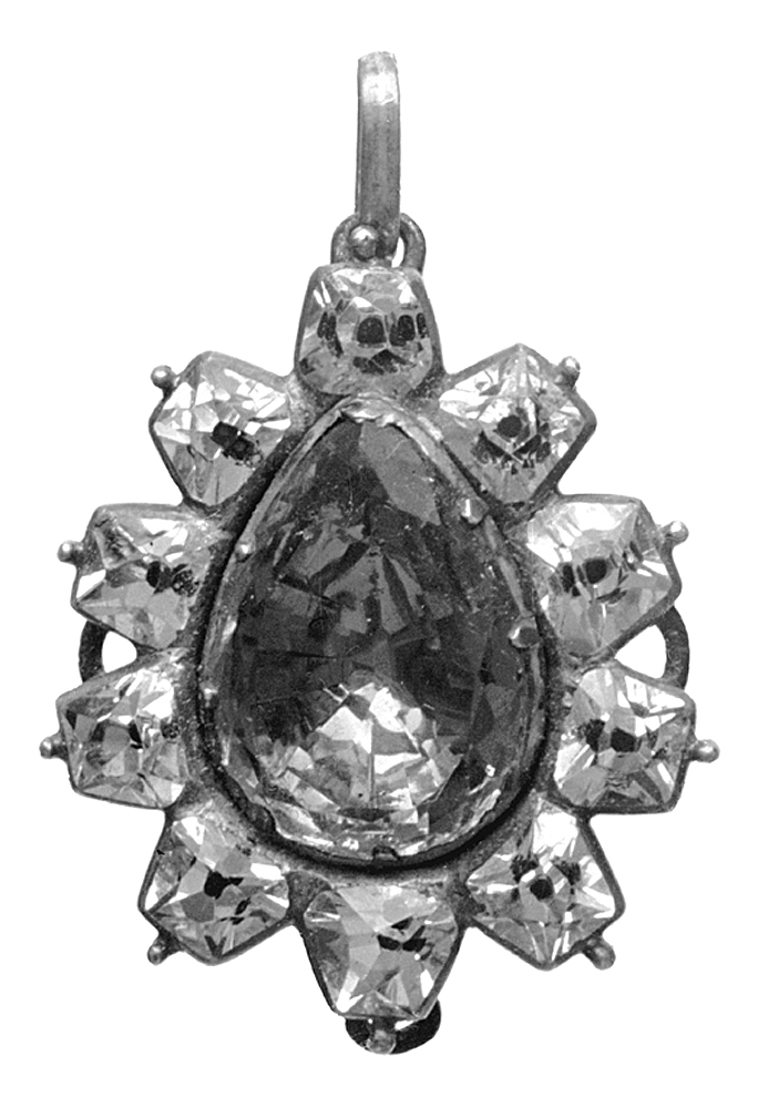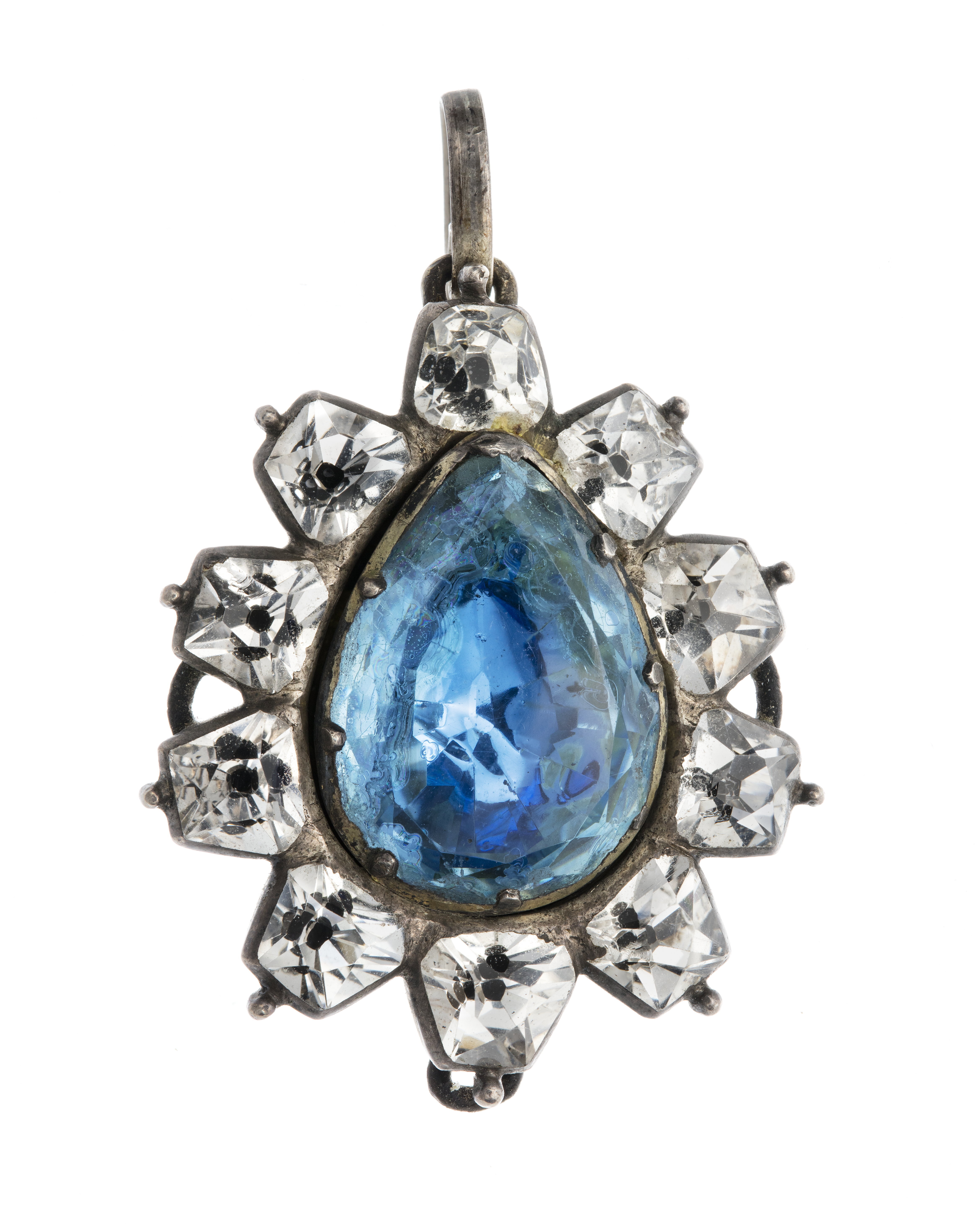 ÖRHÄNGEN, ett par. Av silver med bergkristall och pärlemo. Ovalt, i mitten en päronformig plattslipad blå glassten med fasetterad kant ifattning med åtta körnorsamt med safirfärgad folie. På baksidan på den stora stenens fattning två utåt omböjda korta platta hakar. Utan stämplar. Längd utan hake: 2,9 cm, bredd: 2,4 cm. Från 1700-talets senare hälft. Inköpta av Wilhelmina von Hallwyl april 1907 hos juvilerarfirman JE Torsk, Stockholm.