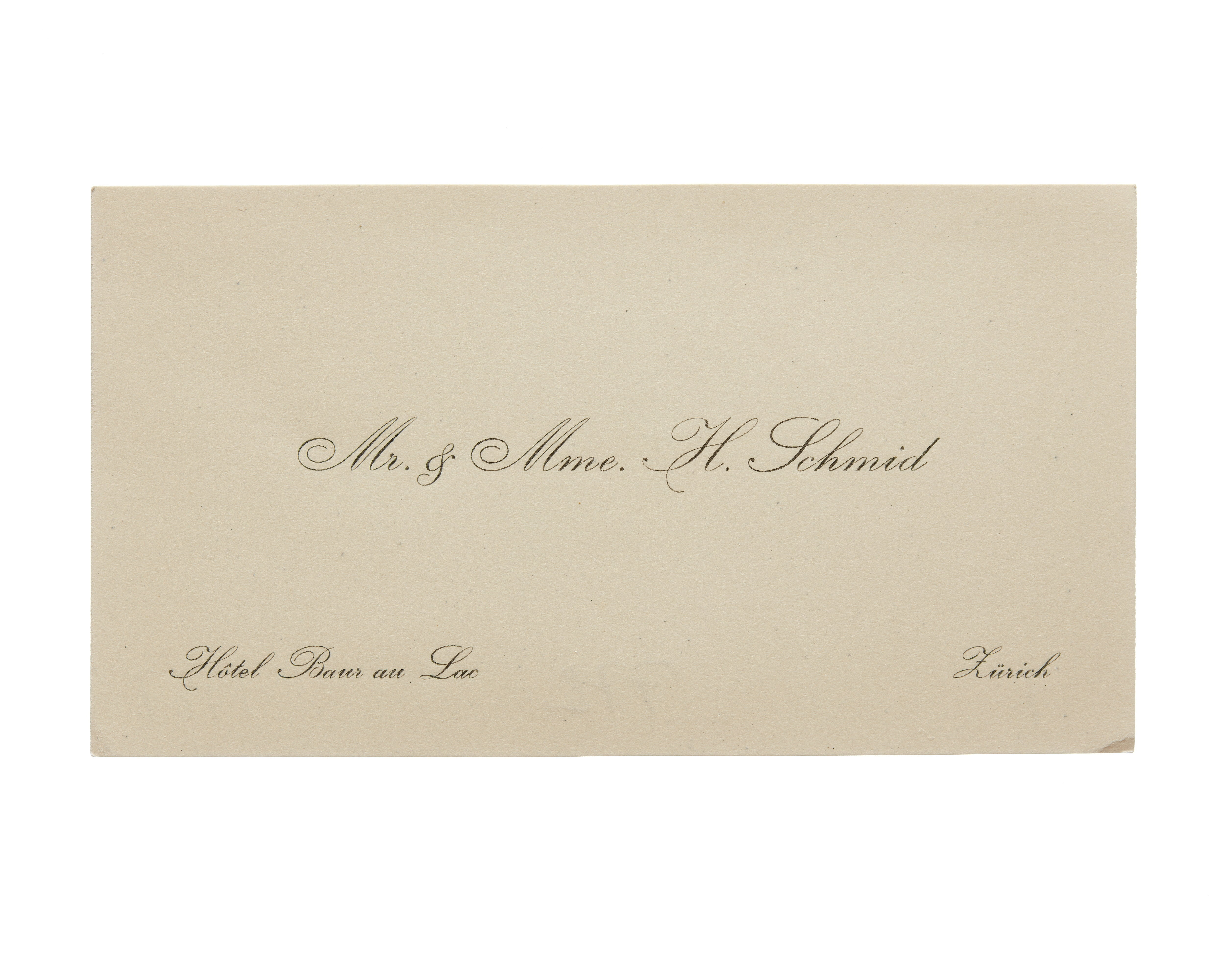 Ett visitkort från Mr. Hermann Schmid & Mme Schmid, datetrat 1927, vikt i nedre vänstra hörnet. Adress (nedre vönstra hörnet) Hotel Baur au Lac, (nedre högra hörnet) Zürich.