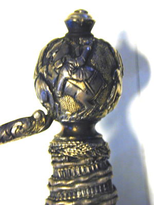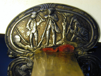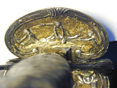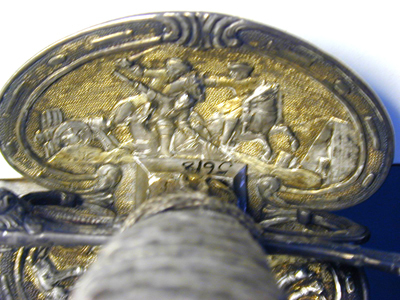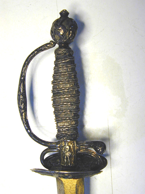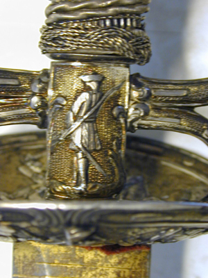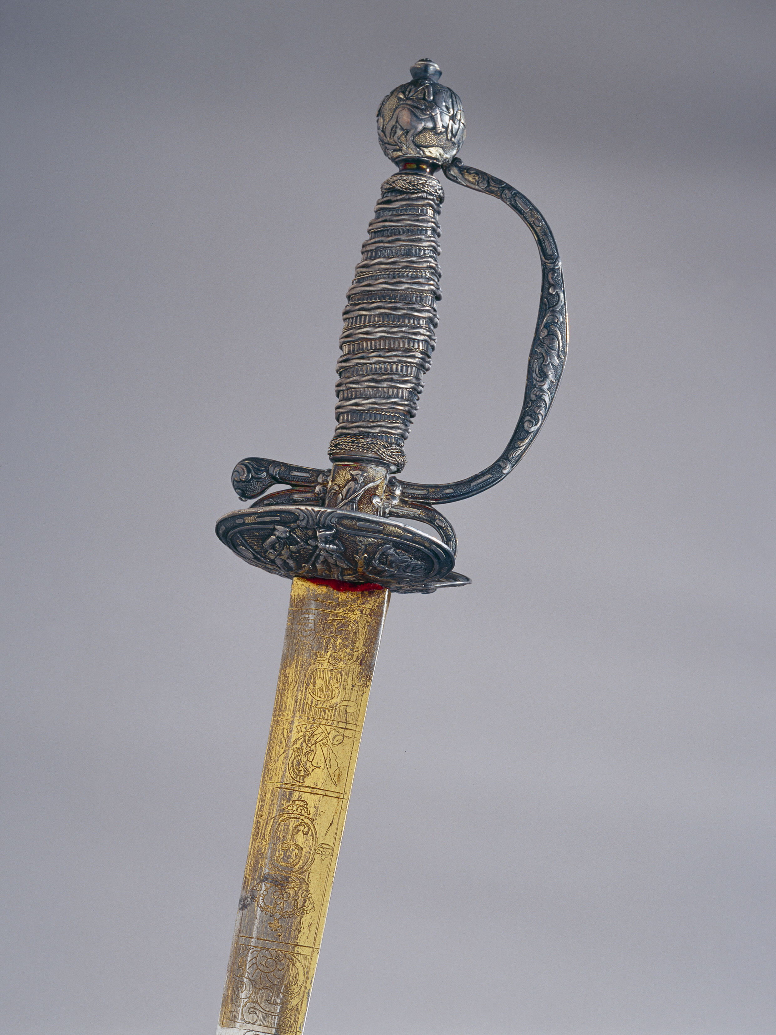 Fäste av reliefornerat, delvis förgyllt silver. Knapp närmast klotformig, nitknapp hög, vidgad upptill. Knappen med ryttarfigurer mot förgylld, mattpunsad bakgrund. Handbygel med rankor och c-formiga bågar, på mitten av utsidan ett bröstharnesk, på insidan en hjälm. Bakre parerstång kort med droppformigt vidgad ytterände. Fingerbyglar med punsad ornering. Kryssets utsida med en fotsoldat sedd framifrån, insidan med en fotsoldat sedd bakifrån. Parerplåtar njurformiga med soldatmotiv i relief mot frgylld, mattpunsad botten. Kavel lindad med breda, veckade silverlan varemellan två tjockare och två tunnare, tvinnade silvertrådar, upptill och nedtill två släta ringbeslag. Klinga rak, tvåeggad, s. k. colichemard med sexsidig slipning. 127 mm av starka delen med förgylld och etsad ornering. Vid basen på båda sidor etsade, s-formiga bladrankor, därefter en trofégrupp. På utsidan ovanför denna en vase inom en rokokoram under kunglig krona, därefter ett enkelt rokoko-ornament. På insidan en krönt medaljong omslutande ett G omgivet av tre kronor, därefter lika dekor som på utsidan. Klingan i övrigt högglanspolerad.