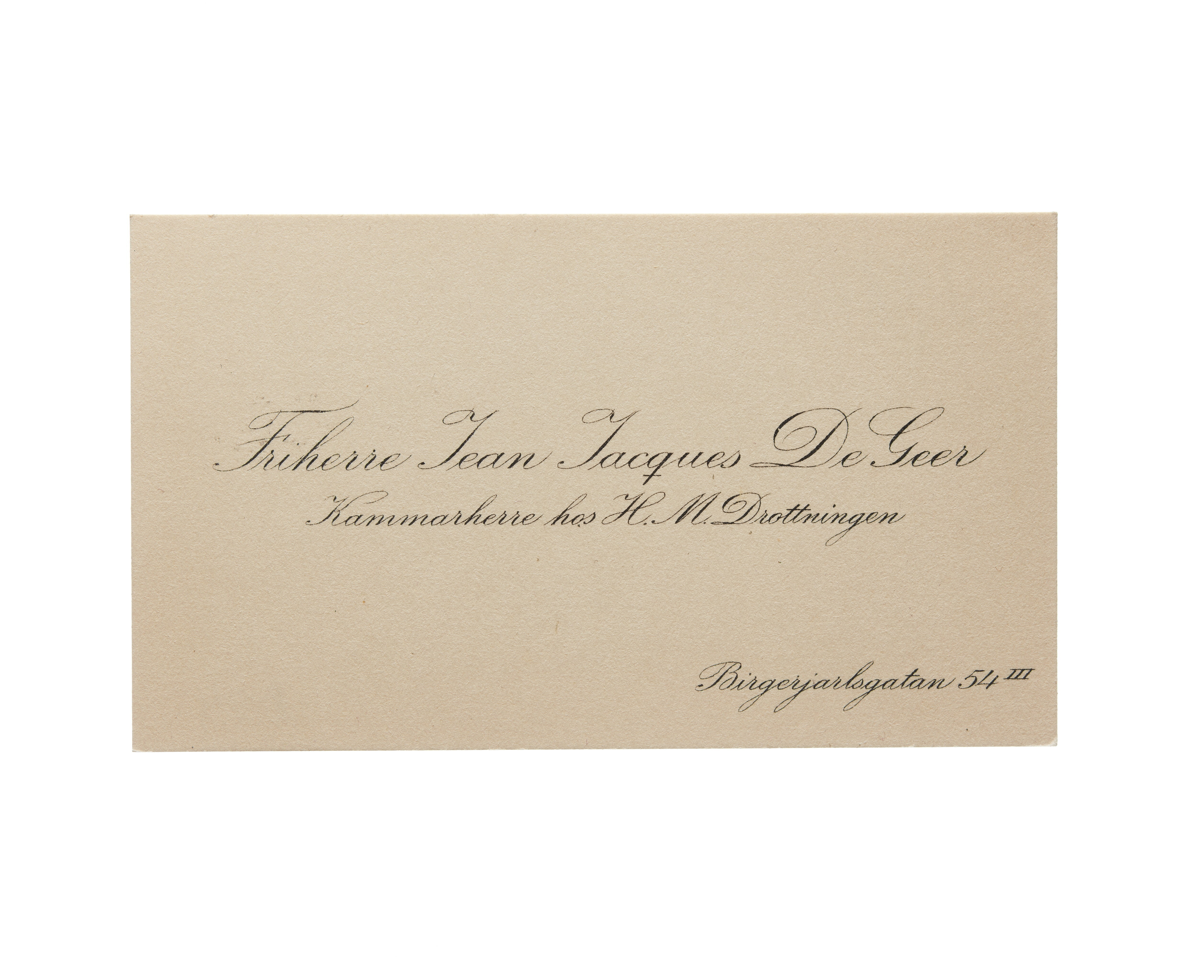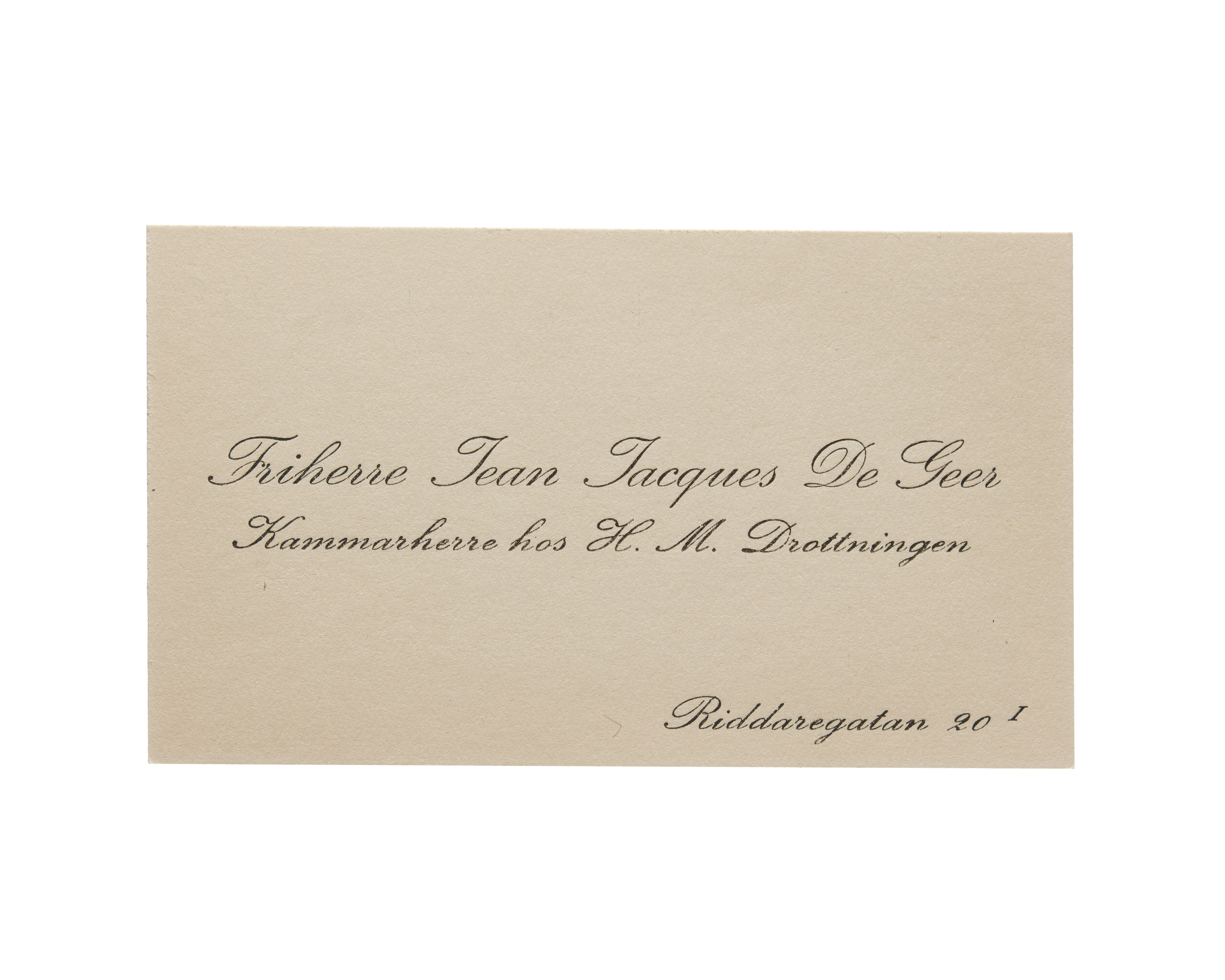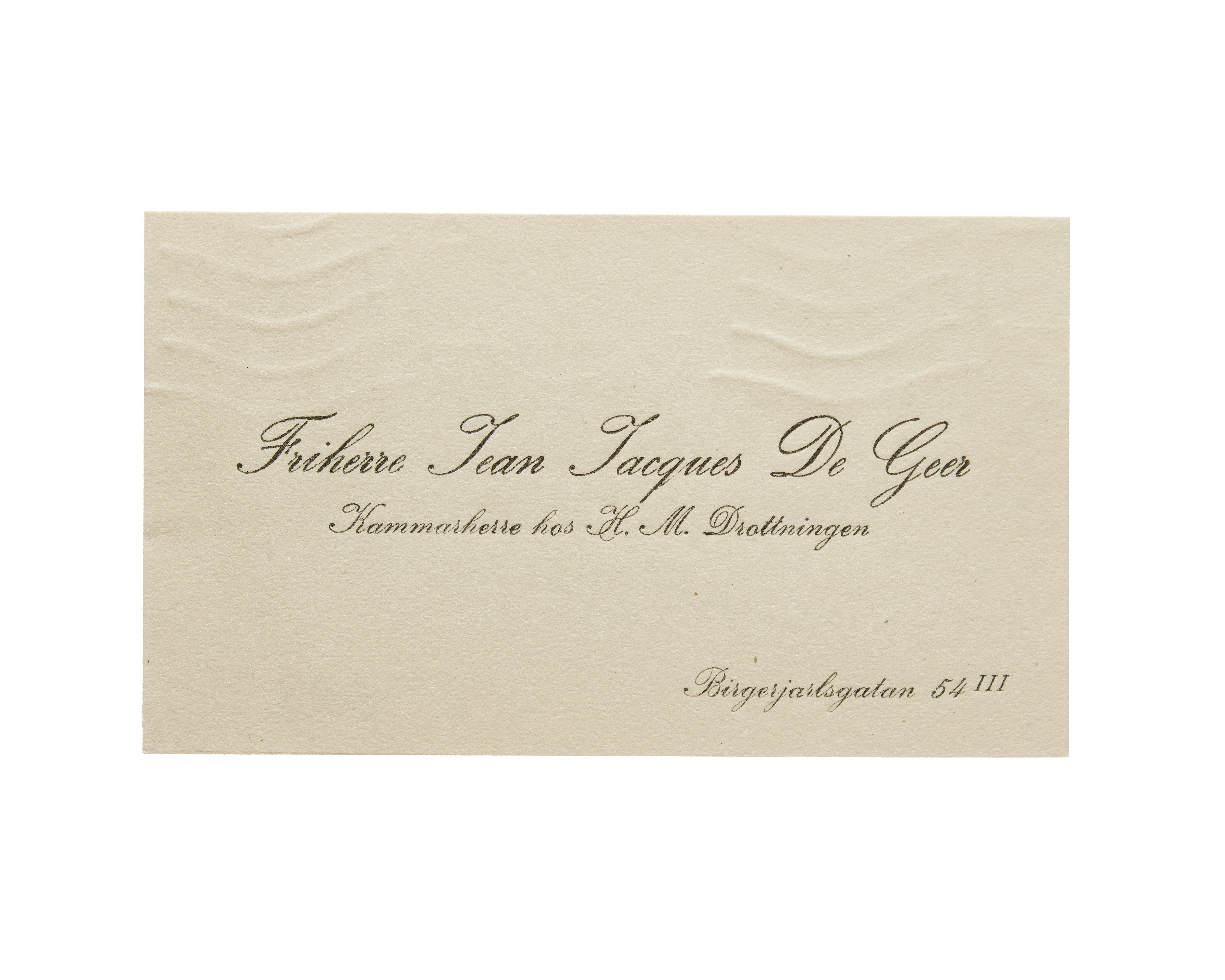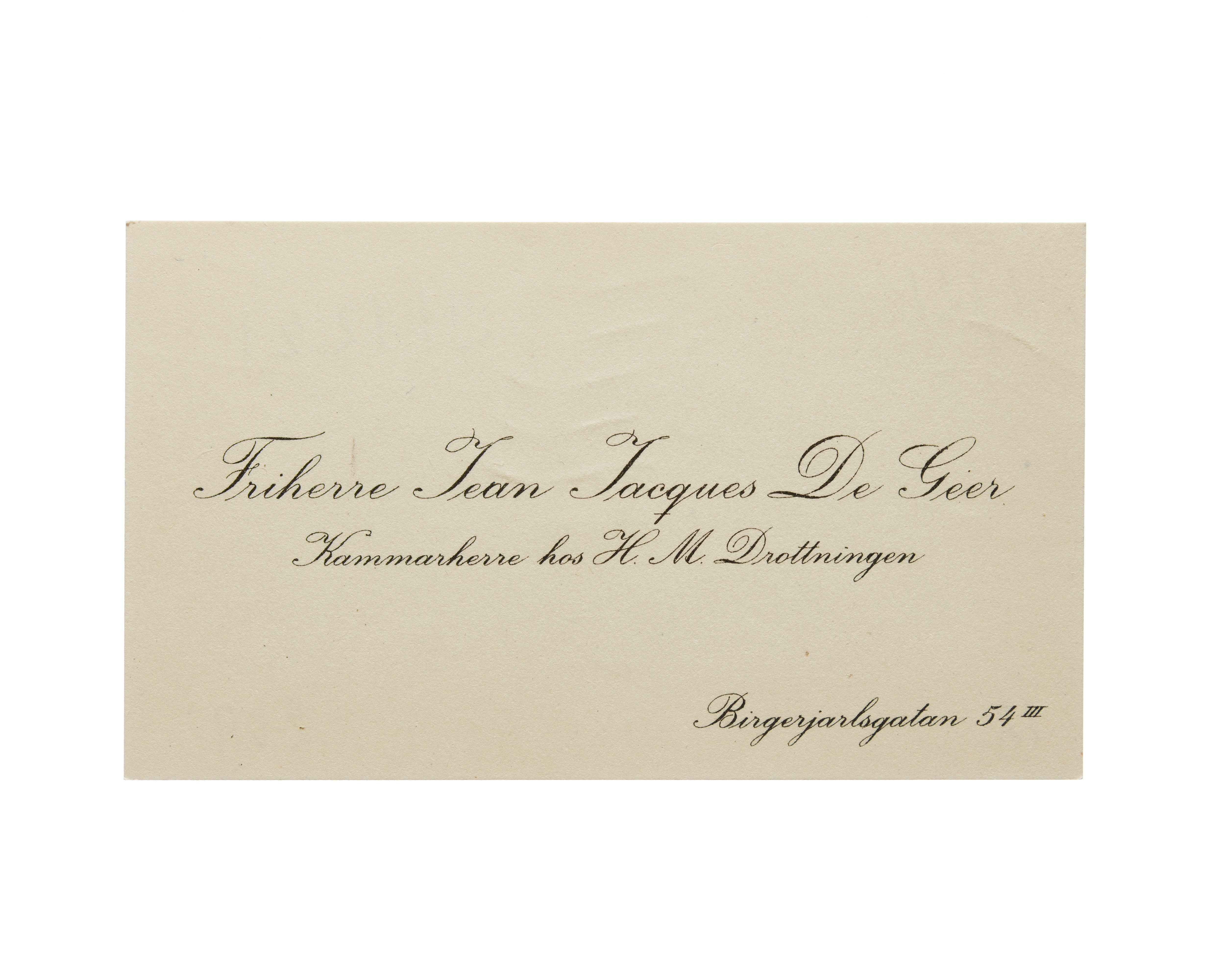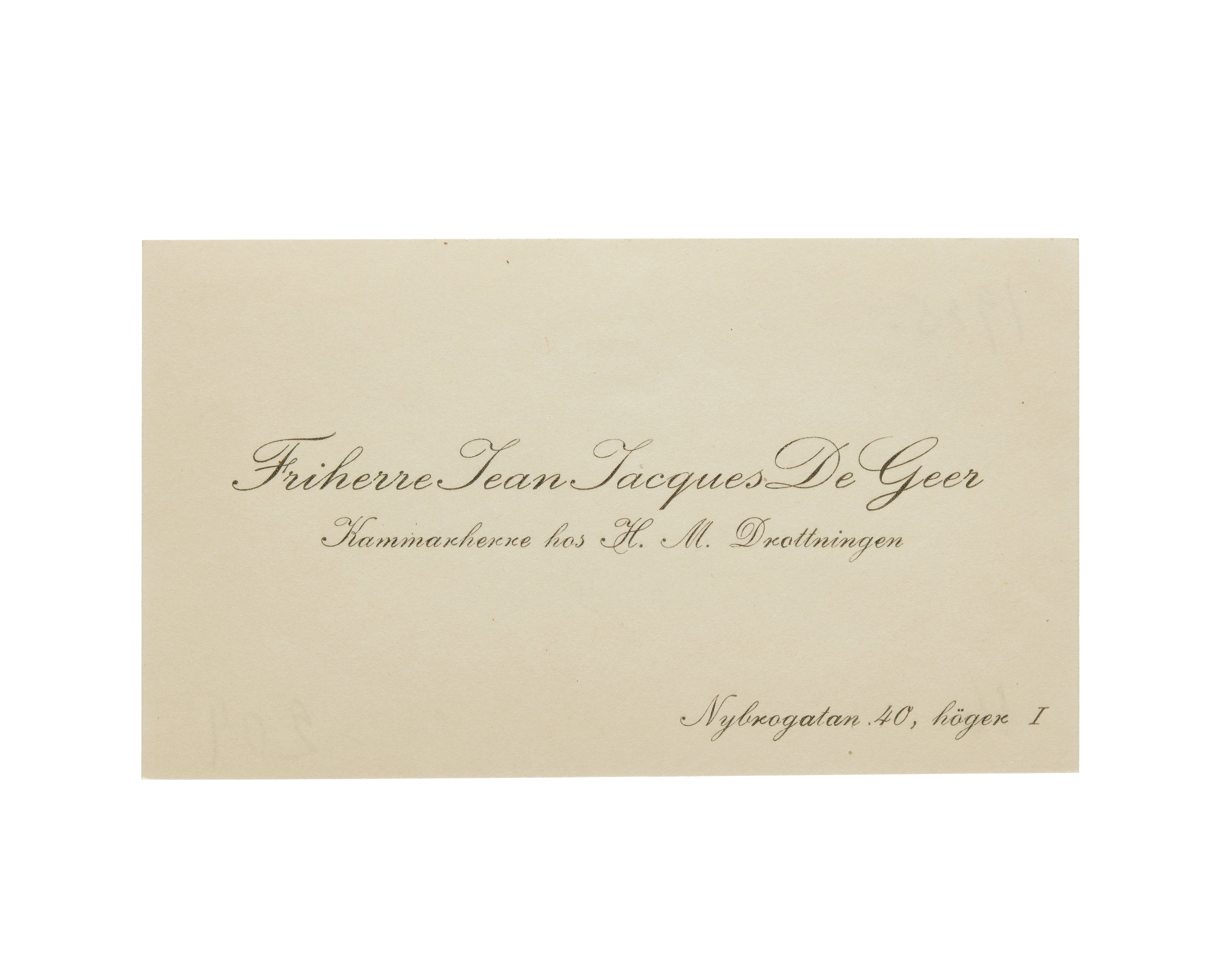 Visitkort från Friherre Jean Jacques De Geer, Kammarherre hos H. M. Drottningen.