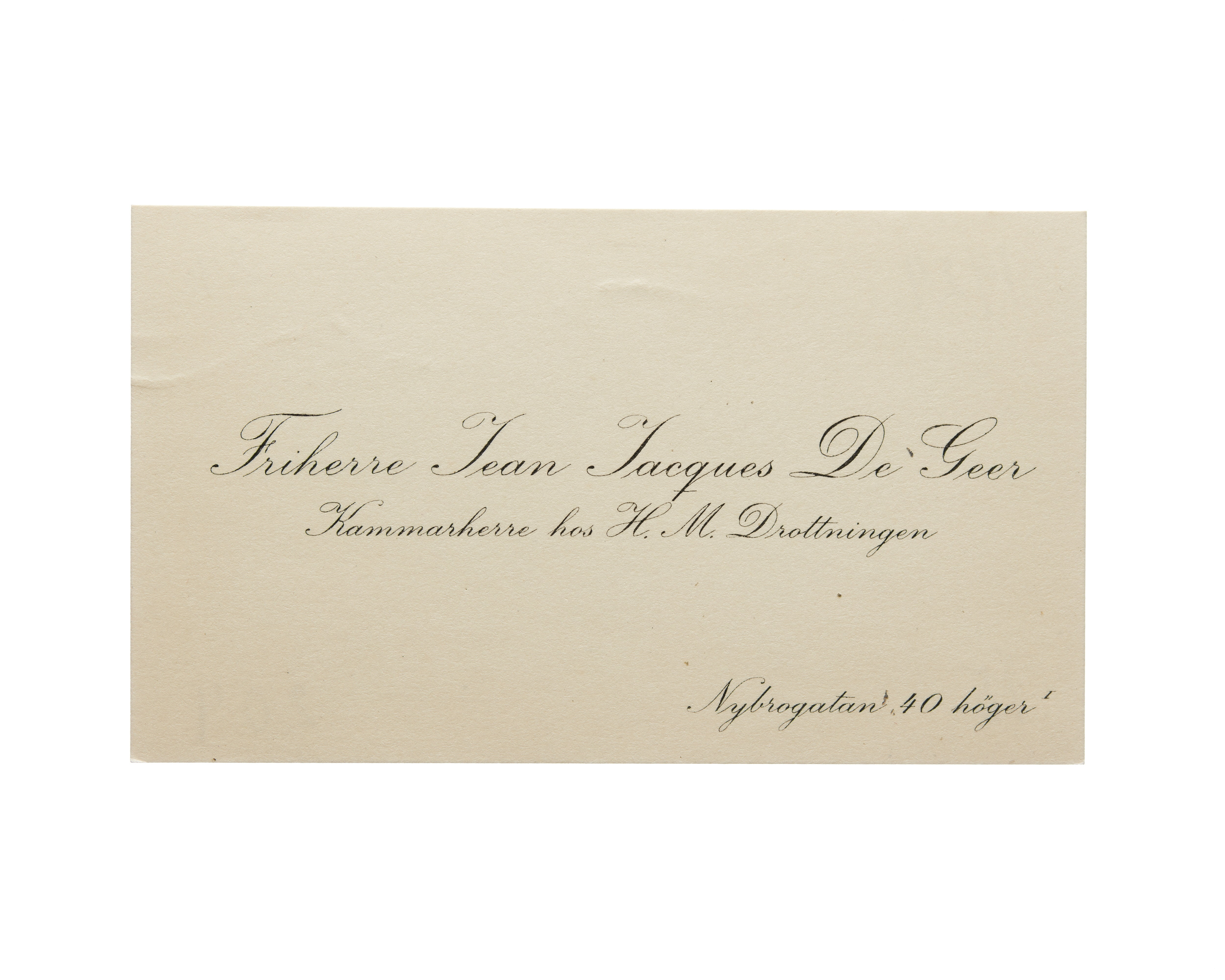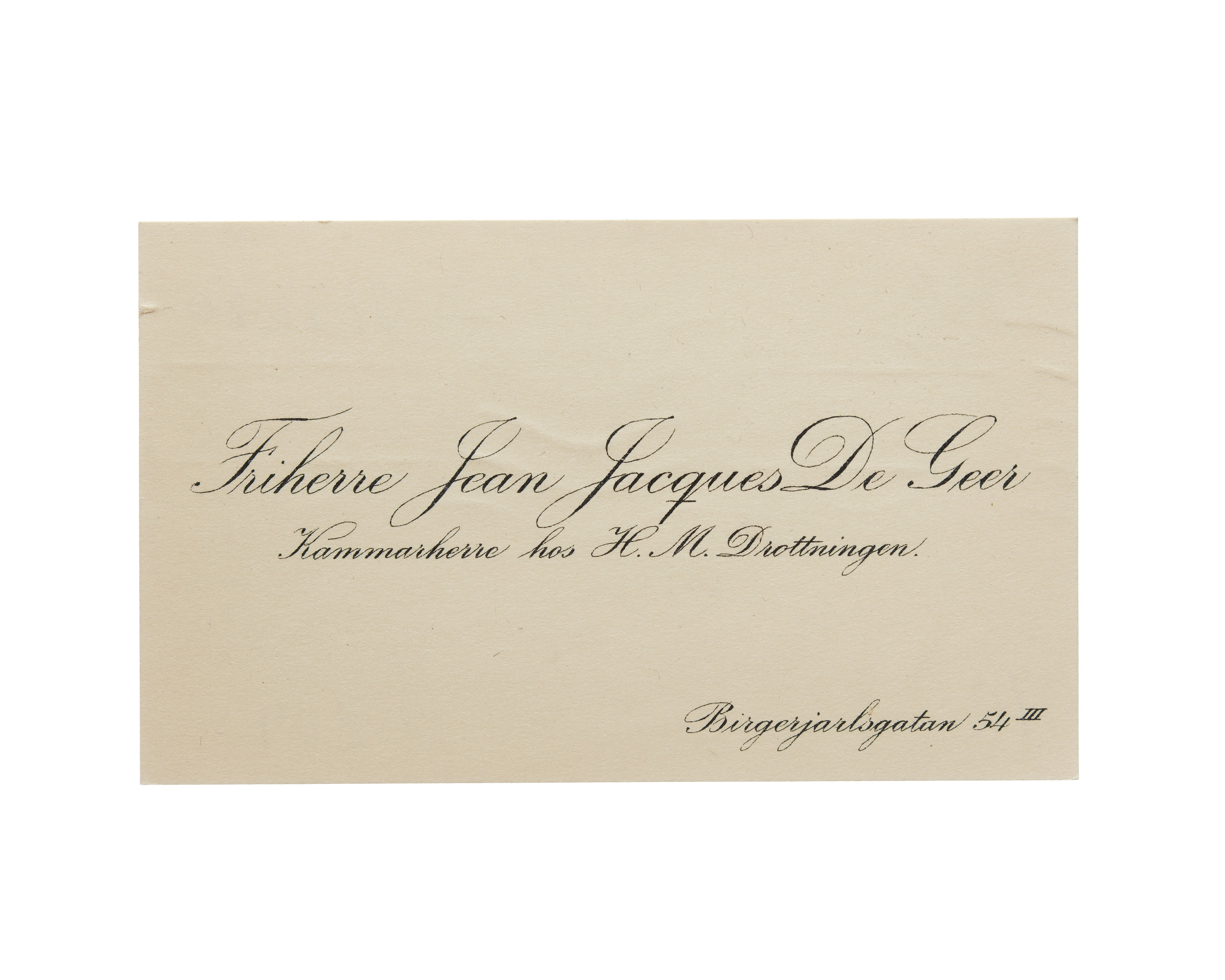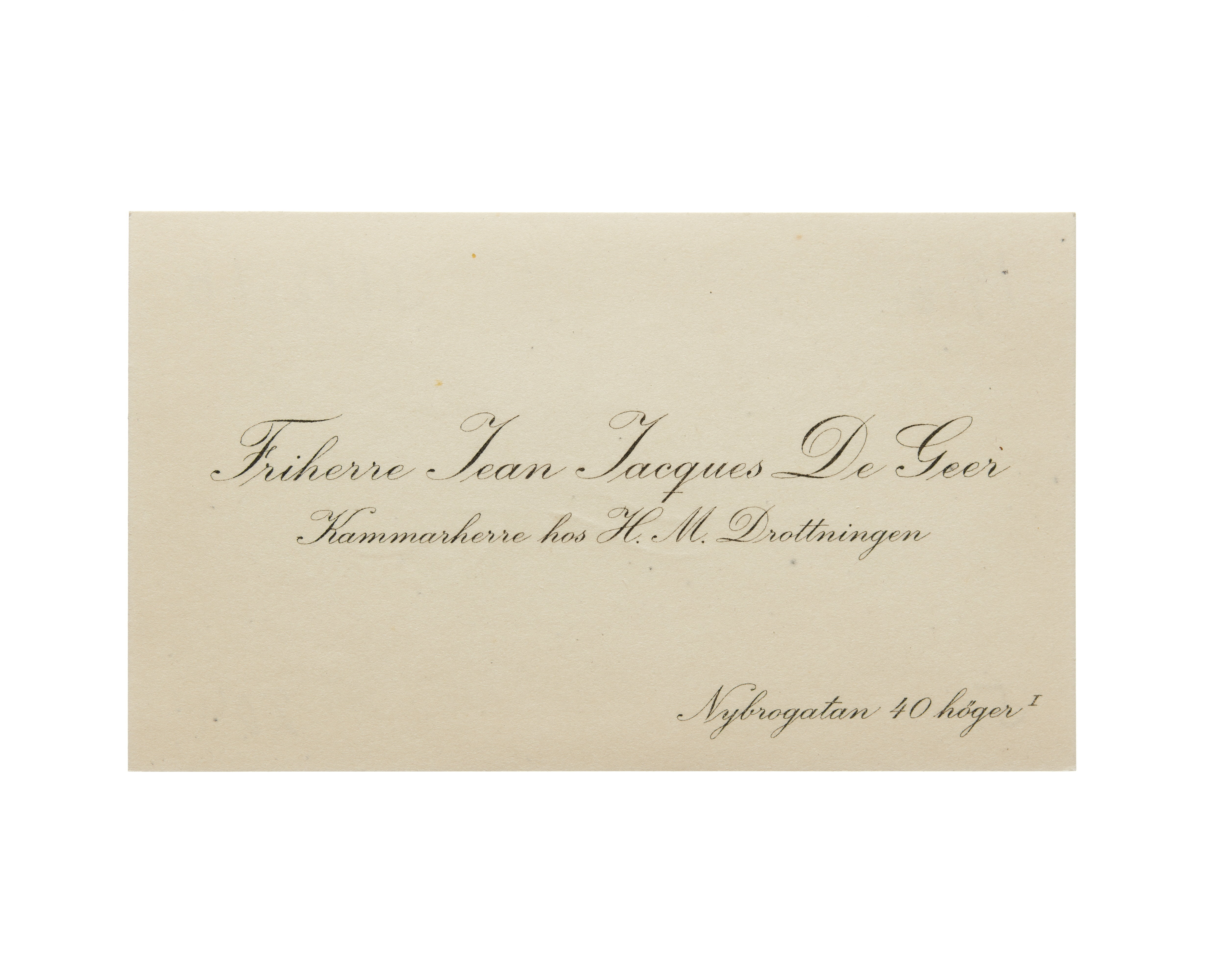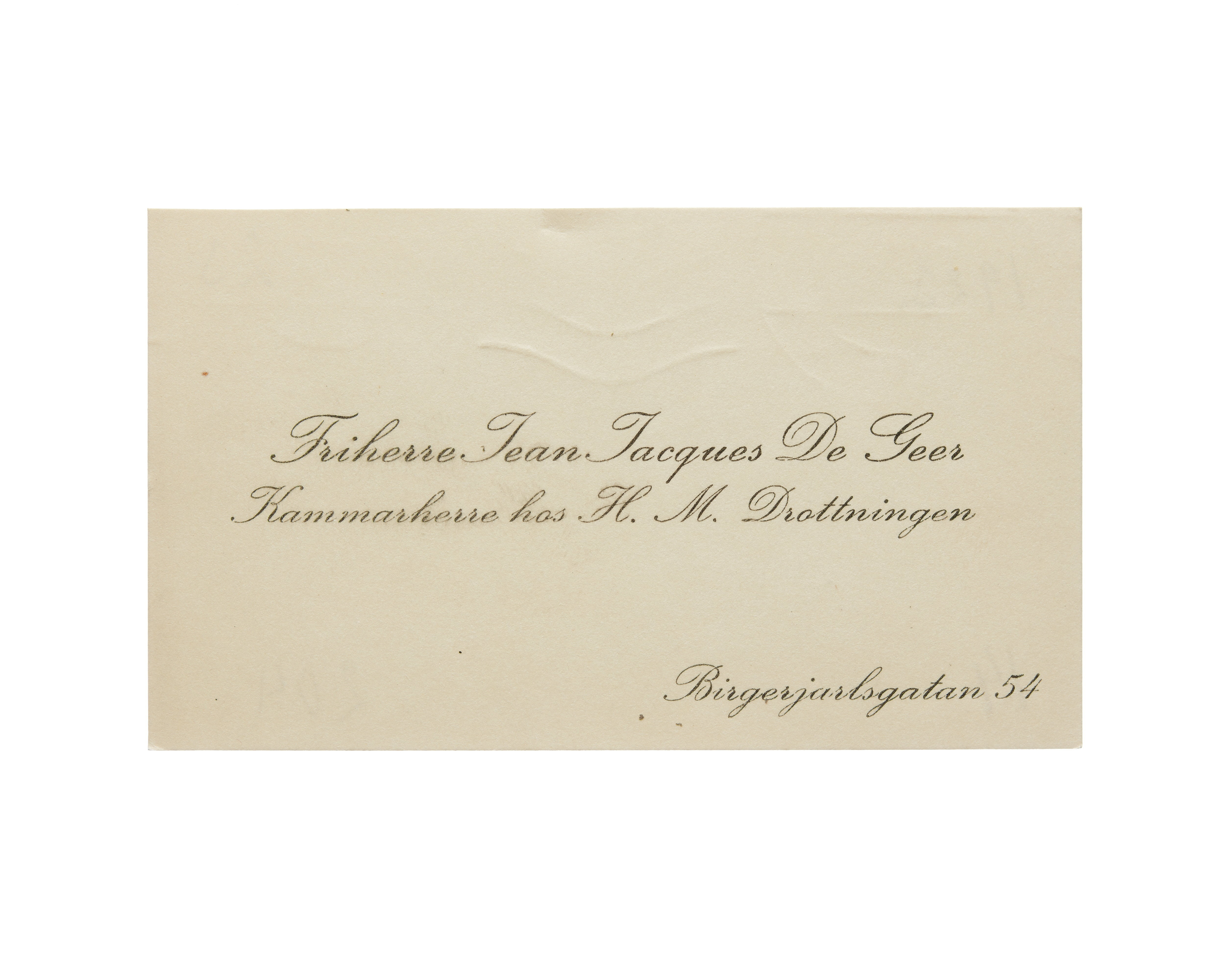Visitkort från Friherre Jean Jacques De Geer, Kammarherre hos H. M. Drottningen.