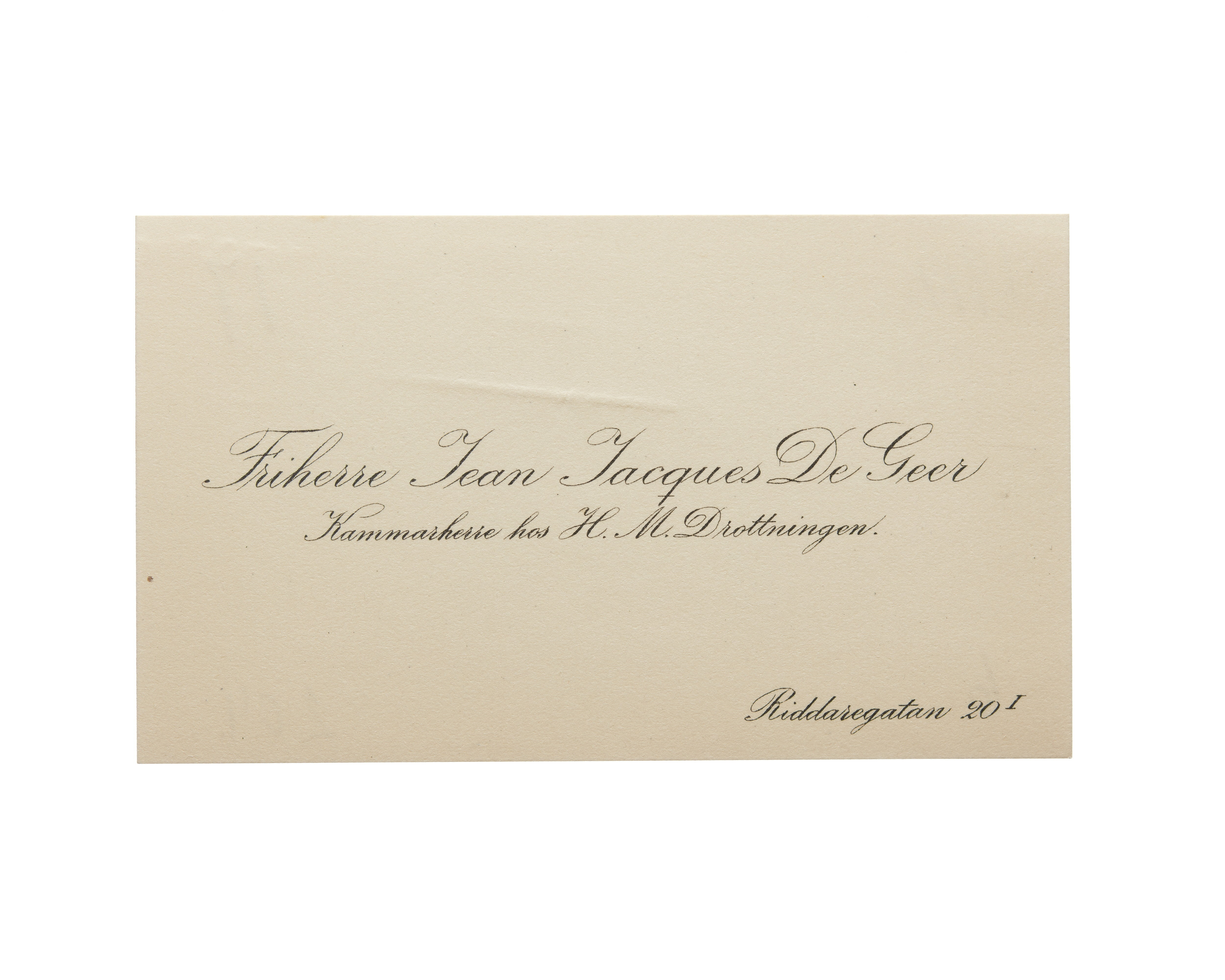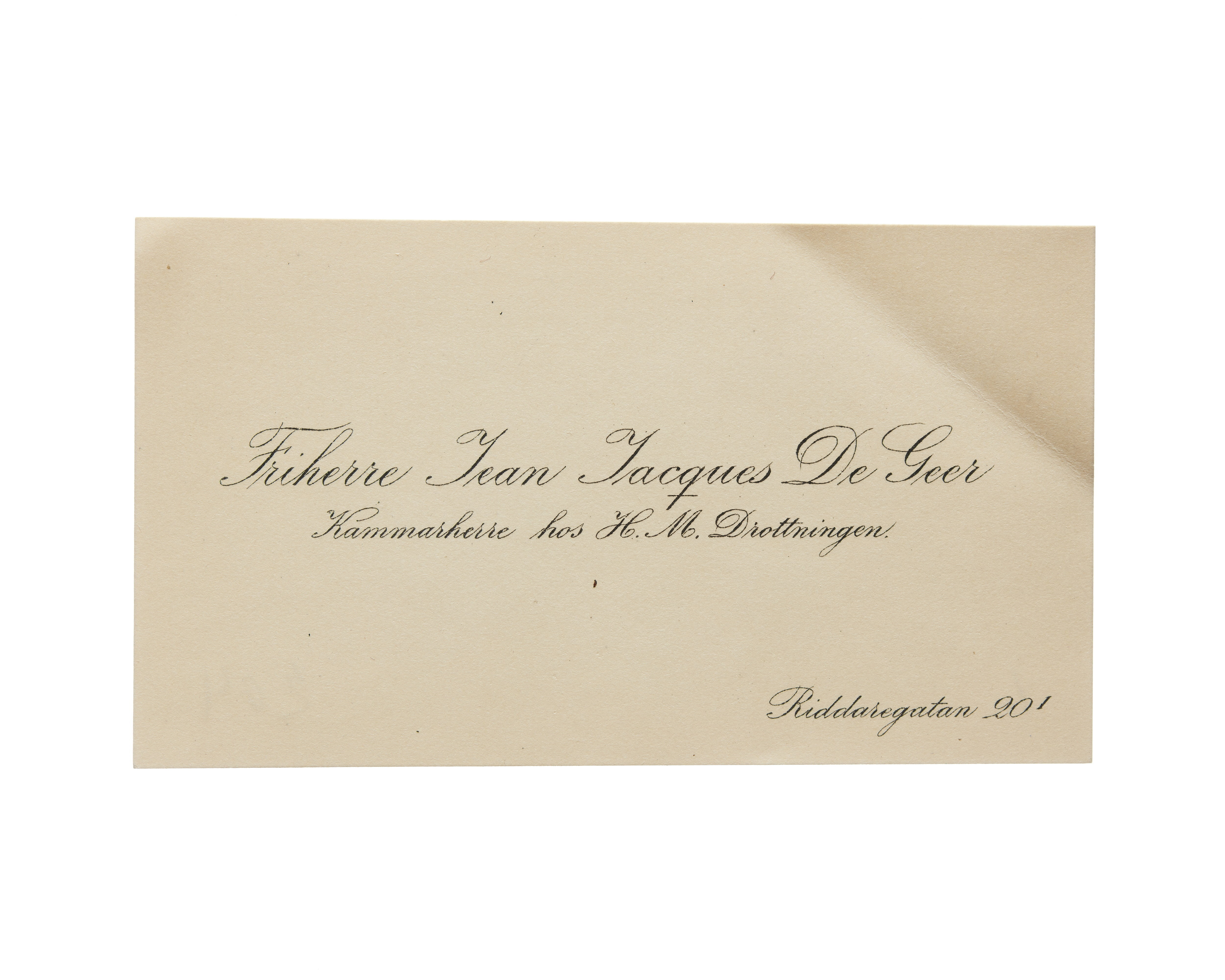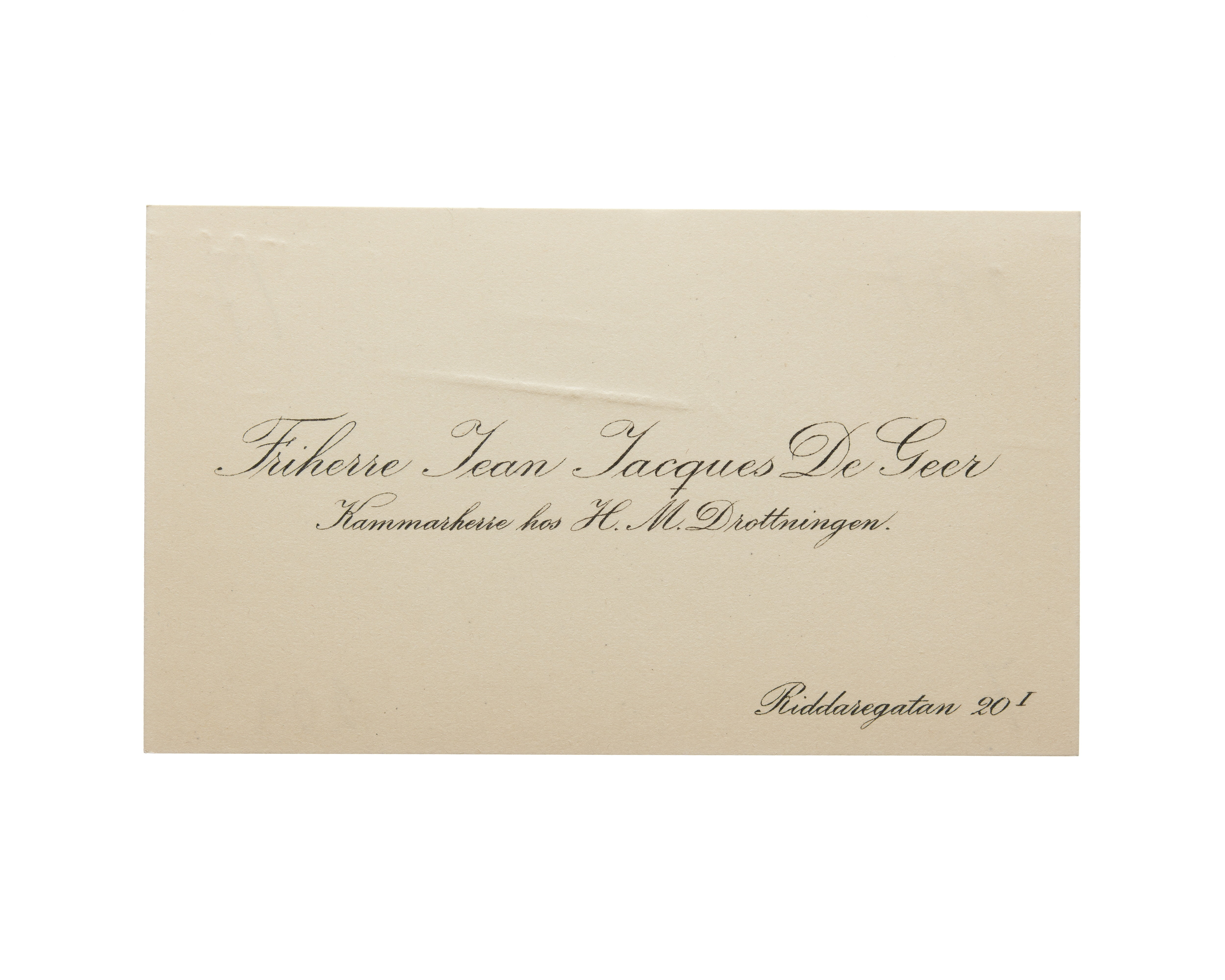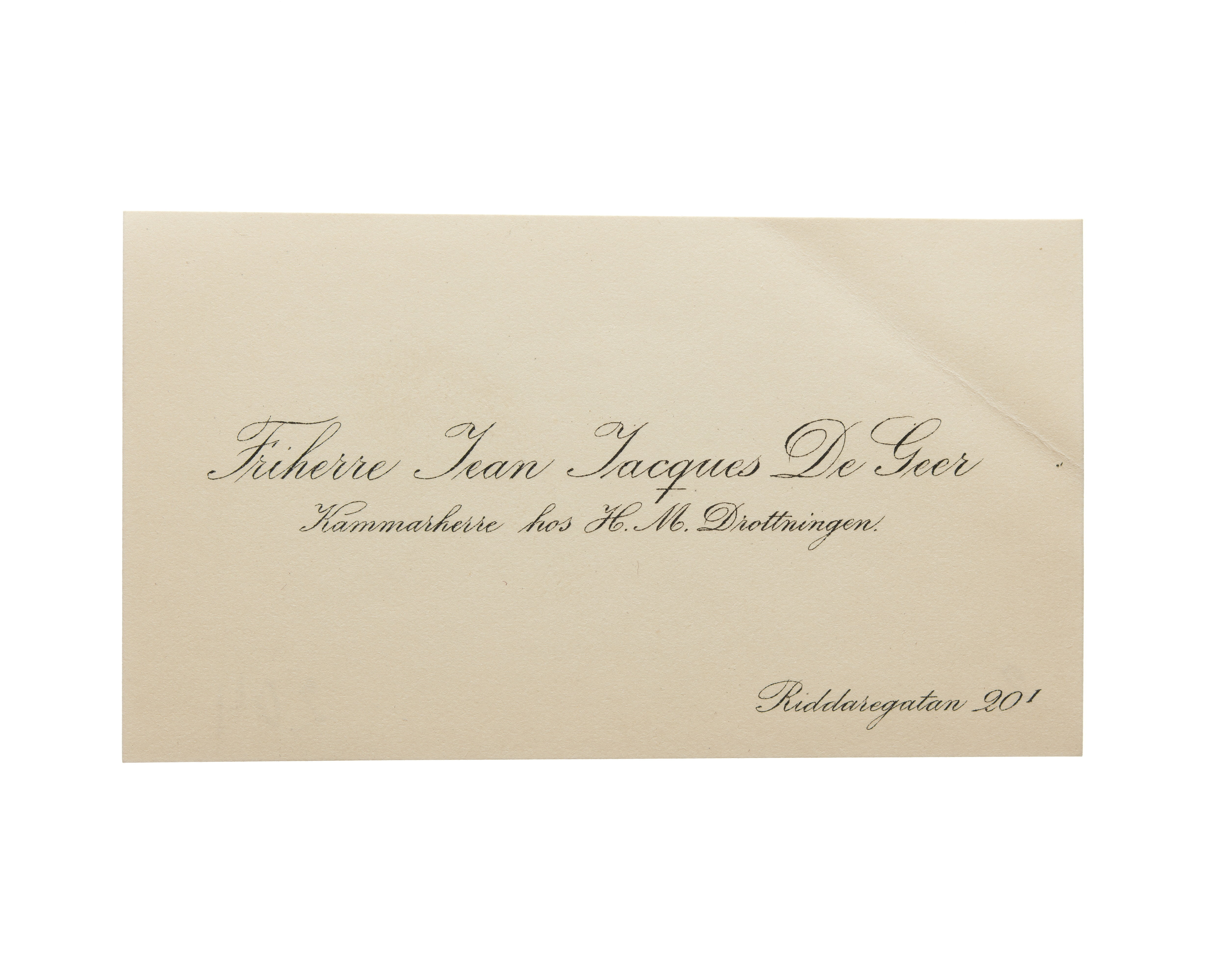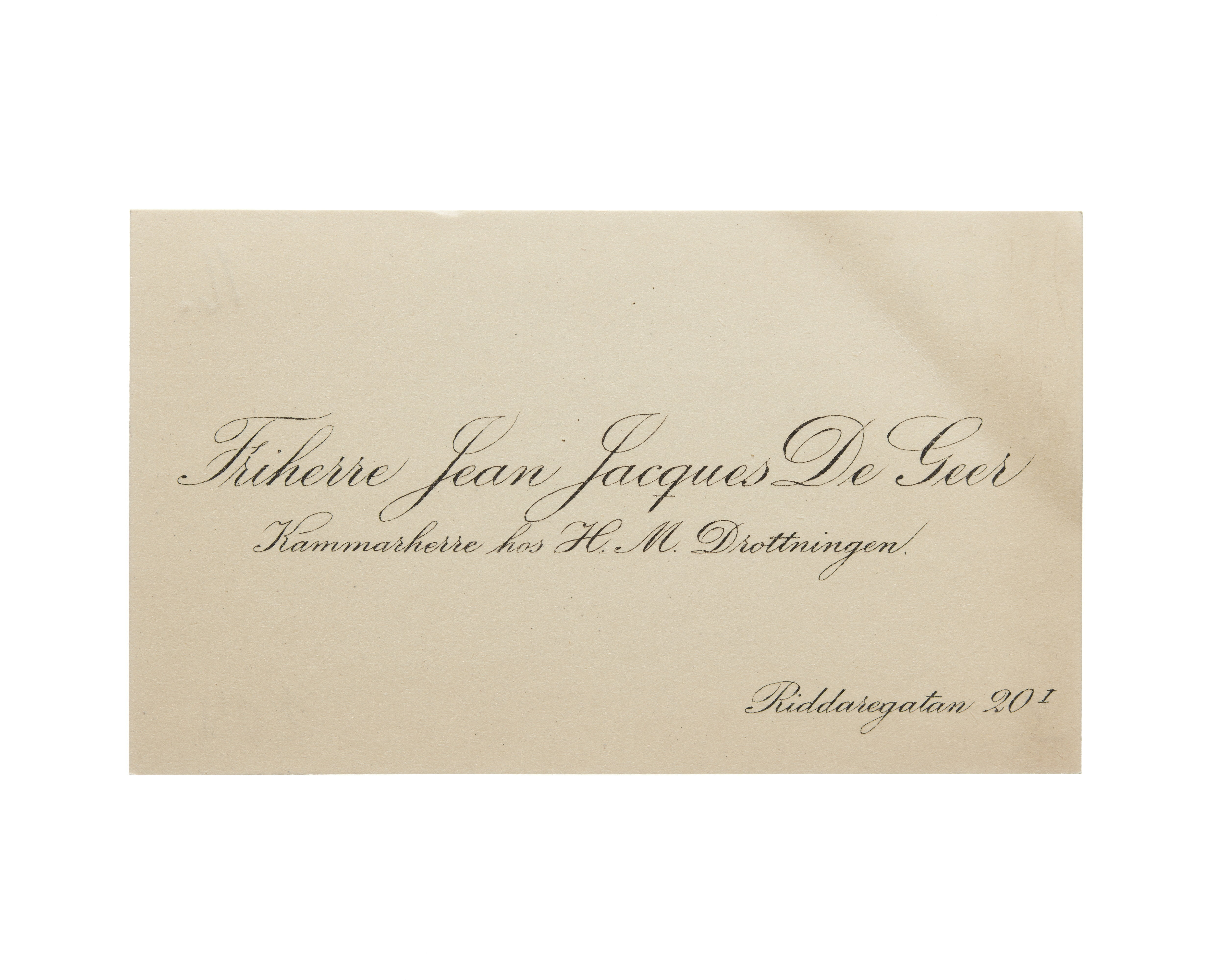 Visitkort från Friherre Jean Jacques De Geer, Kammarherre hos H. M. Drottningen.