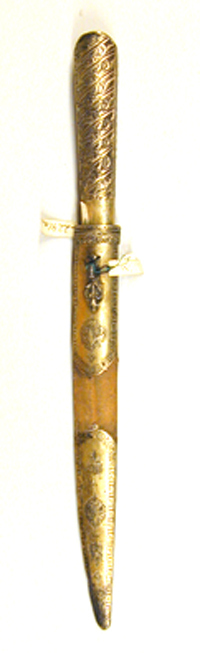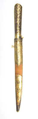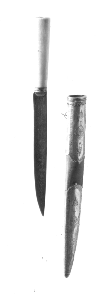 Slida klädd med ursprungligen röd sammet med beslag av förgyllt silver. Munbleck, l: 83 mm, doppsko, l:120 mm, båda med graverade blombårder runt kanten och blomornament mittpå. Beslag runt mynningen, på munblecket en fast bygel.