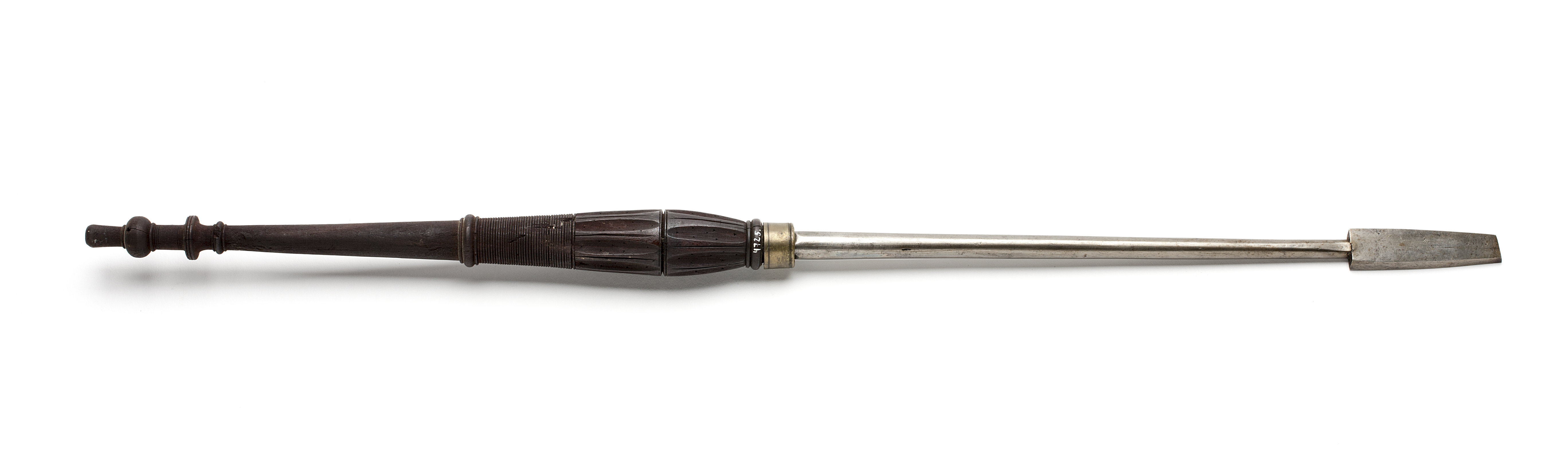 Rund klinga, i änden med romboid genomskärning. En främre egg och två sidoeggar. Svarvat, profilerat och kannelerat skaft av mahogny, ringen bortfallen.
