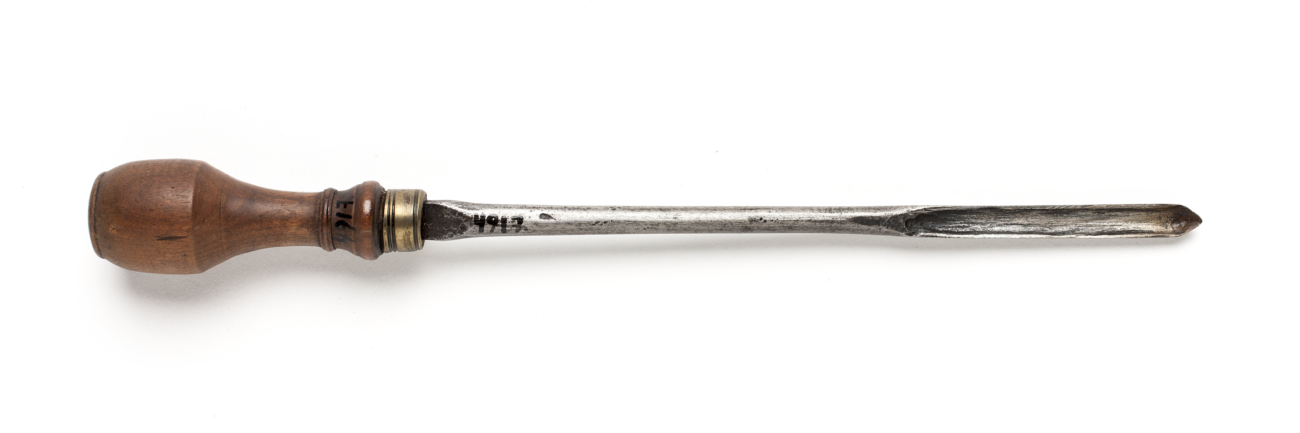 Rund klinga. Svarvat, flaskformat skaft av päronträ. Mässingsring.