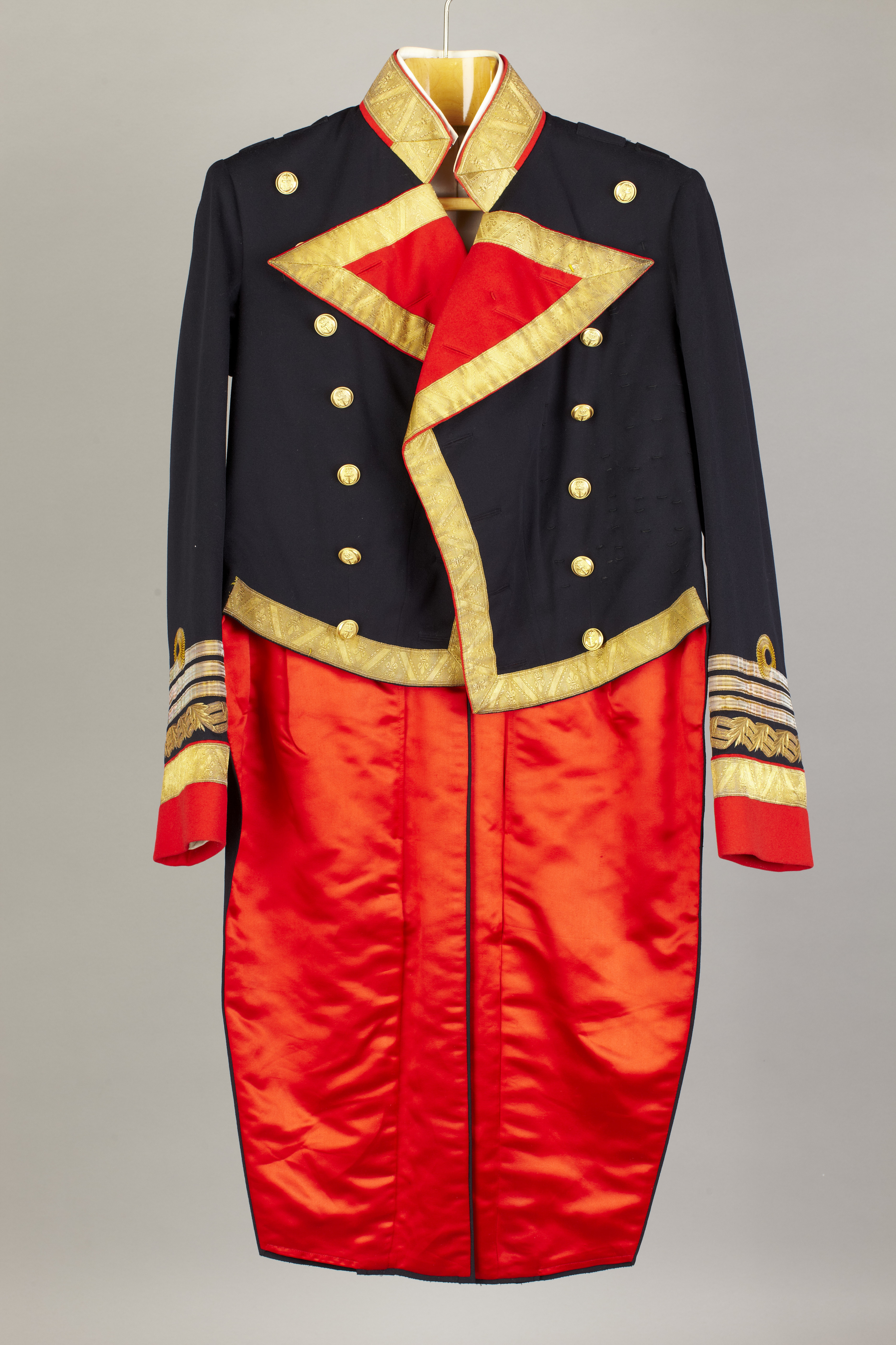 Frack av mörkblått kläde med ståndkrage och slag av rött kläde med två häkten. Utefter kragens kanter mönstervävd guldgalon, b: 49 mm, med franska liljor och sick-sack band. Utefter slagens och framsidans kanter, både in och utvändigt, guldgalon, b: 35mm, mönstervävd som föregående. Dubbelknäppt om sju välvda välvda, förgyllda knappar, d: 21 mm, med i relief ett krönt ankare i ett"O". Tränsar på bröstet, hällor på axlarna. Ärmar med slag av rött kläde, b: 93 mm, kantat med mönstervävd guldgalon, b: 35 mm. Ärmspel med tre guldgaloner, b: 14 mm, varav den översta med ögla, samt därnedanför en rad lagerblad med tredubbla stolpar emellan i guldbroderi, b: 30 mm. På skjörten spetsiga ficklock med tre knapphål av svarta beläggningssnören av silke samt med tre knappar, som föregående. I skjörtvecken en knapp i midjesömmen och en en bit ner, båda som föregående. Foder av vitt siden i skjörten av röd sidenatlas. I kragen järnknappar för löskrage och en vit sidenetikett som hälla och firmamärke: "ALBERTO RANZ // Sastre de la Real Casa // Madrid". Vaddering under ärmhållorna med spiralstickning. På h. sidan av fodret i livet två vita knappar, d: 17 mm, märkta "A. RANZ // MADRID".