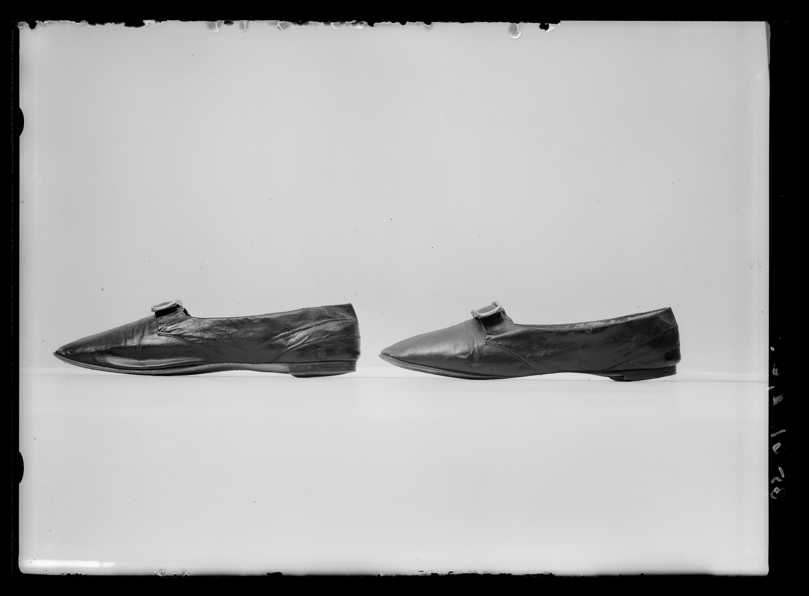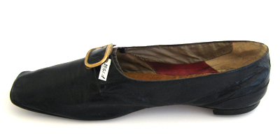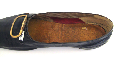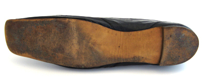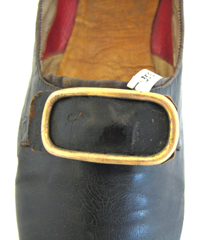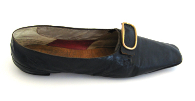 Låg sko, höger, av svart vaxläder med en vid öppning och med en rakt skuren tå. Öppningen kantas av en 1-2 mm bred svart linnekant på sidorna och av en 4 mm bred svart linnekant fram. Skon är sydd med sidsömmar fram och en söm bak runtom hälen. Mitt fram på ovanlädret sitter ett rektangulärt mässingsspänne på en svart läderbit. Vid öppningen mitt fram skjuter fram en 4 mm bred kant av svart linne. Klack och sula är av svart pressat skinn. Klacken är låg, 10 mm hög, 62 mm bred och 60 mm lång. Sulan är tunn, 2 mm tjock och med en bredaste bredd på 76 mm. Skon är på insidan vid tån fodrad med naturfärgat linnetyg. På sidorna är den upptill fodrad med vitt siden och nertill med rött läder. Baktill är den fodrad med vitt skinn. Innersulan är av brunt läder.