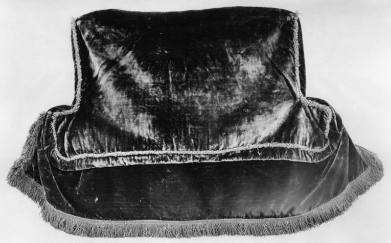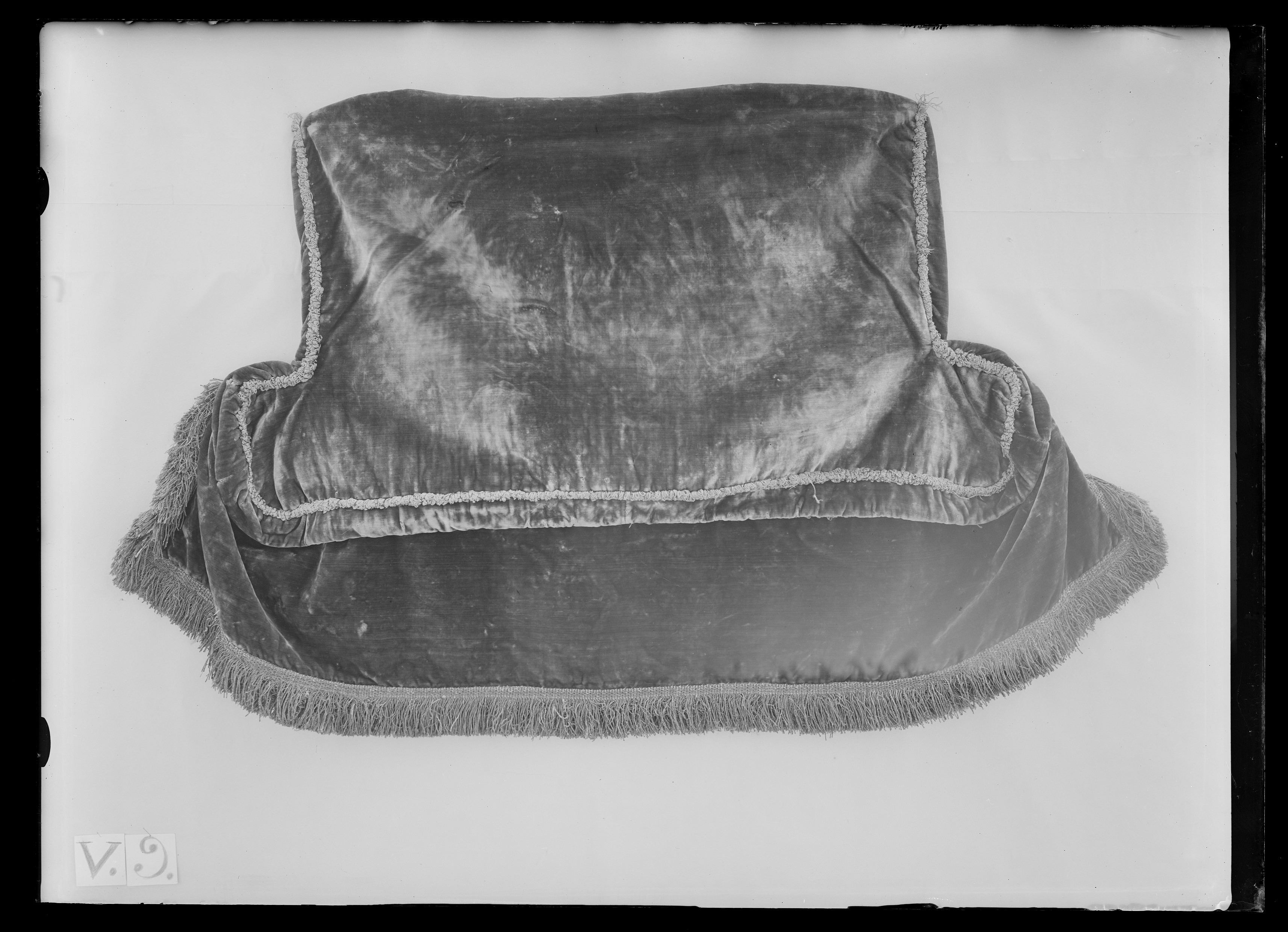 Överplatta, botten och nedhängande kappa av grön sammet. Underplatta av ljusbrunt läder. Dynan inuti fodrad med gles tuskaftsväv av hampa. Nedhängande kappan fodrad med blått, glättat linne. Längs bottnens sömmar, ej mot lädret, en oklippt 10 mm bred frans av ljusgrönt silke. Längs nedhängande kappans sidor och nederkant en 55 mm bred frans i två lager, det undre av grönt silke, det övre av silver med 12 mm bred stad. Stadkant gulbrunrandig i överplattans överkant.