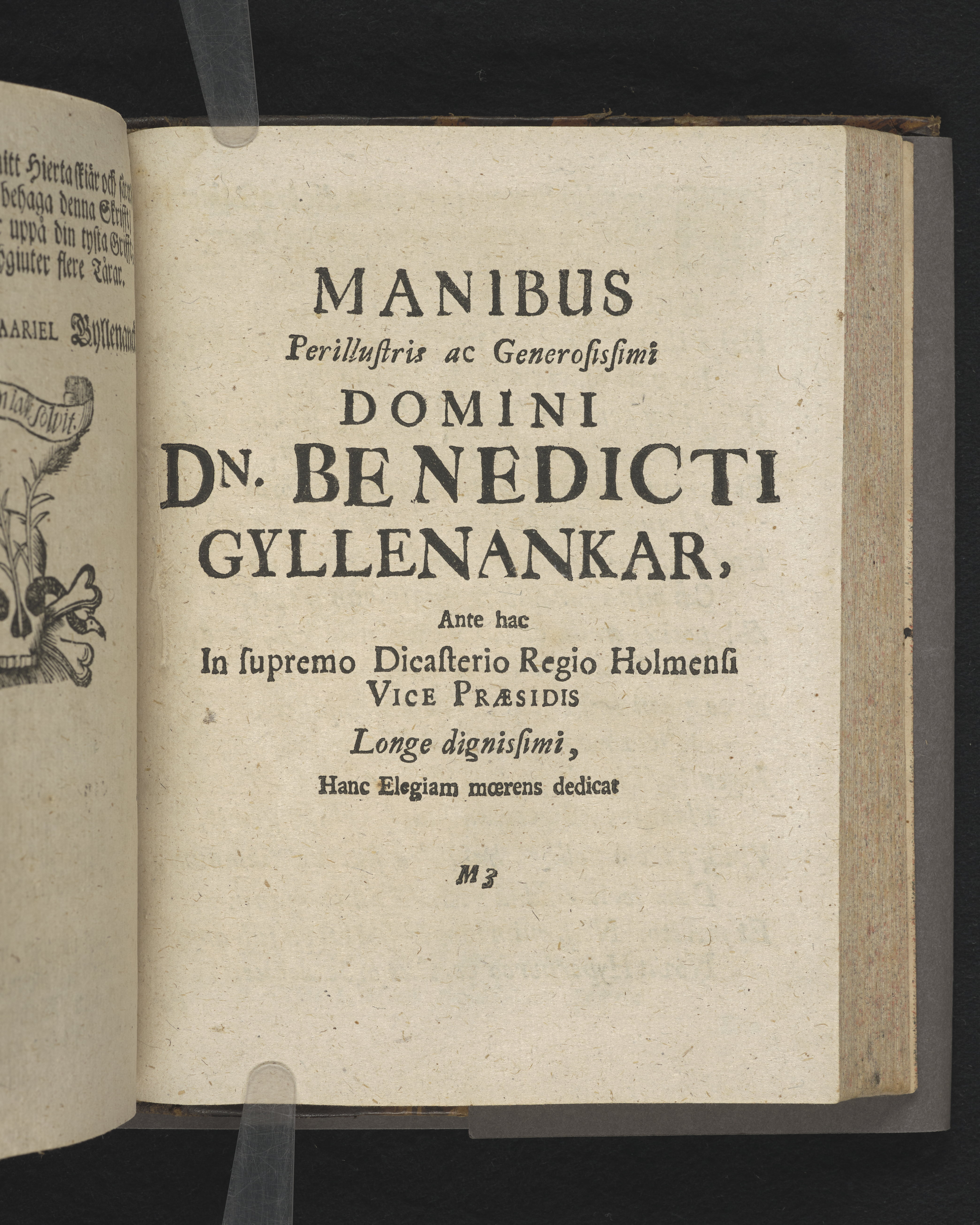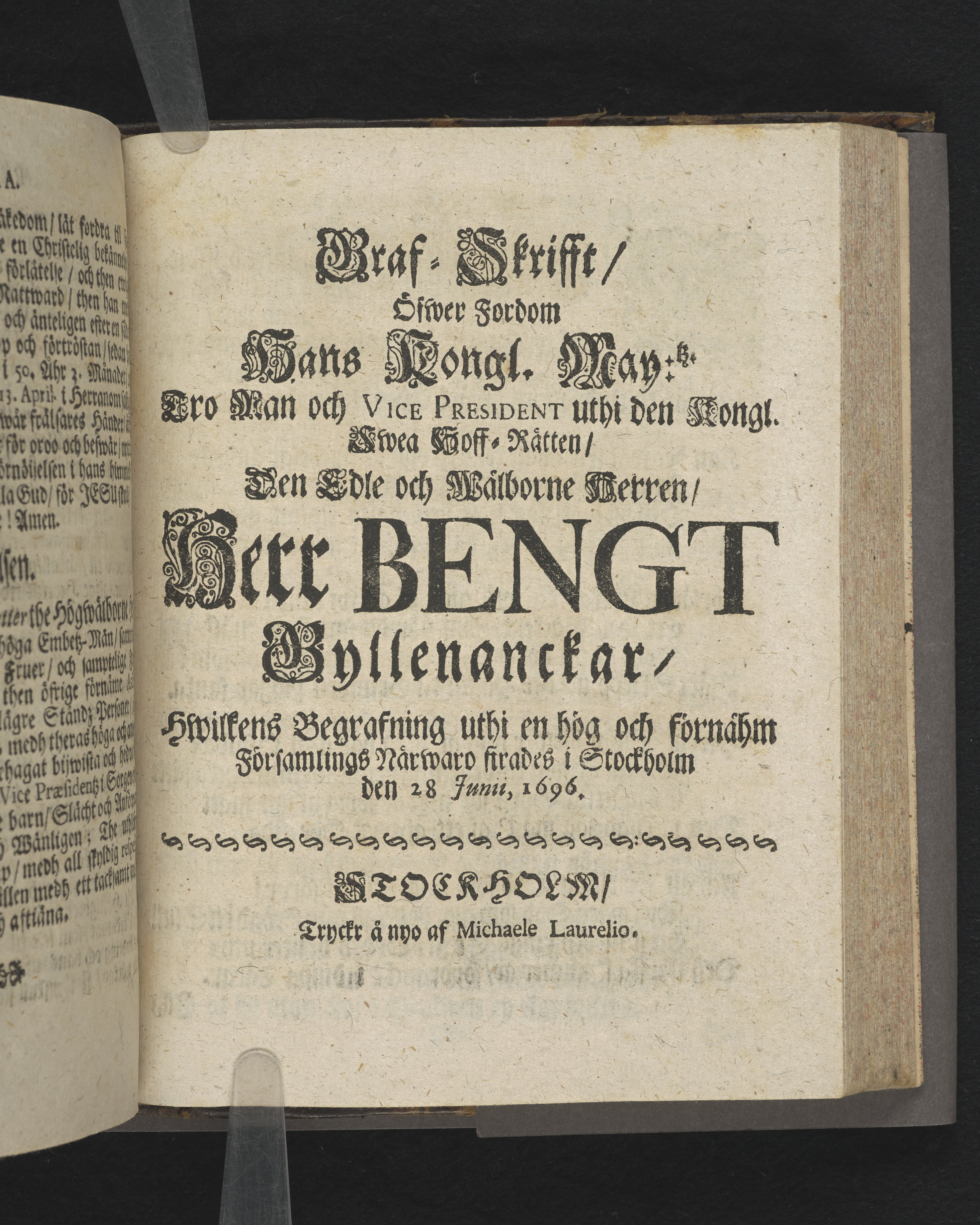 Graf-skrifft, öfwer fordom hans kongl. May:tz tro man och vice president uthi den kongl. Swea hoff-rätten, den edle och wälborne herren, Herr Bengt Gyllenanckar, hwilkens begrafning uthi en hög och förnähm församlings närvaro firades i Stockholm den 28 junii, 1696. Stockholm, tryckt å nyo af Michaele Laurelio.