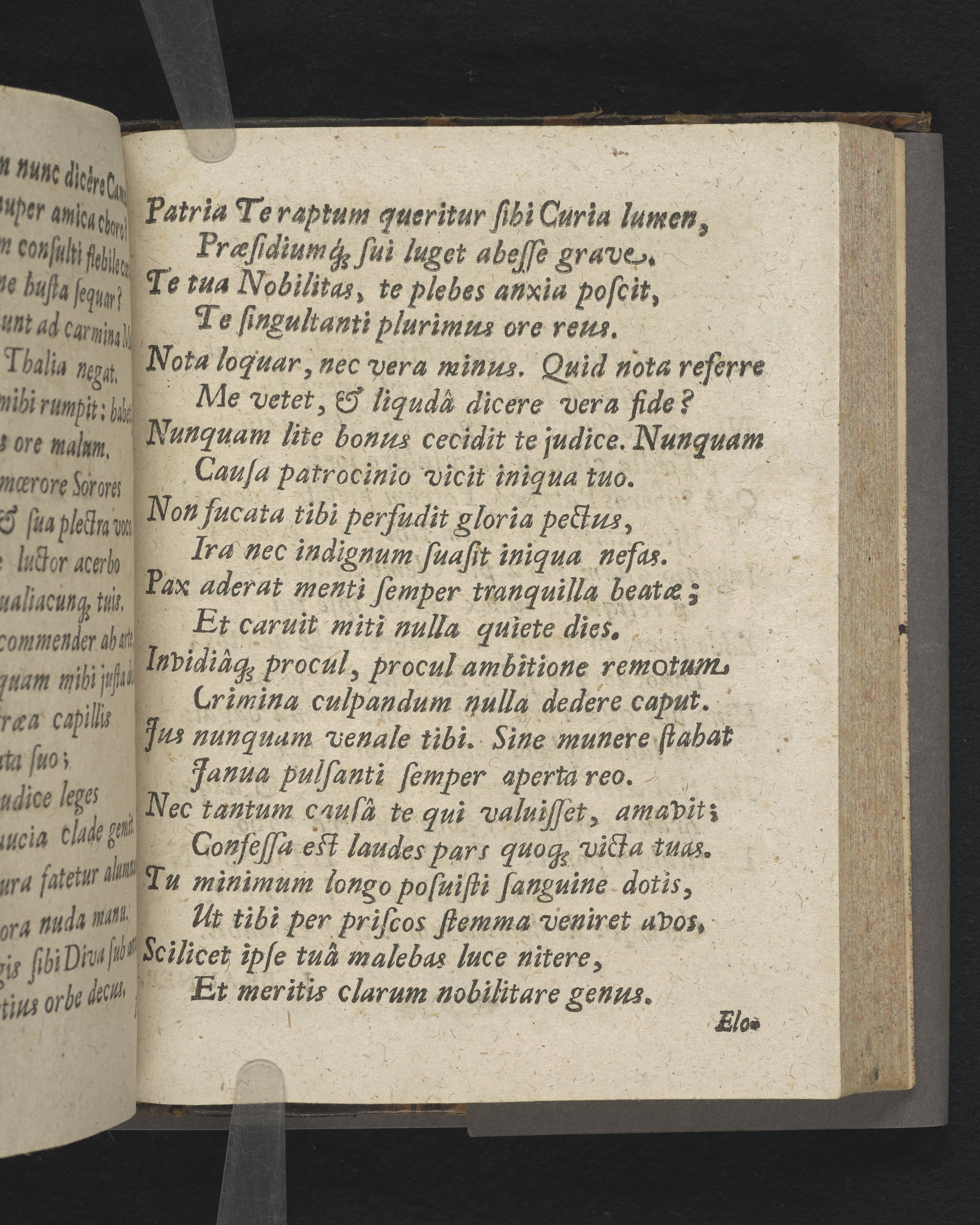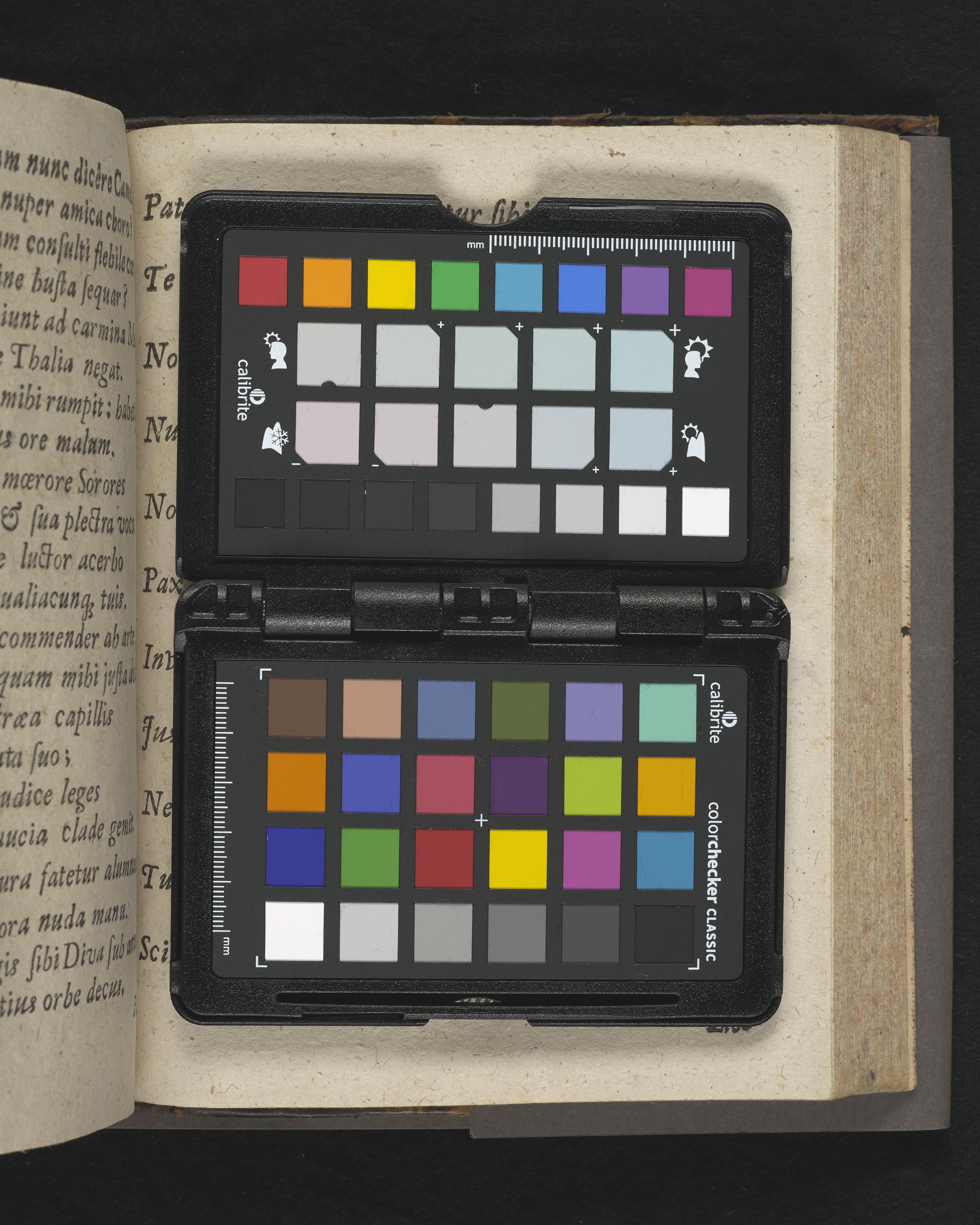 Band med rygg och hörn av fårskinn, pärmarna klädda av stänkfärgat svartbrunt papper. Fast rygg. Pärmfyllnad: papp. Röd- och blåstänkt snitt. Inlagan består av 11 skrifter tryckta på olika papperskvaliteter. Snitten är skurna och stänkfärgade i blått och rött. Stickade kapitäl.