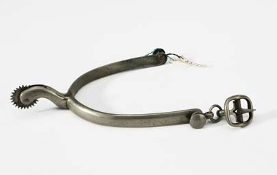 Sporre av förnicklat stål med u-formade skänklar 32 mm lång, svagt uppåtböjd s-formad hals med fintandad klinga. I skänklarns ändar, rund, plan knapp på hals, vid den ena rektangulär remsölja fästad med två länkar och en ring.