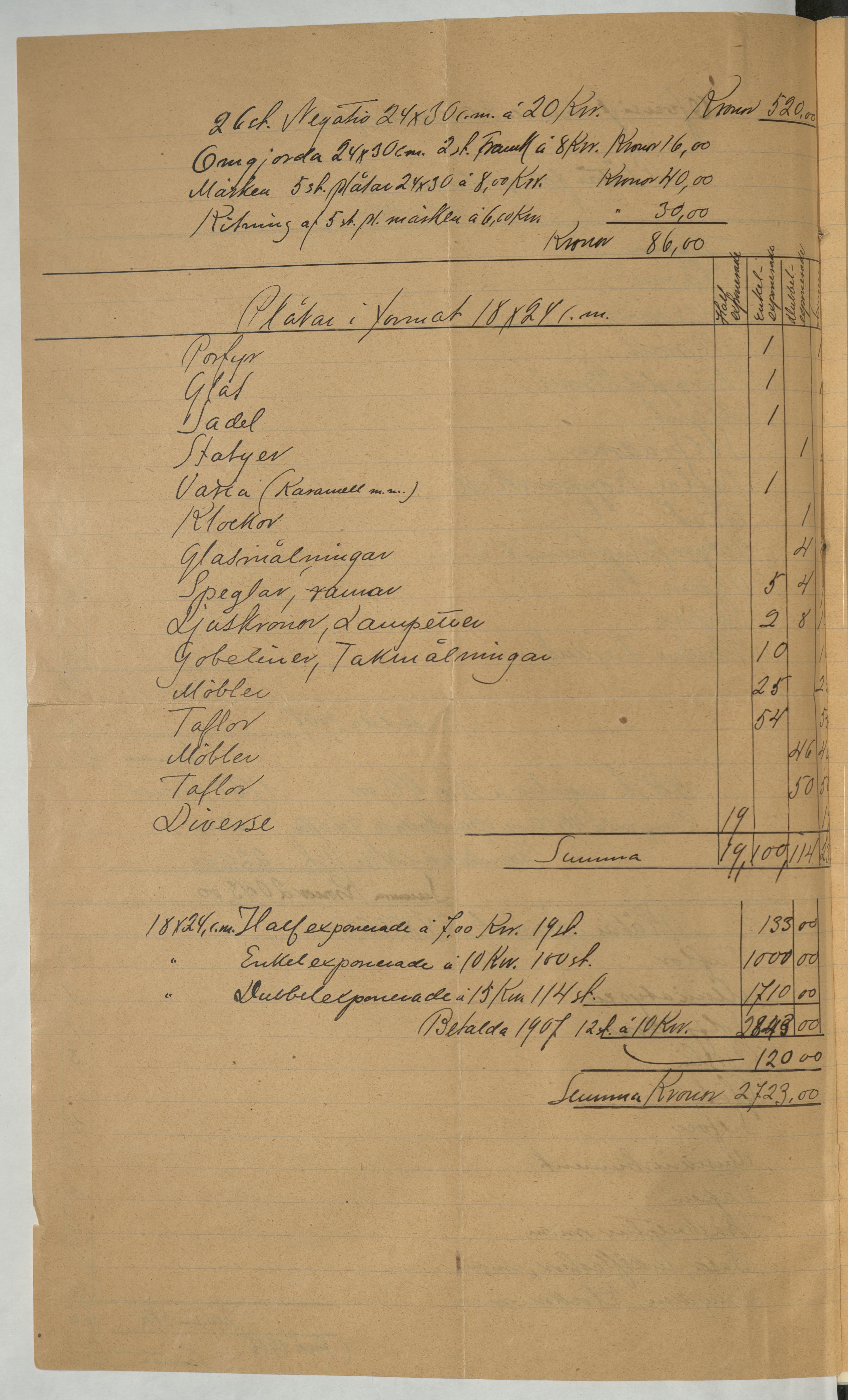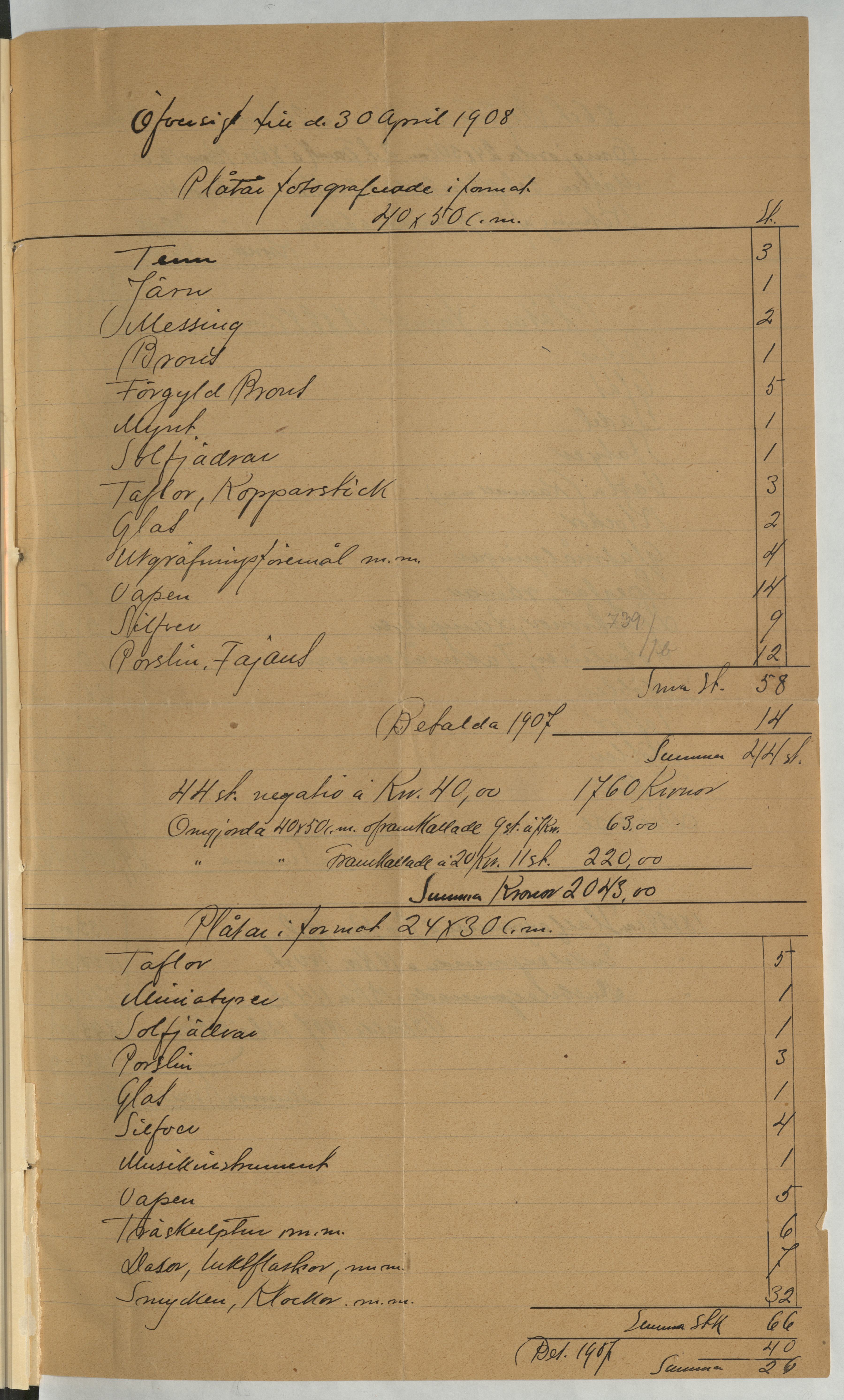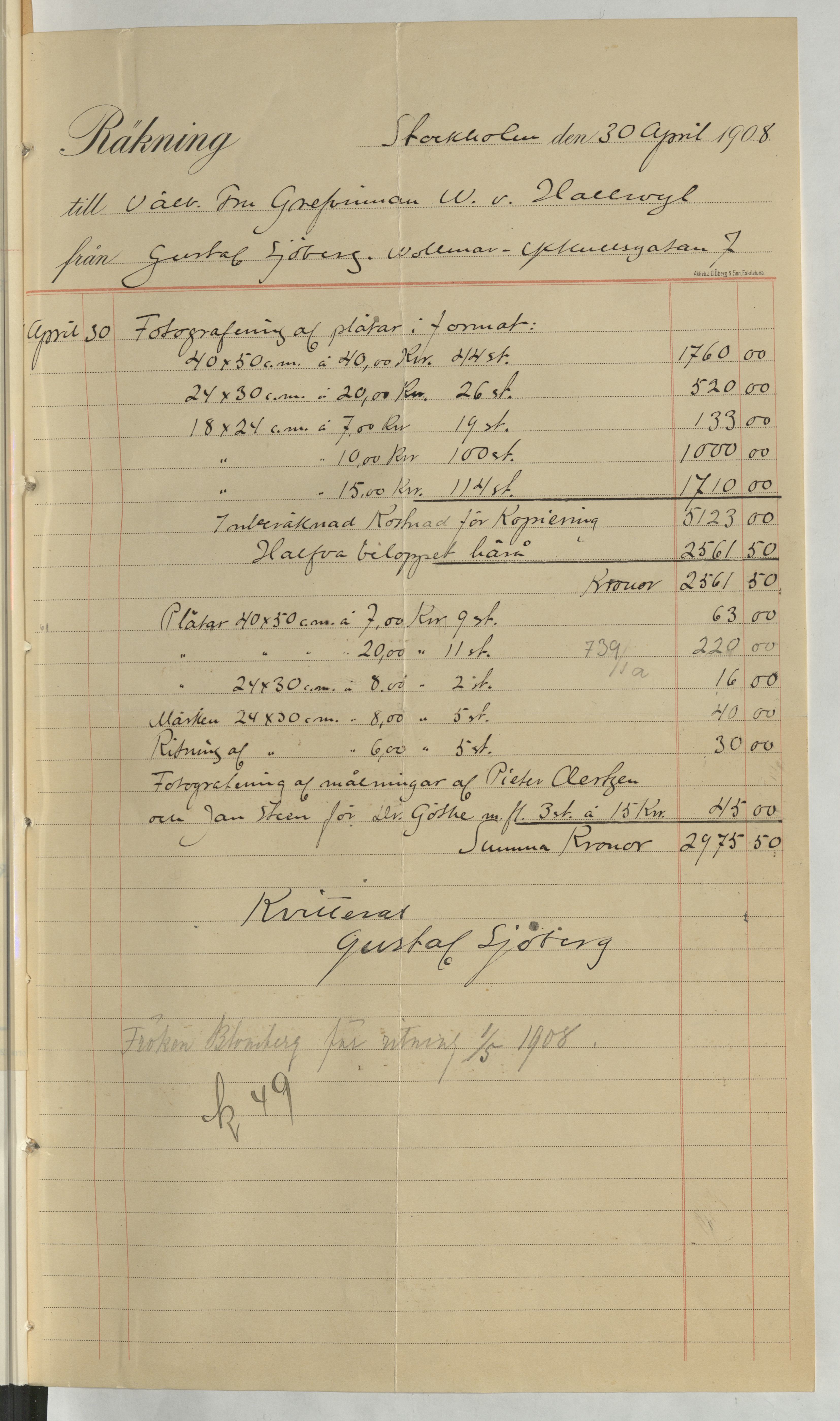 Kvitto från Gustaf Sjöberg. Gällande betalning för hans arbete med fotografering av museisamlingarna. Stockholm, 1908.