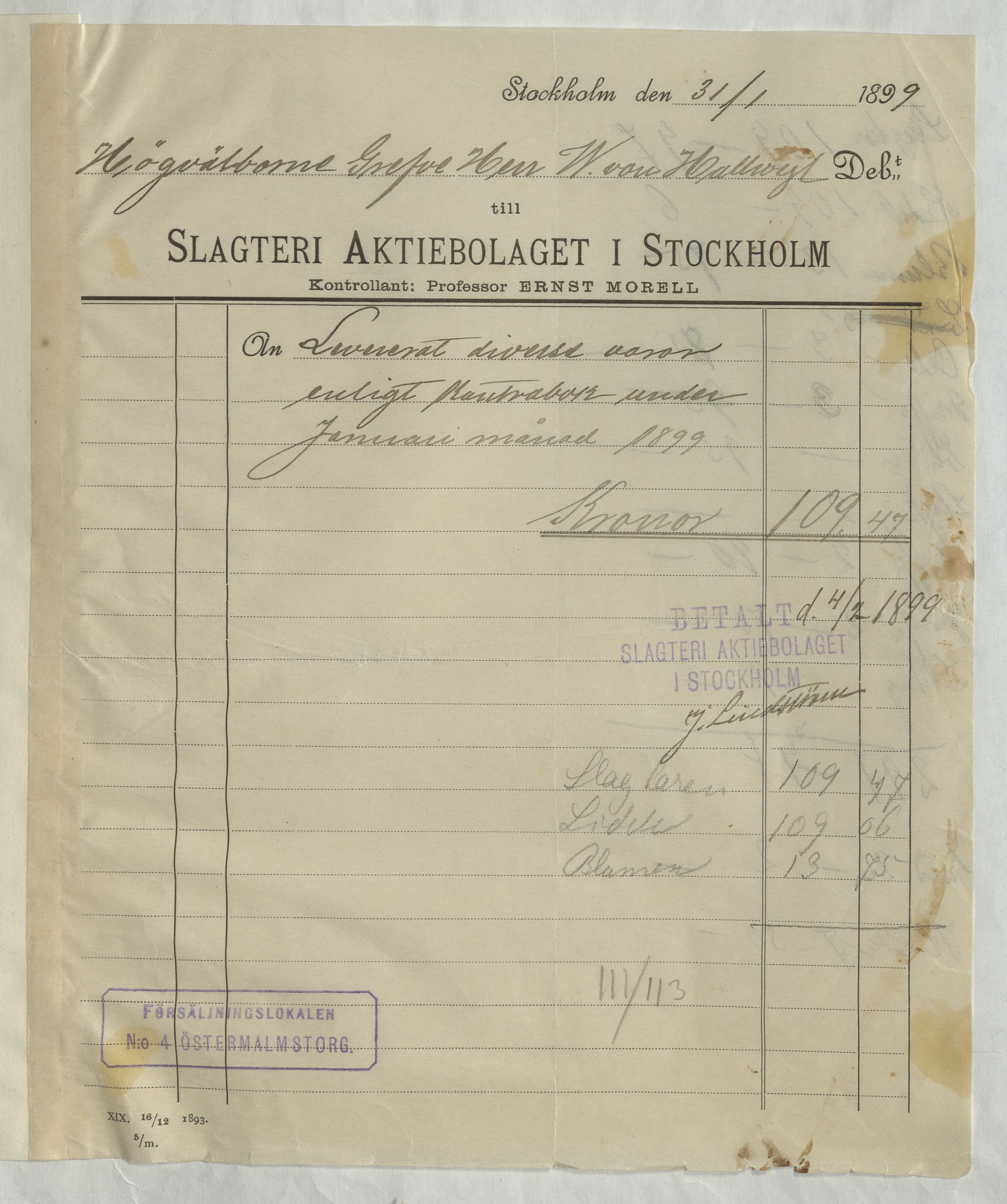 Kvitto från Slagteri Aktiebolaget i Stockholm