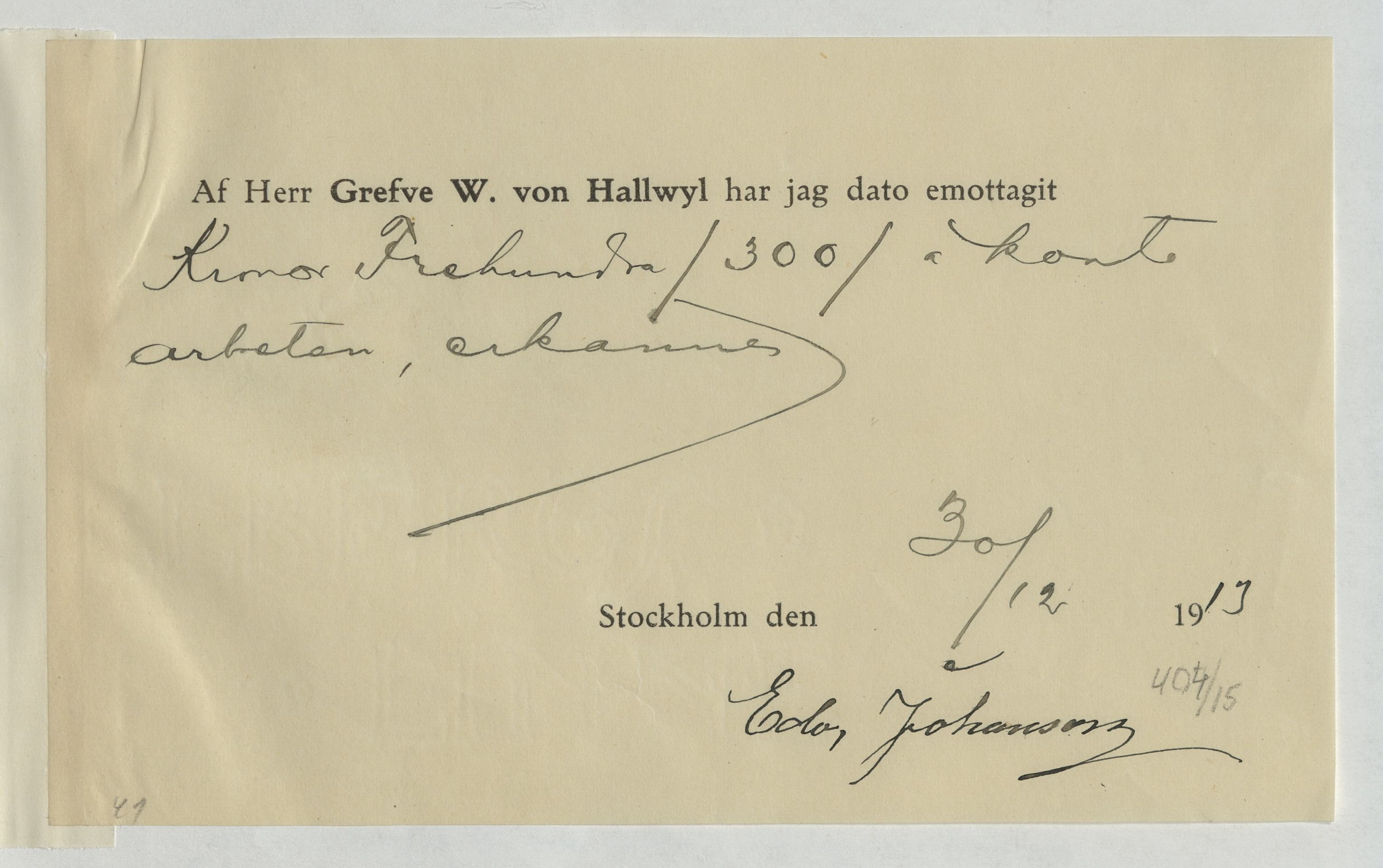 Kvitto från Edv. Johanson, Snickare. Gällande betalning för utfört arbete.