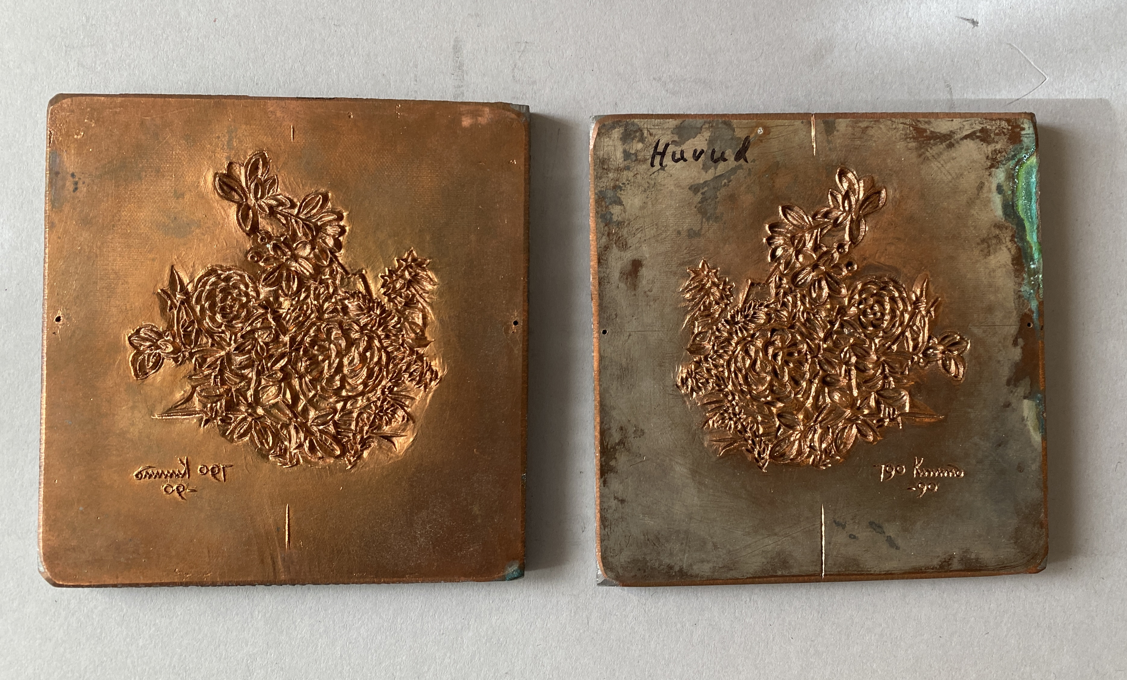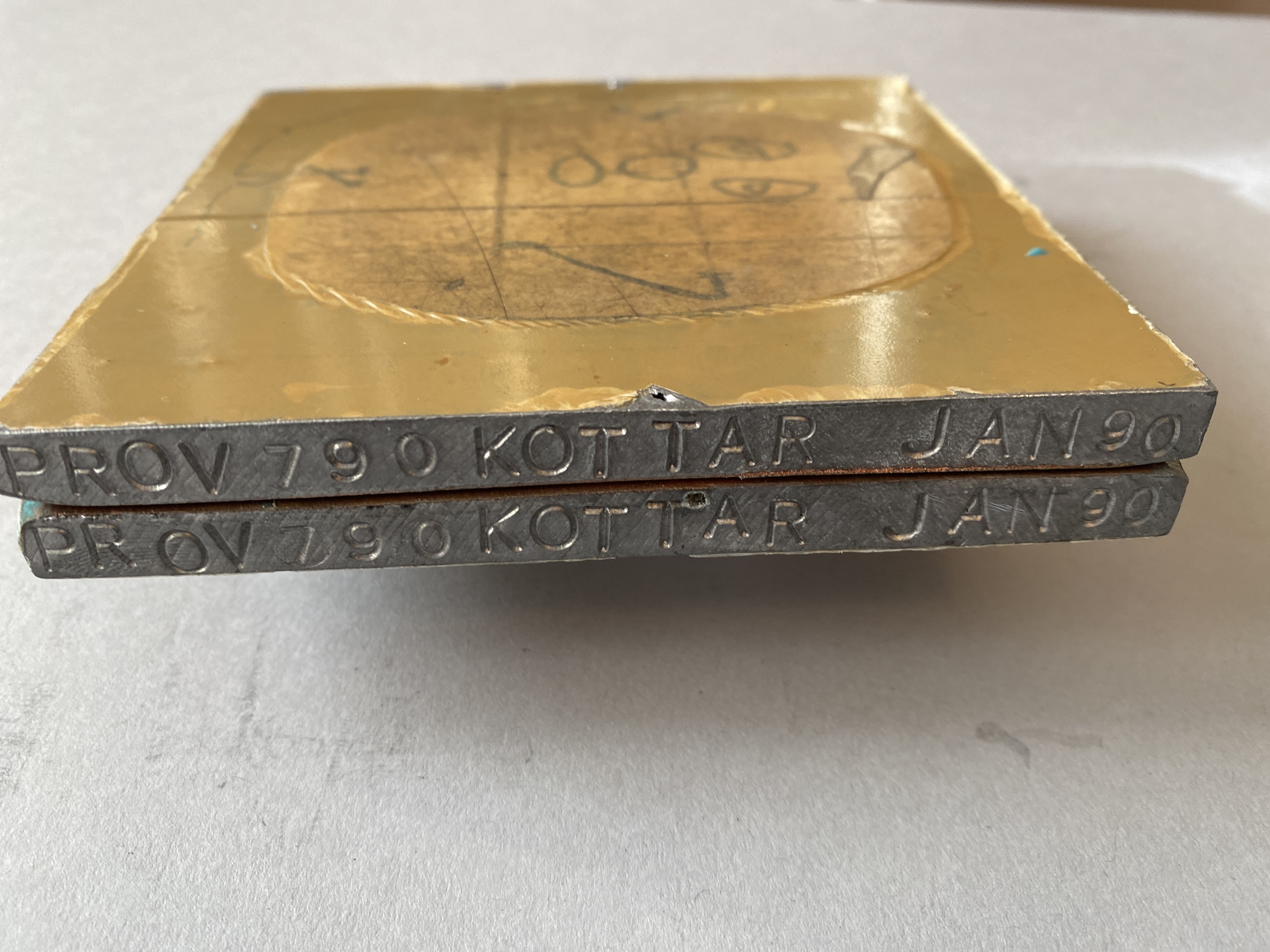 Pressplatta för vattenmärkestillverkning med växtmotiv, 2 stycken. Text på plattorna: "prov 790 KOTTAR JAN 90, 790 Kimmo 90".