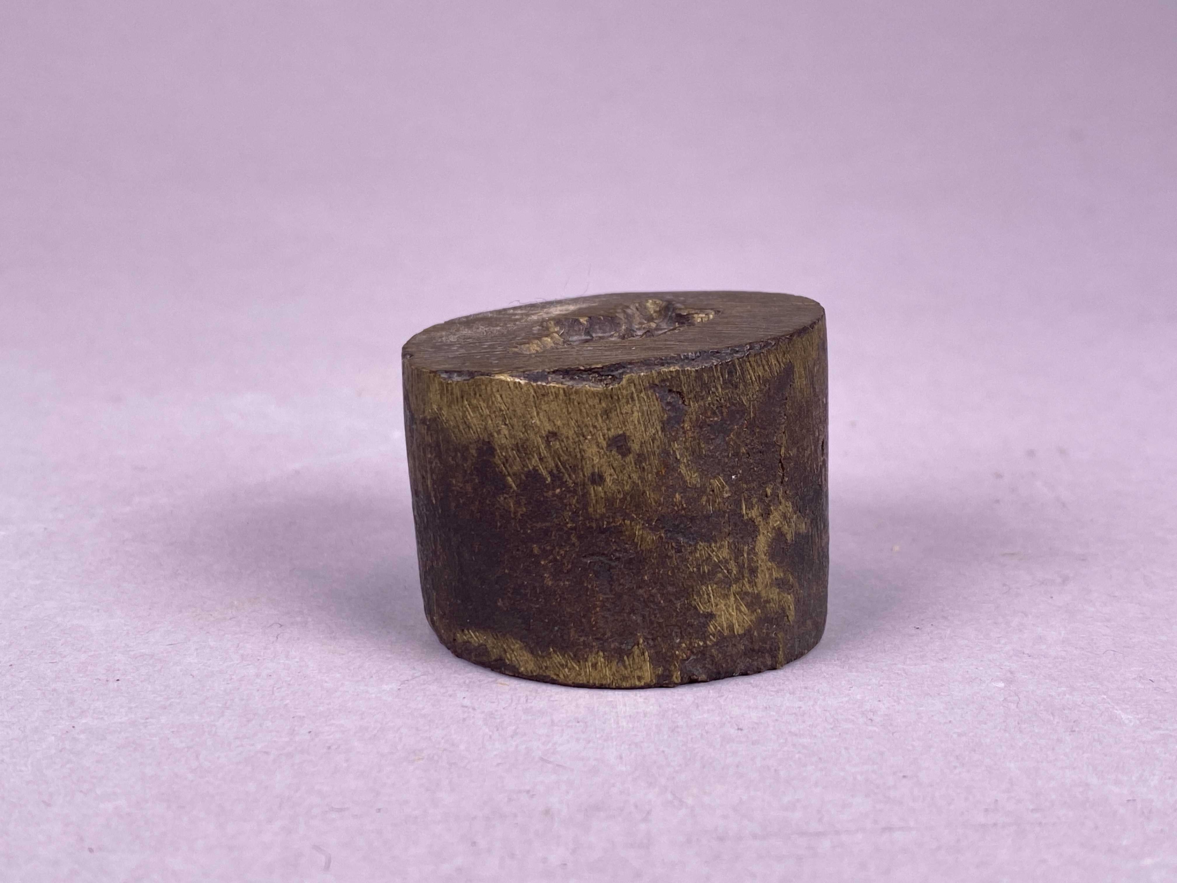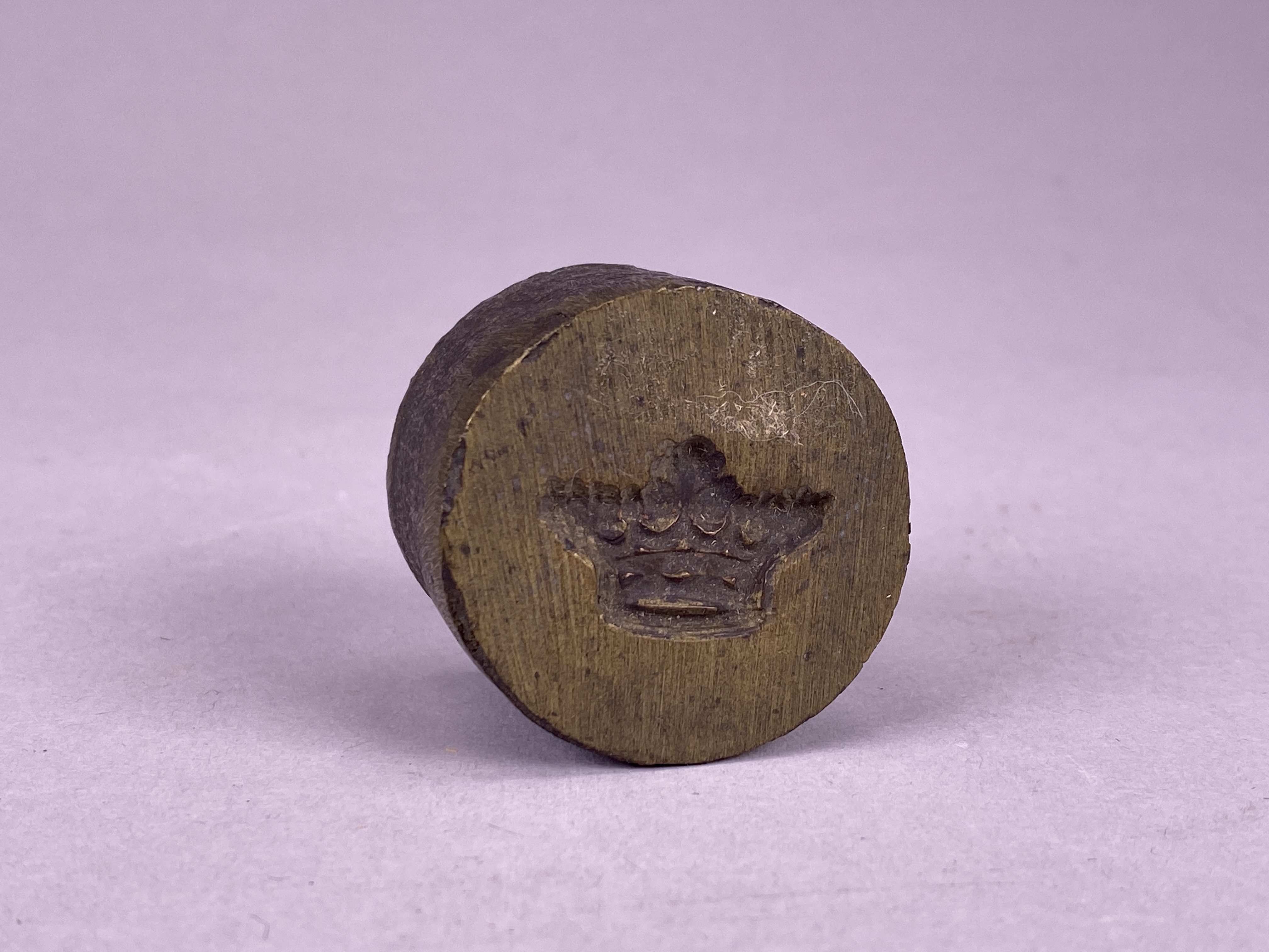 Stämpel tillverkad i mässing. Cylinderformad stämpel med nedsänkt motiv föreställande krona.
