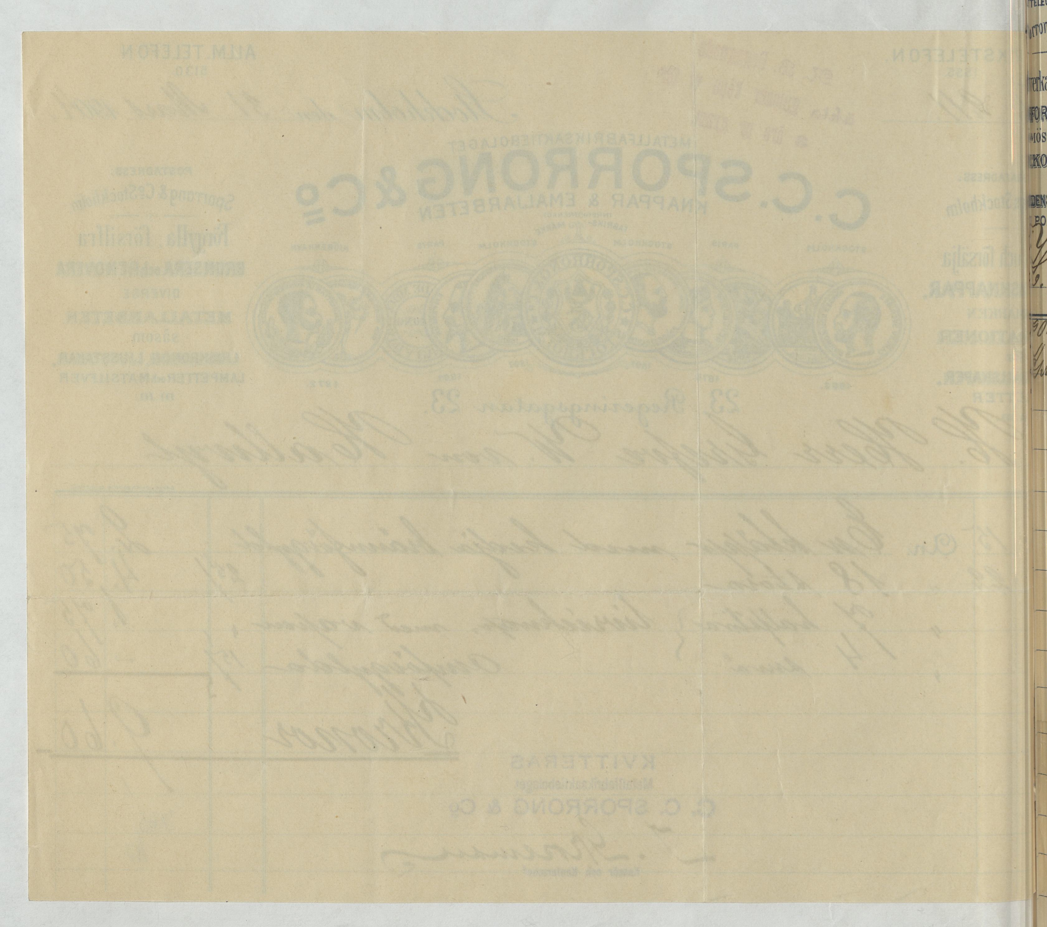 Kvitto från Metallfabriksaktiebolaget C. C. Sporrong & Co. Knappar & Emaljarbeten