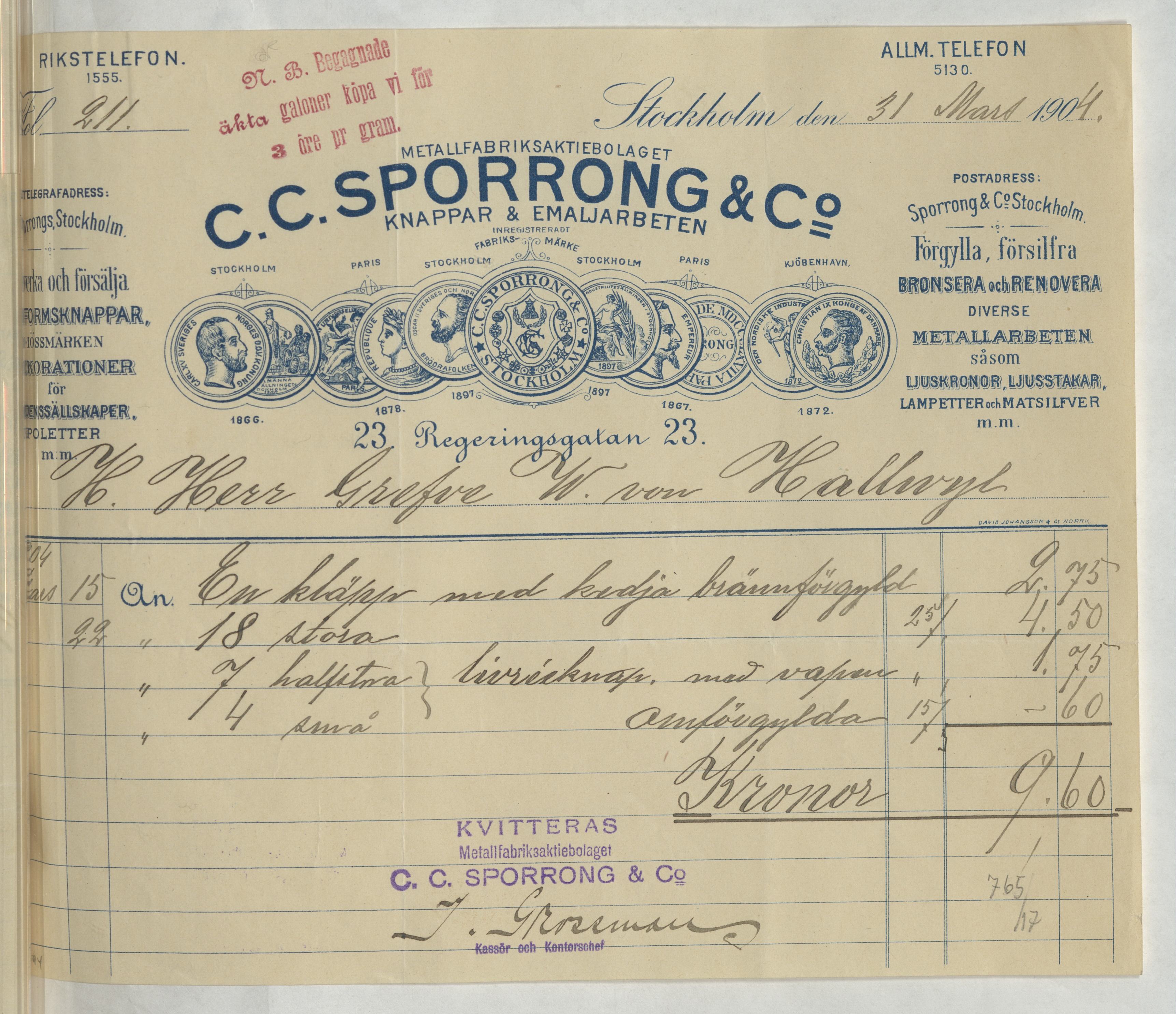 Kvitto från Metallfabriksaktiebolaget C. C. Sporrong & Co. Knappar & Emaljarbeten. Gällande brännförgyllning av en kläpp med kedja samt flertalet knappar. Stockholm, 1904.