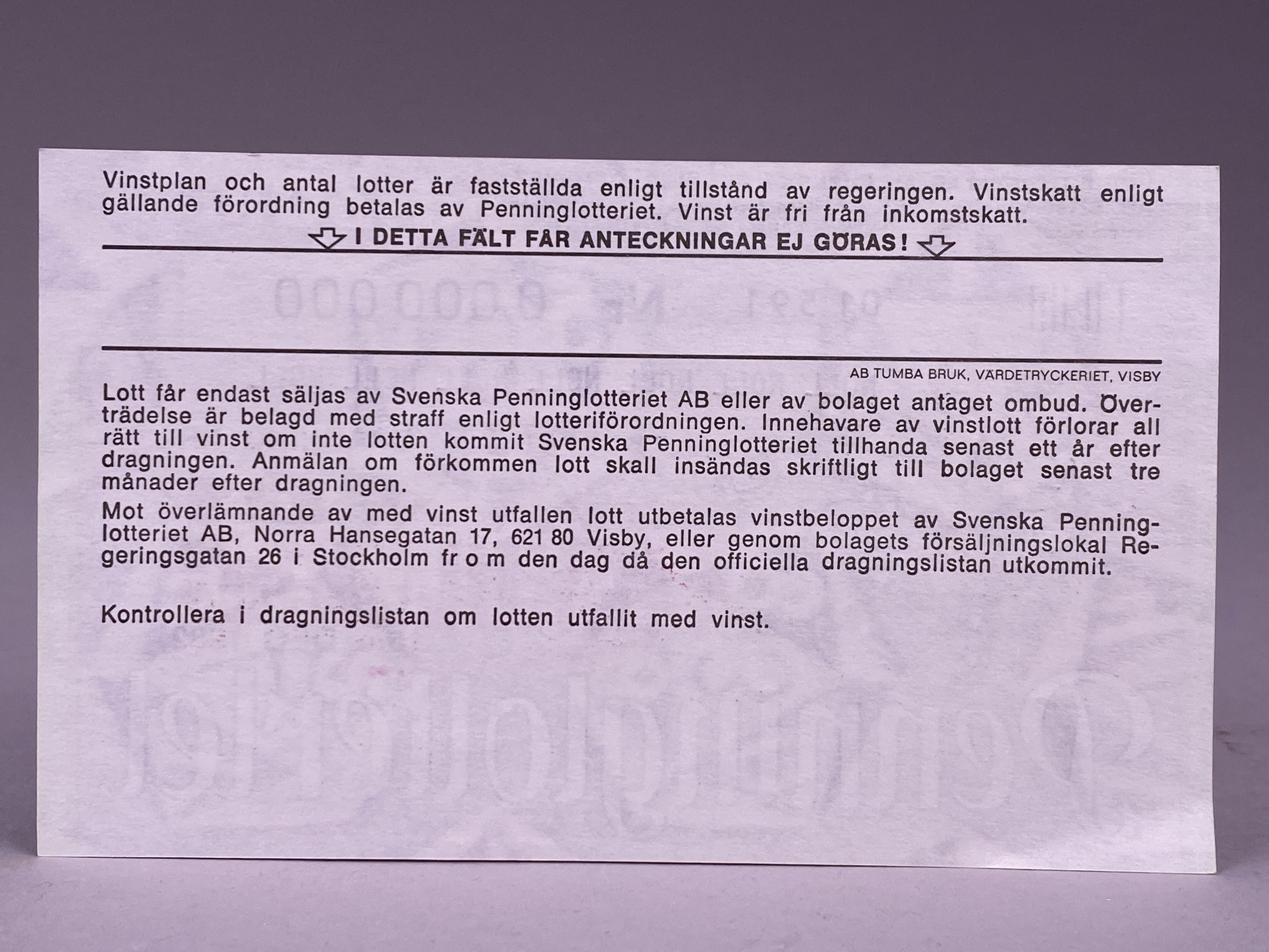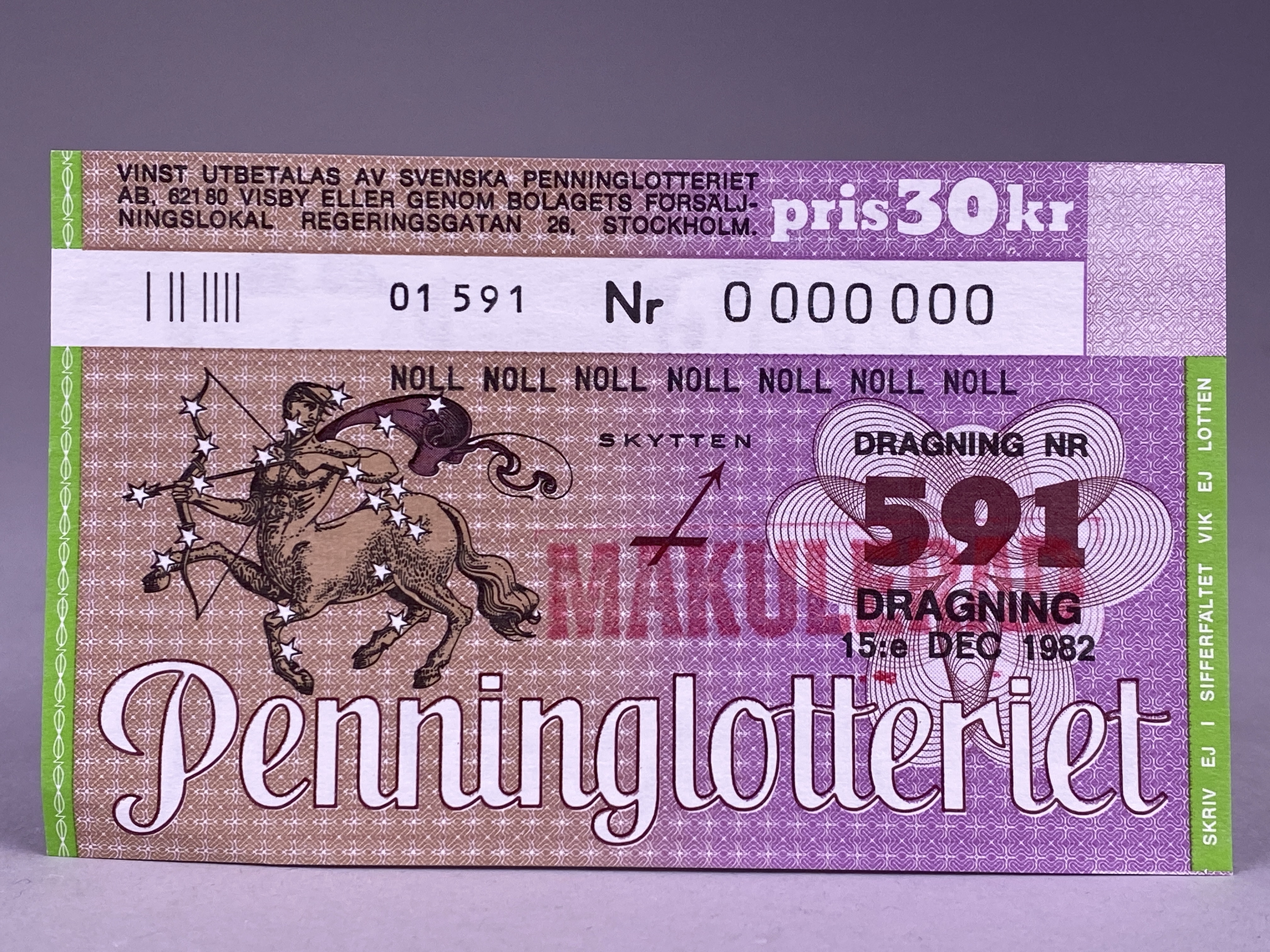 Lotterisedel nr 0 000 000 med dragningsdatum den 15 december 1982. Provtryck, makulerad. Svart och vinröd text tryckt på brun/lila bakgrund. Motiv: skytten.