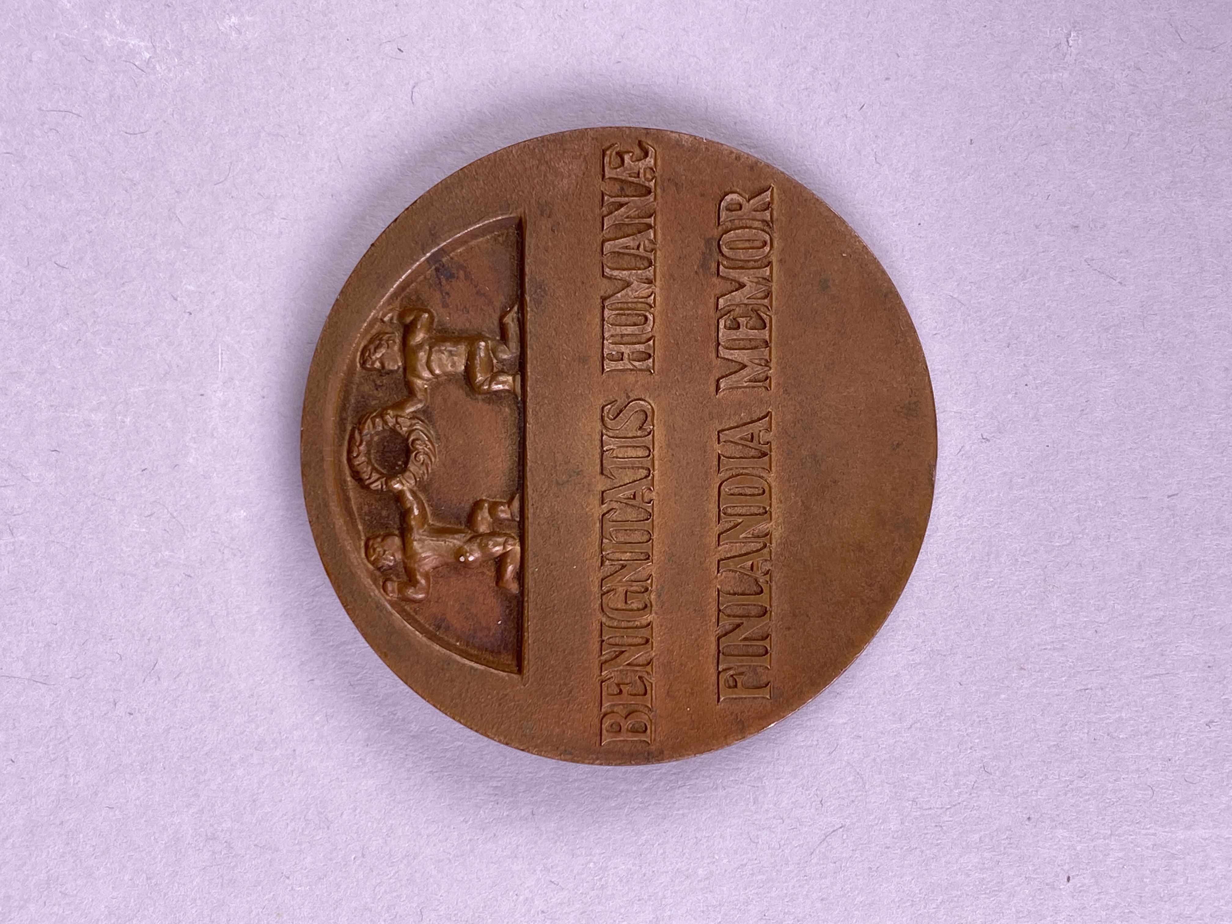 Medalj tillverkad i brons. Ena sidan med texten "Benignitatis humanae Finlandia memo" under två putti hållandes krans. Medaljens andra sida med relief föreställande kvinnofigur, en olivkvist samt en brinnande oljelampa. Medaljen delades ut av den finska staten mellan 1946-1949 till de mödrar som tagit emot finska krigsbarn. Denna medalj tilldelades Anna-Lisa och Herbert Carlsson på Tumba bruk.