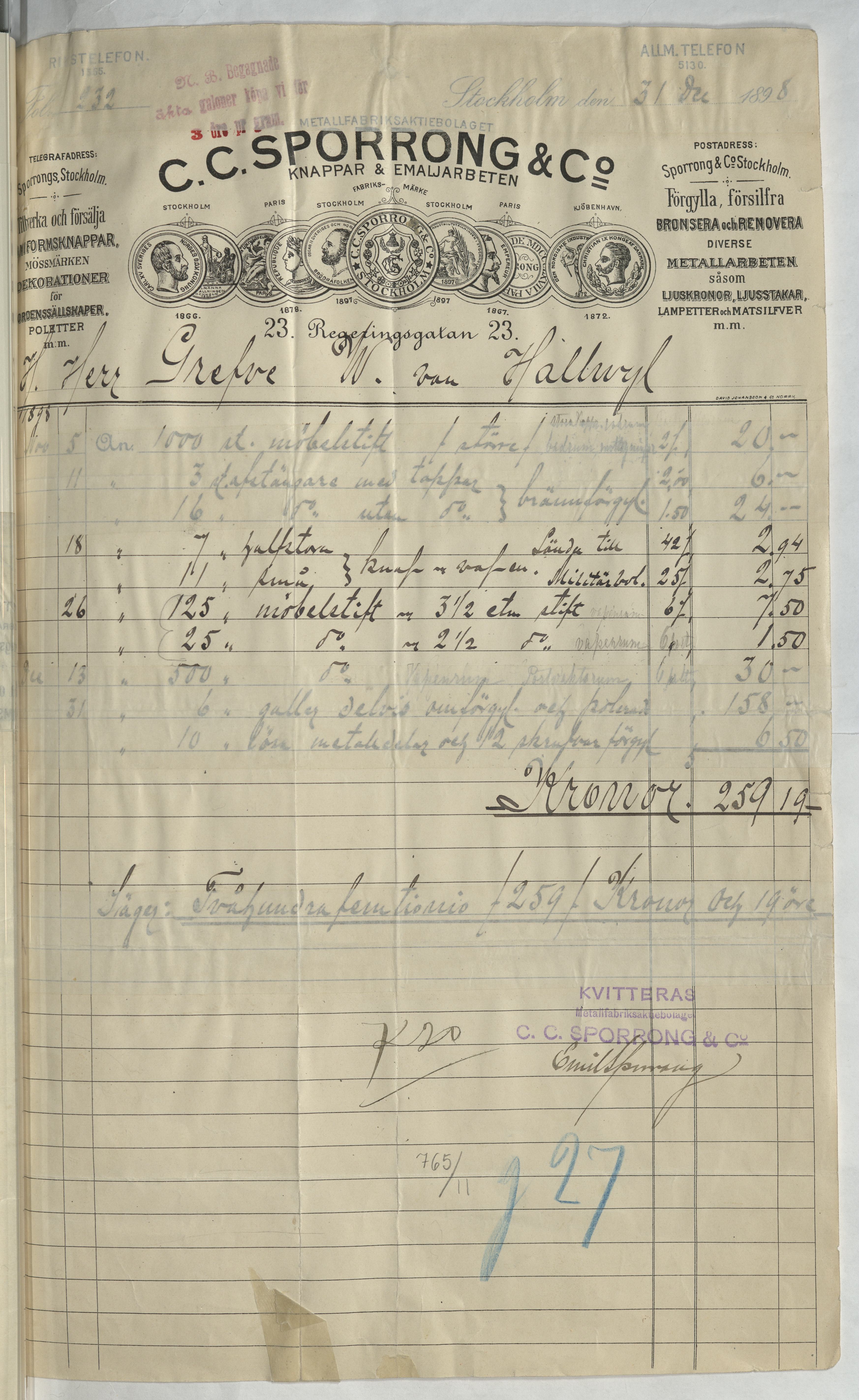 Kvitto från C. C. Sporrong & Co. Knappar & Emaljarbeten. Gällande bland annat inköp av möbelstift och omförgyllningsarbeten. Stockholm, 1898.