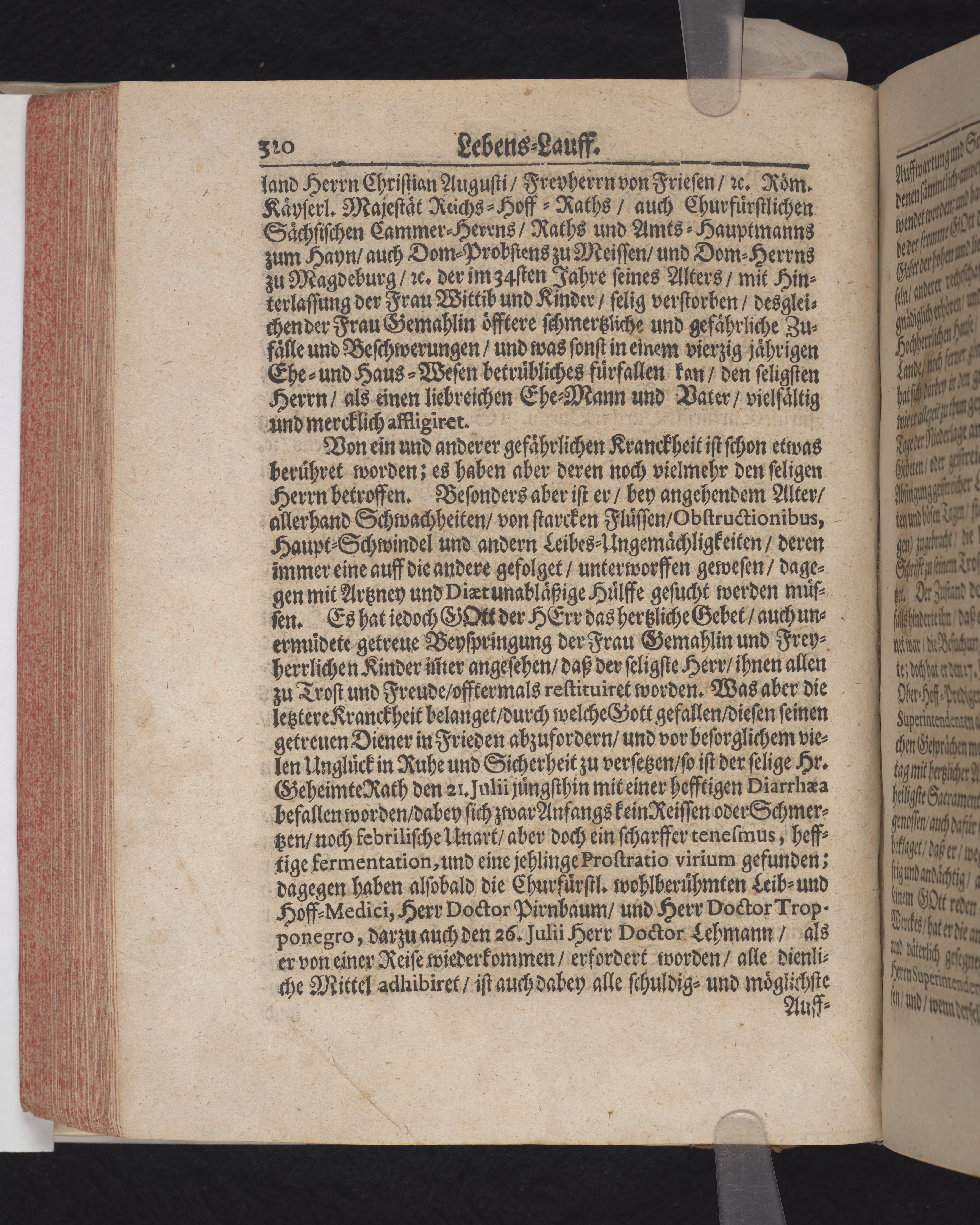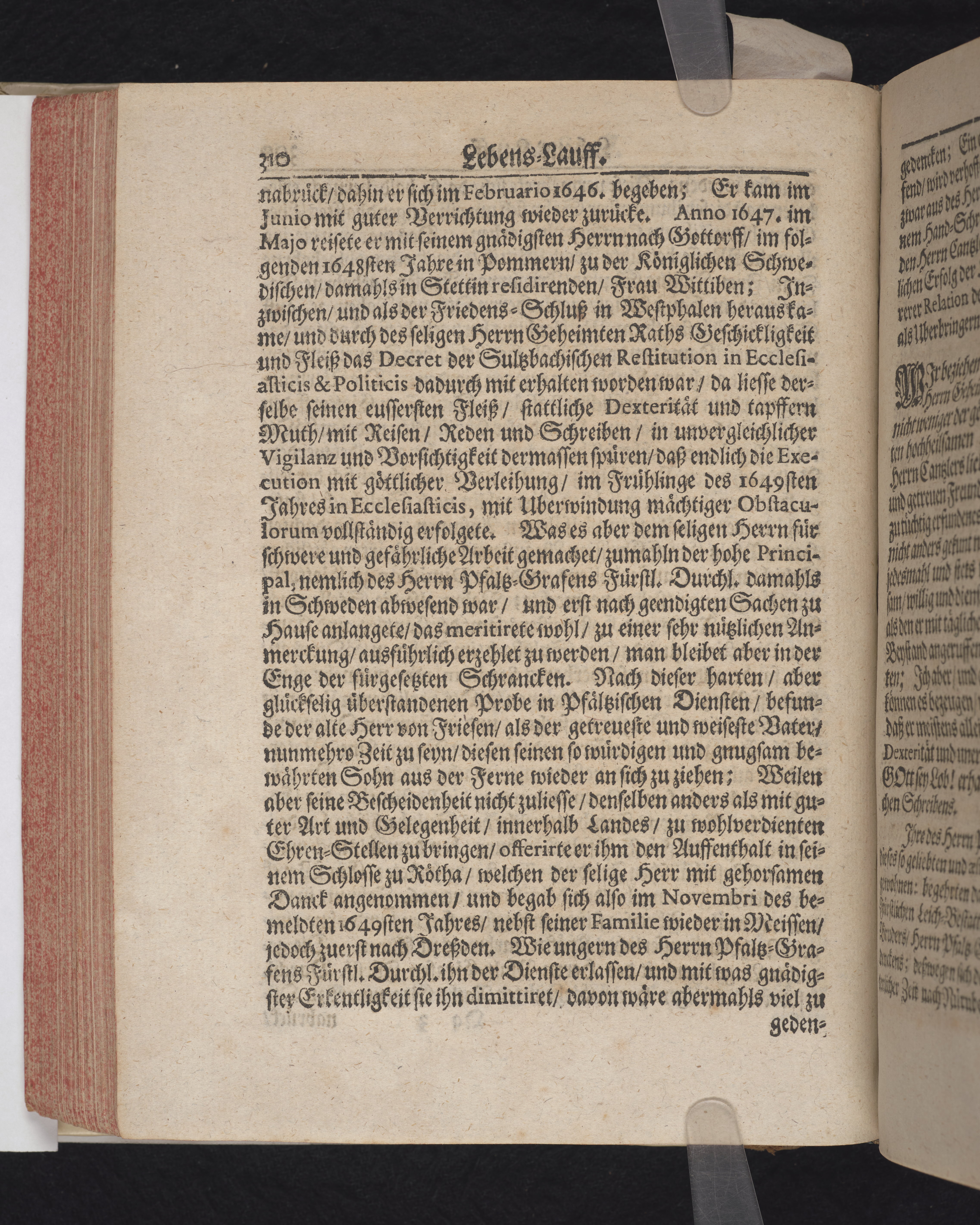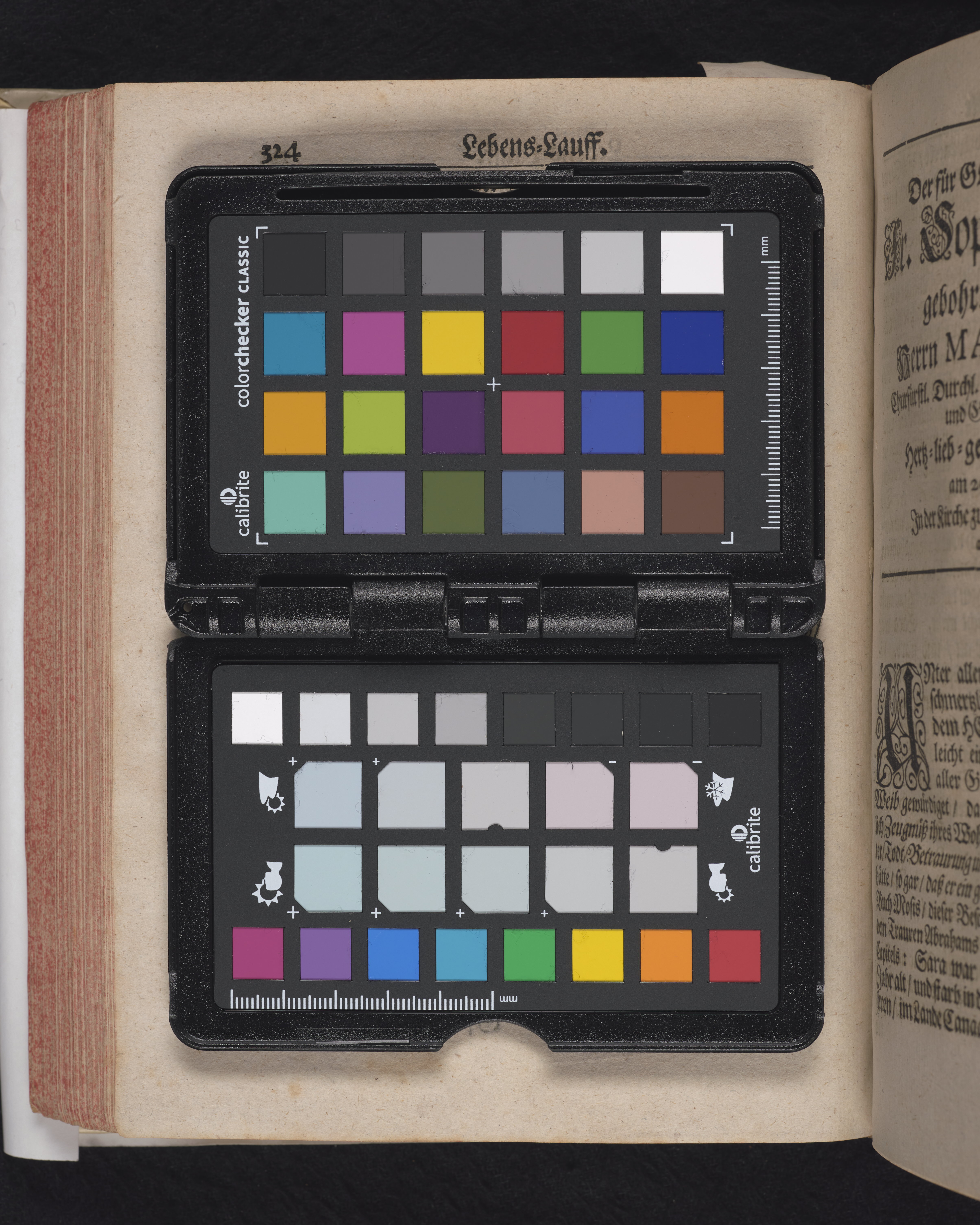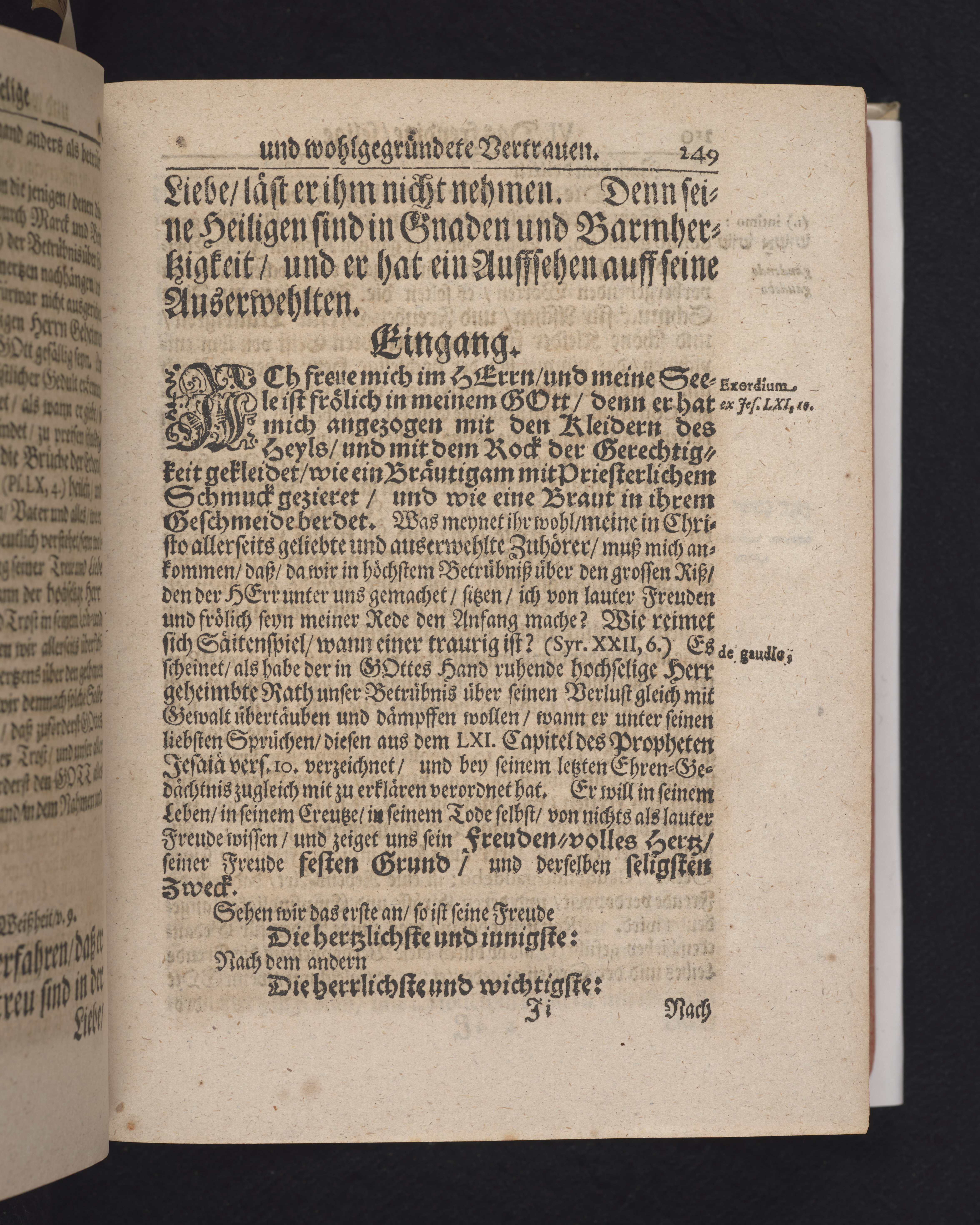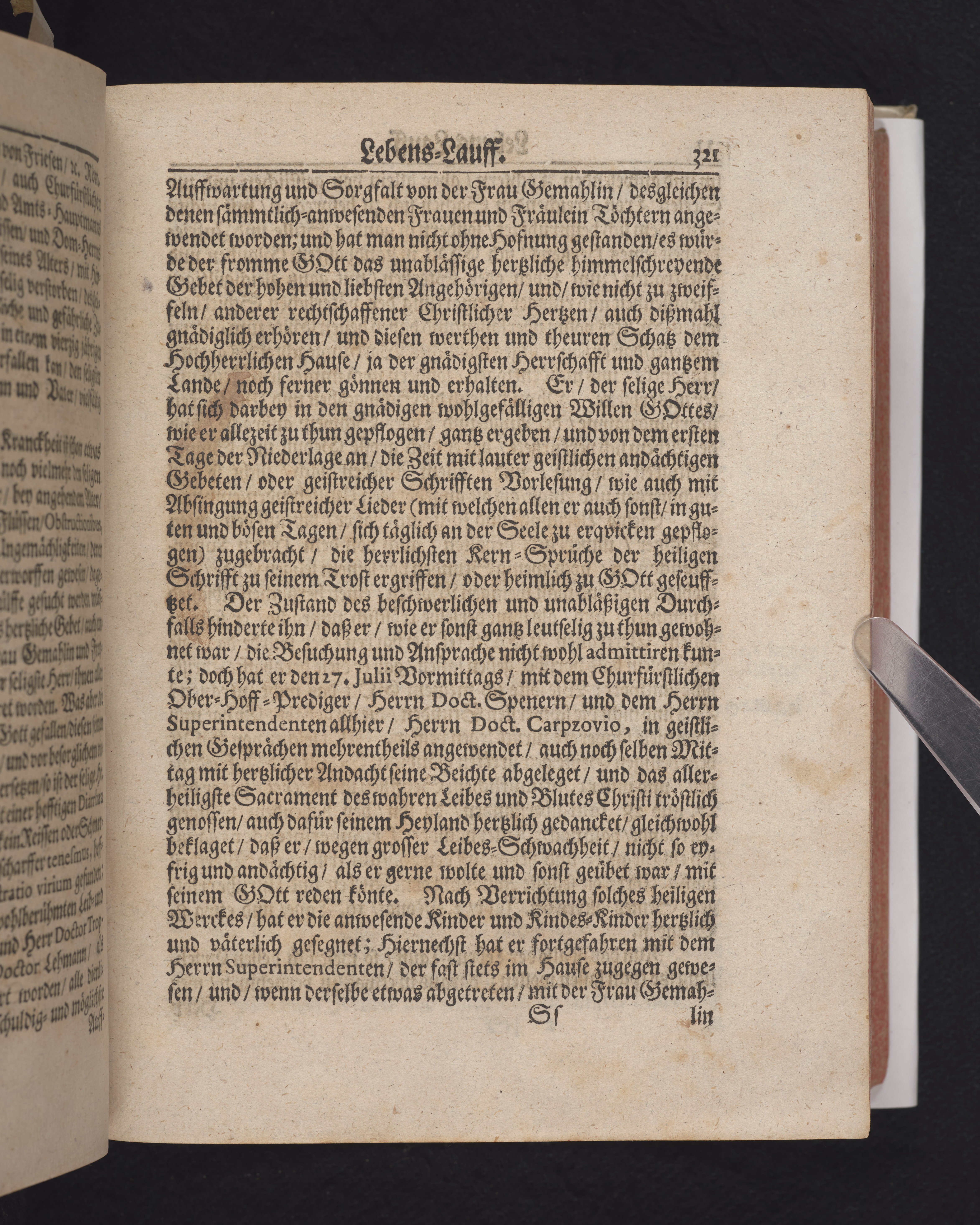 Ingår i en utgiven samling med 28 likpredikningar av Samuel Benedikt Carpzov: Grünende Gebeine, oder Leich-Predigten... Tryckt innehållsförteckning och register. Handskriven innehållsförteckning över de 28 likpredikningarna med bläck på främre försättsbladet (recto och verso).