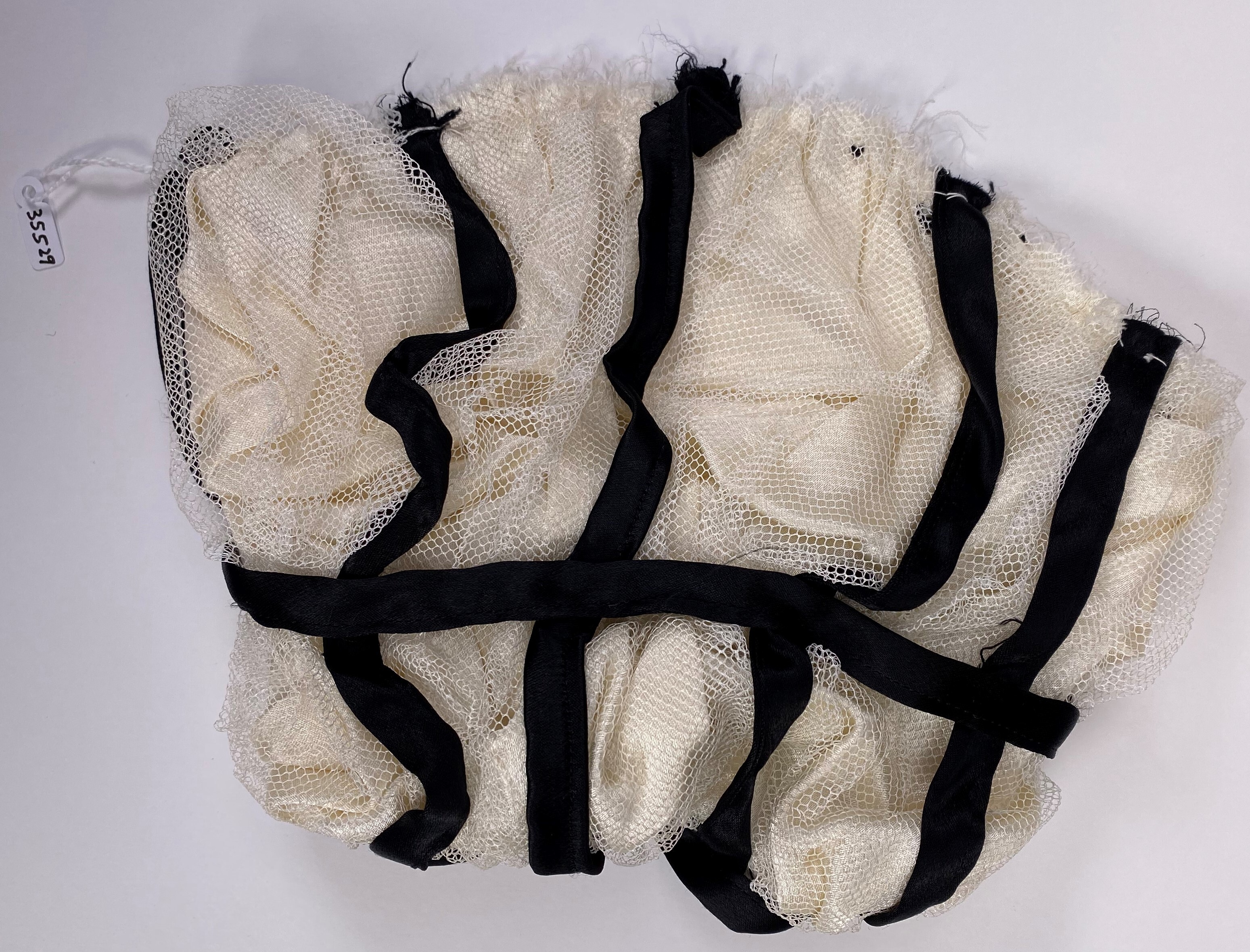 Lös höger gallerärm till hovdräkt. Puffärm och ensömsärm i vit sidensatin, täckt med vitt tyll. Svarta maskinsydda sidenband av snedklippt sidensatin utgör gallret. Ärmen är fodrad med tunt tuskaftsvävt bomull. Öppningen vid ärmhålet är fäst med rynktrådar och kanterna har lämnats råa. Ärmöppningen är kantad med ett svart sidenband och fäst med fållstygn. Tillhört Britta Mannerfelt (1916-2004).