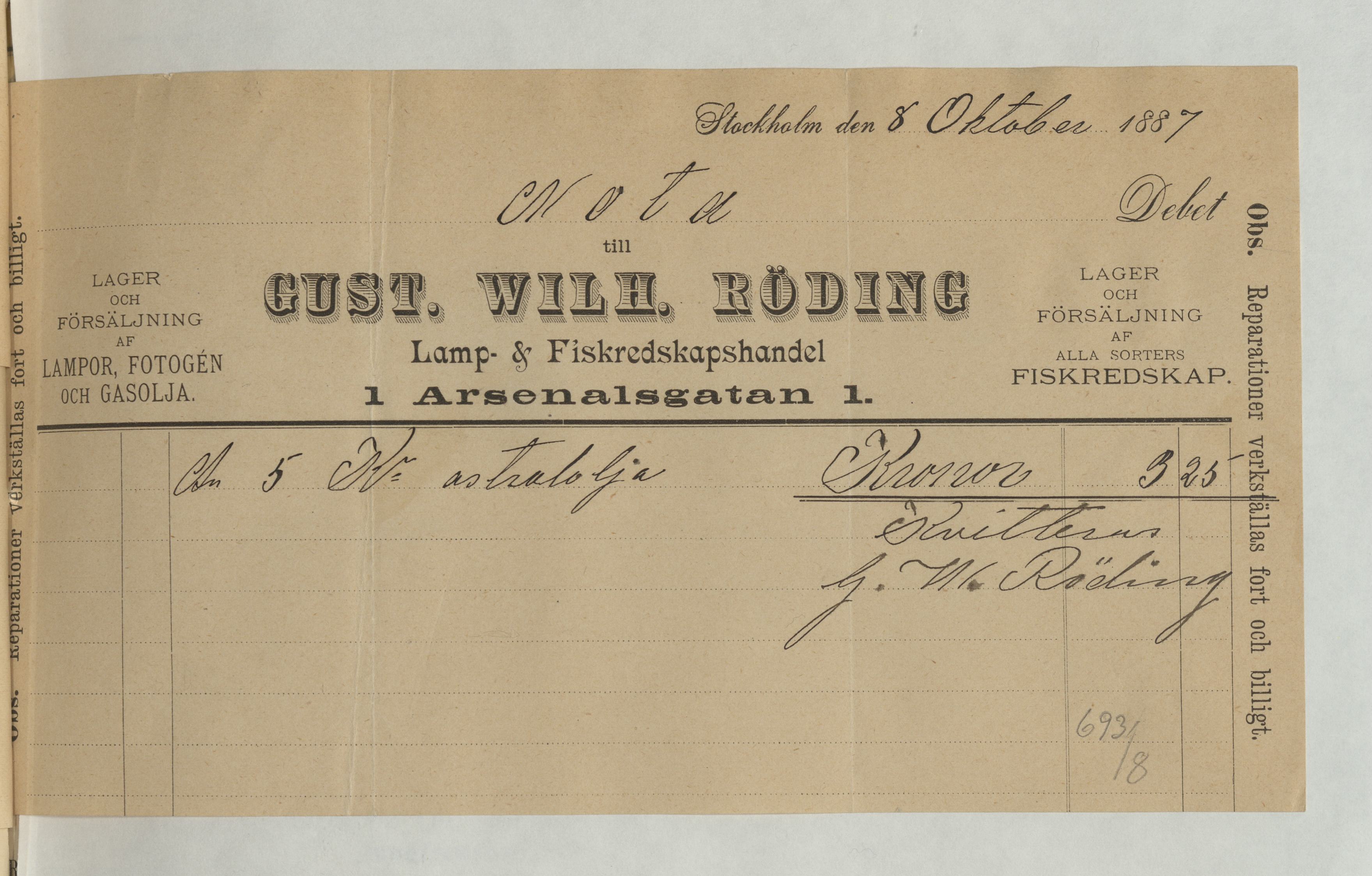 Kvitto från Gust. Wilh. Röding, Lamp- och Fiskeredskapshandel, 1887