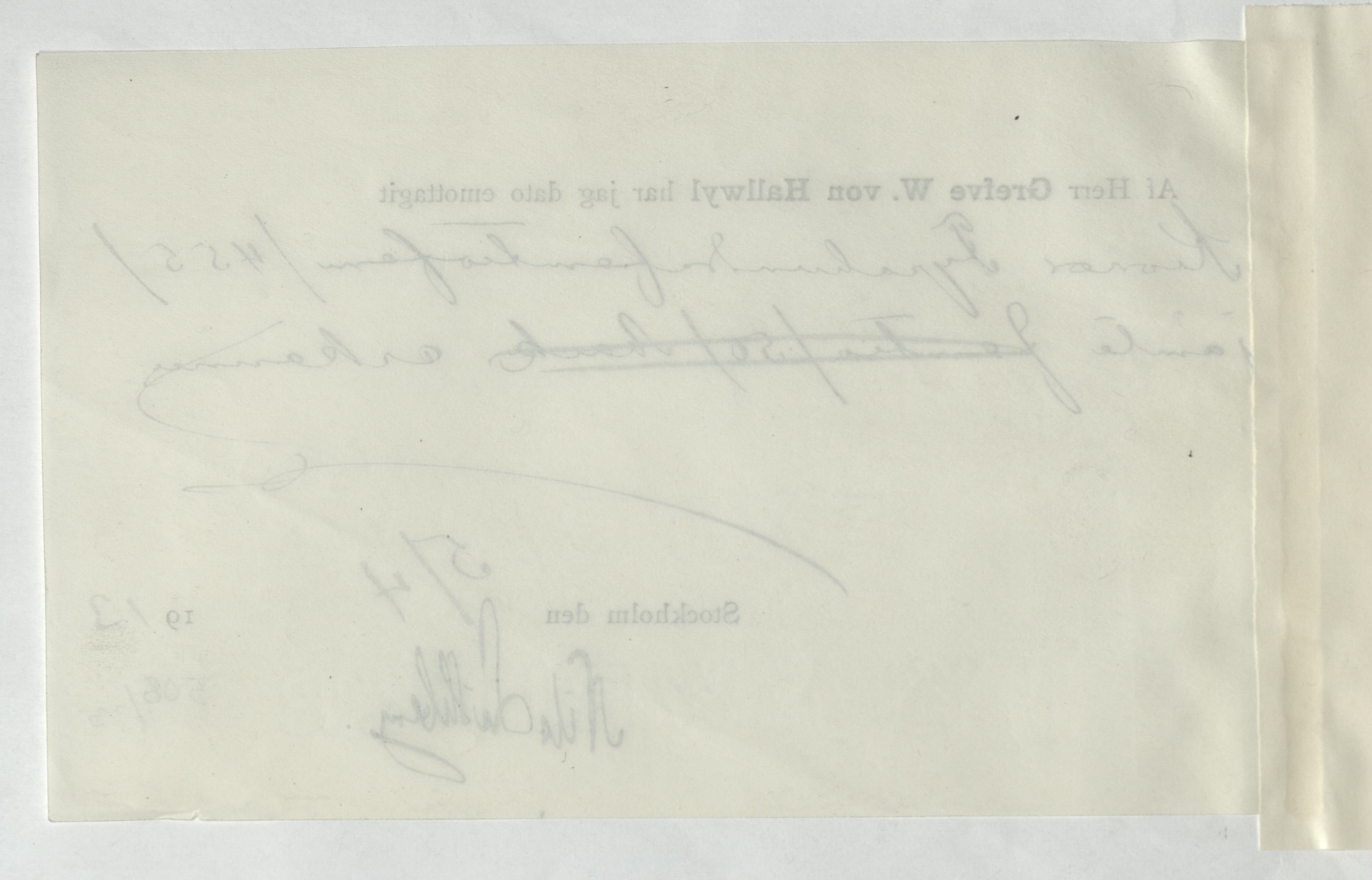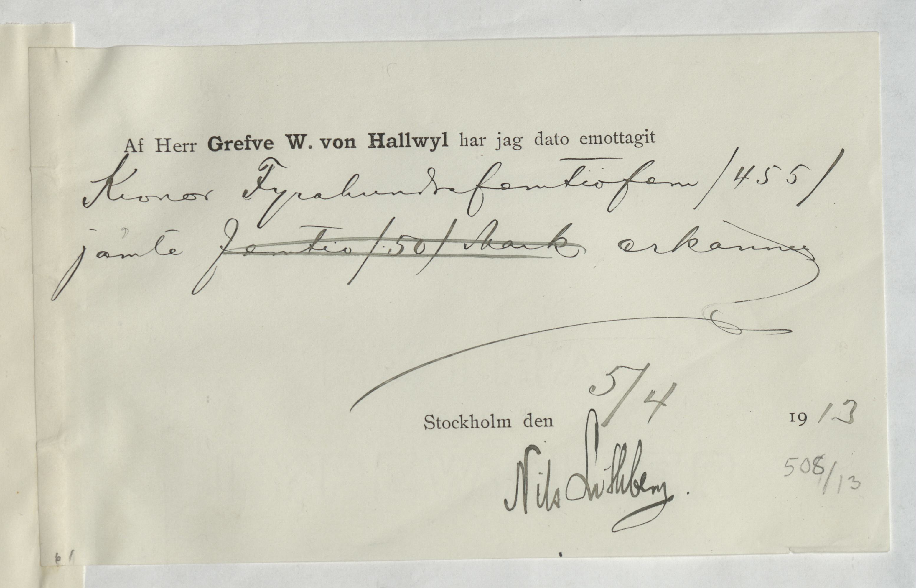 Kvitto gällande pengatransaktion mellan Walther von Hallwyl och Nils Lithberg. Stockholm, 1913.