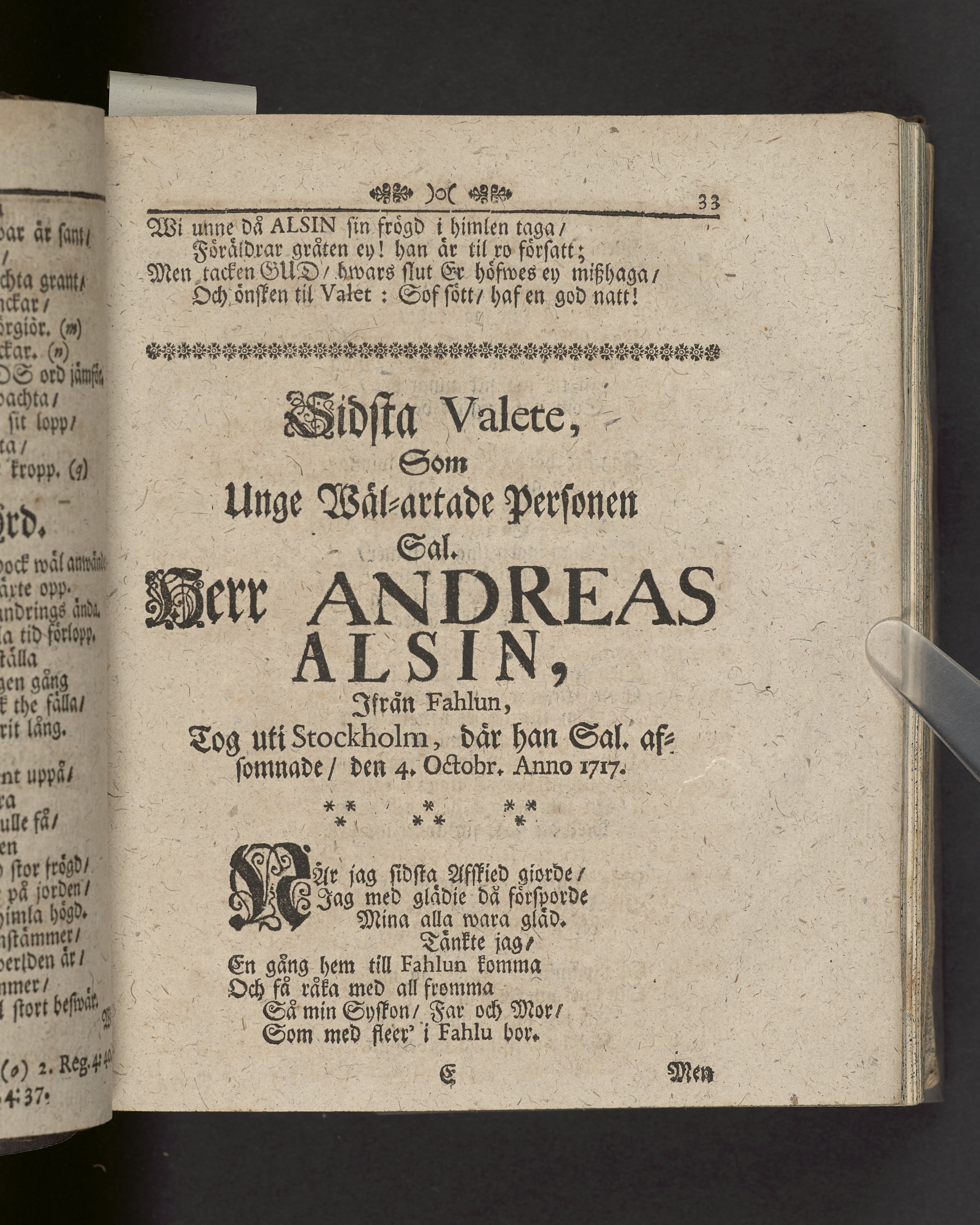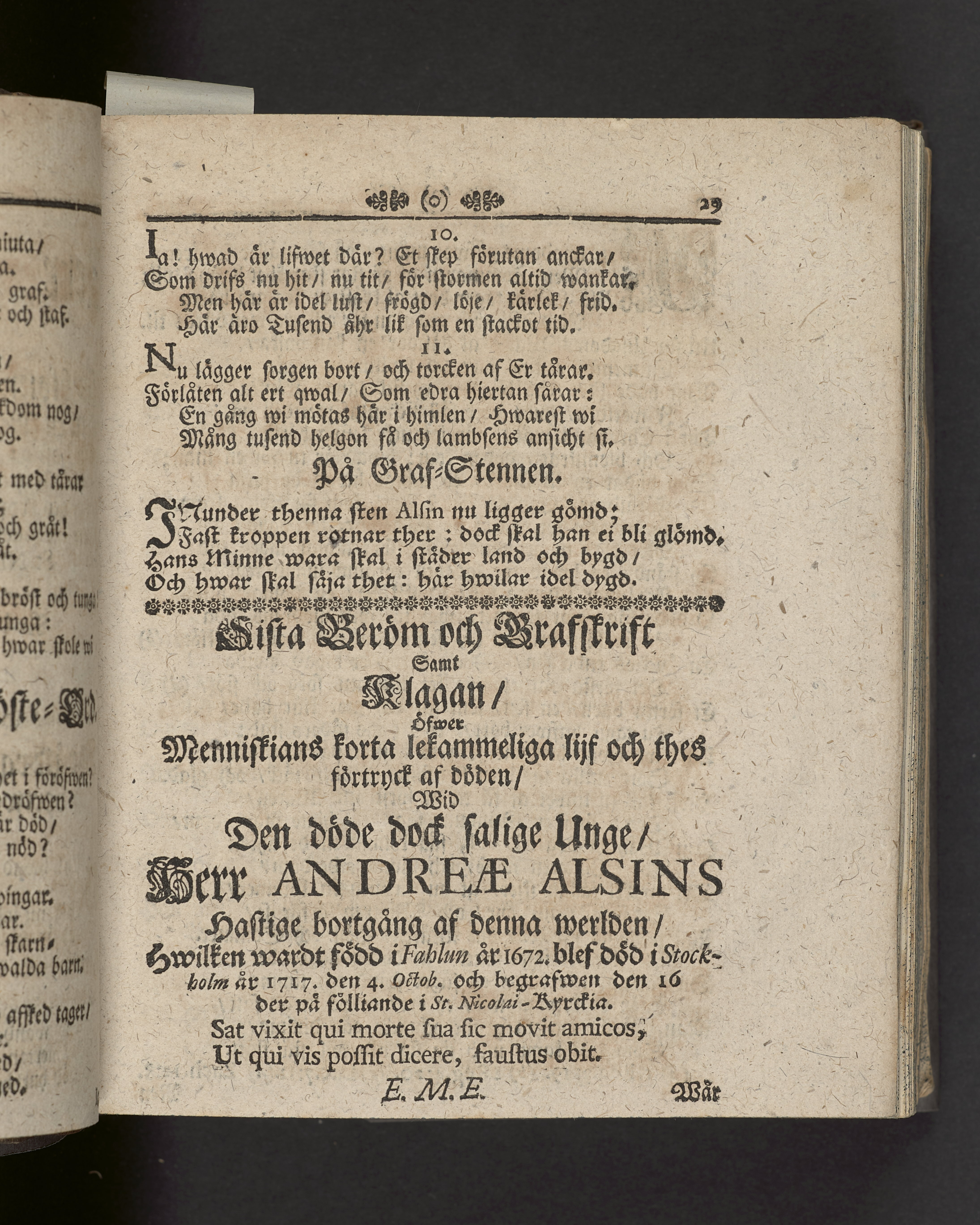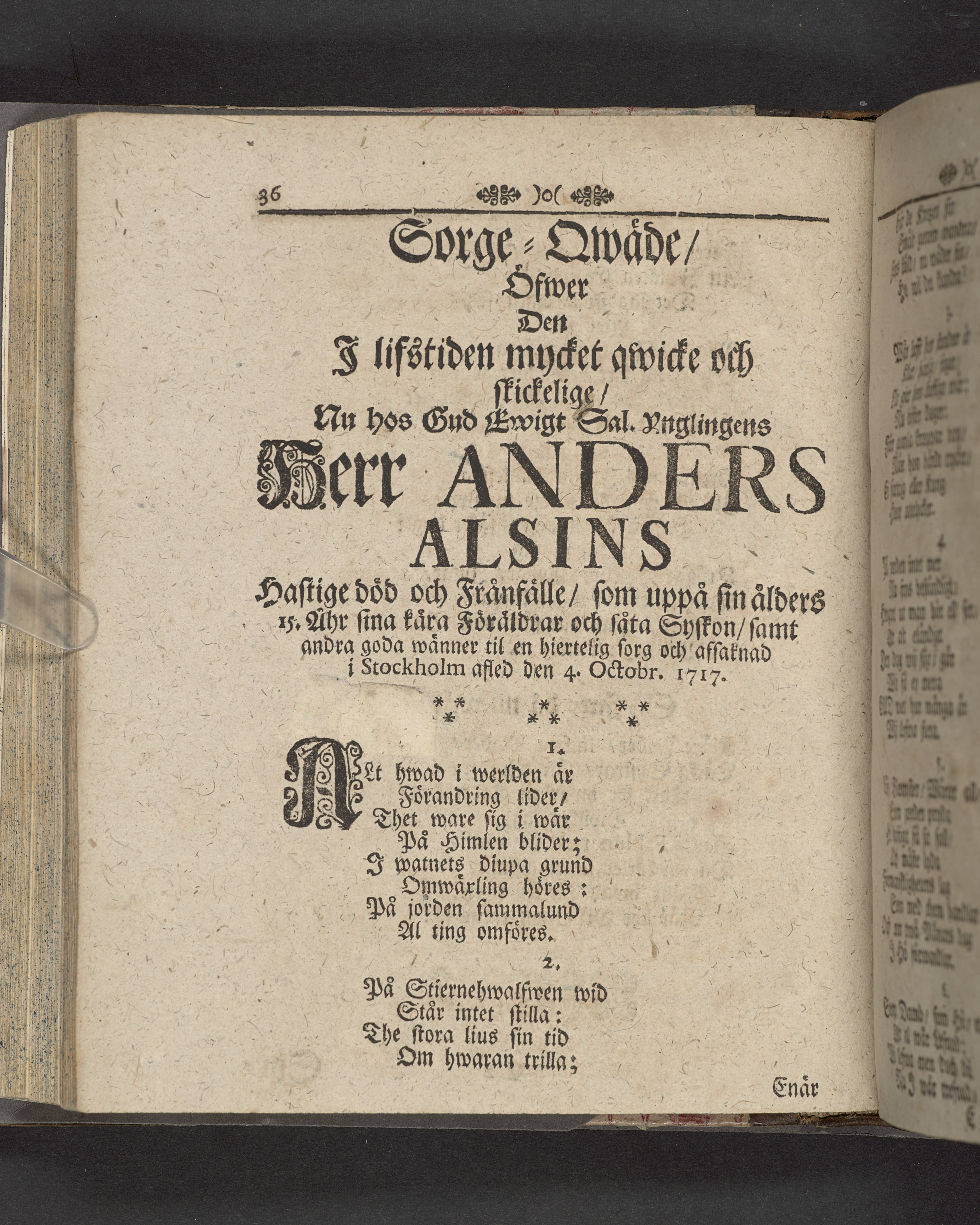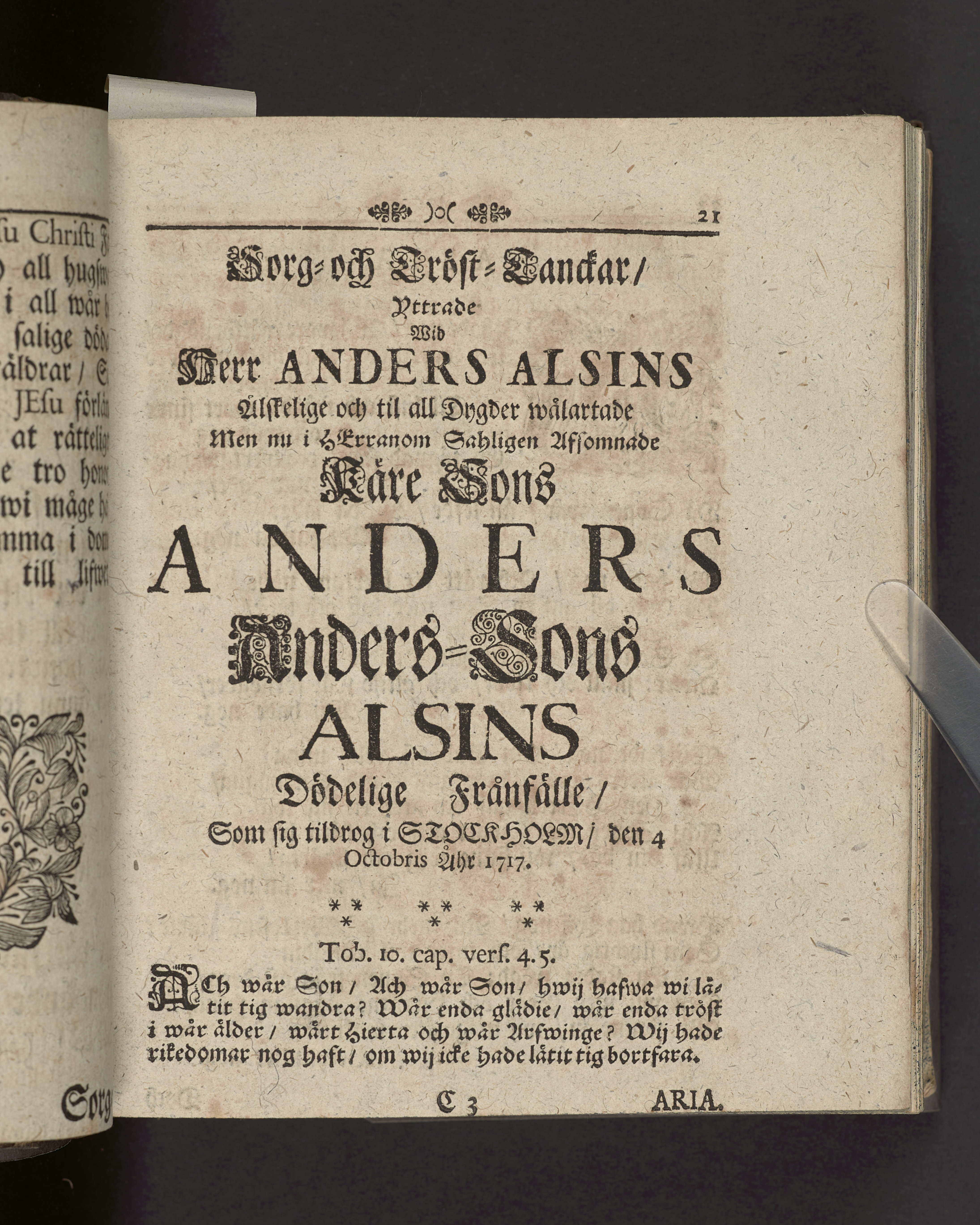Innehåller även 7 gravskrifter samlade under rubriken "Sorg- och tröst-tanckar, yttrade wid ... Anders-sons Alsins dödelige frånfälle".