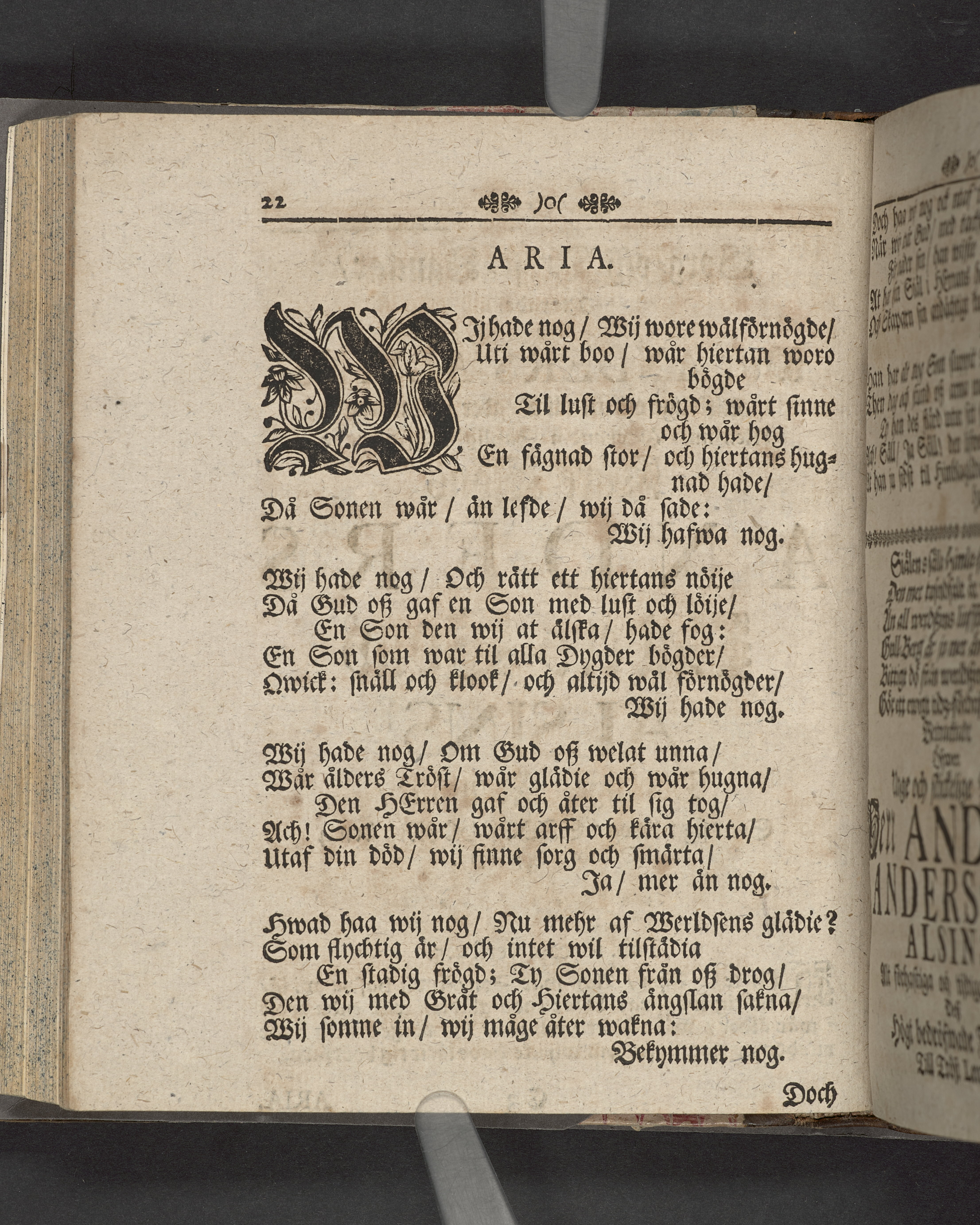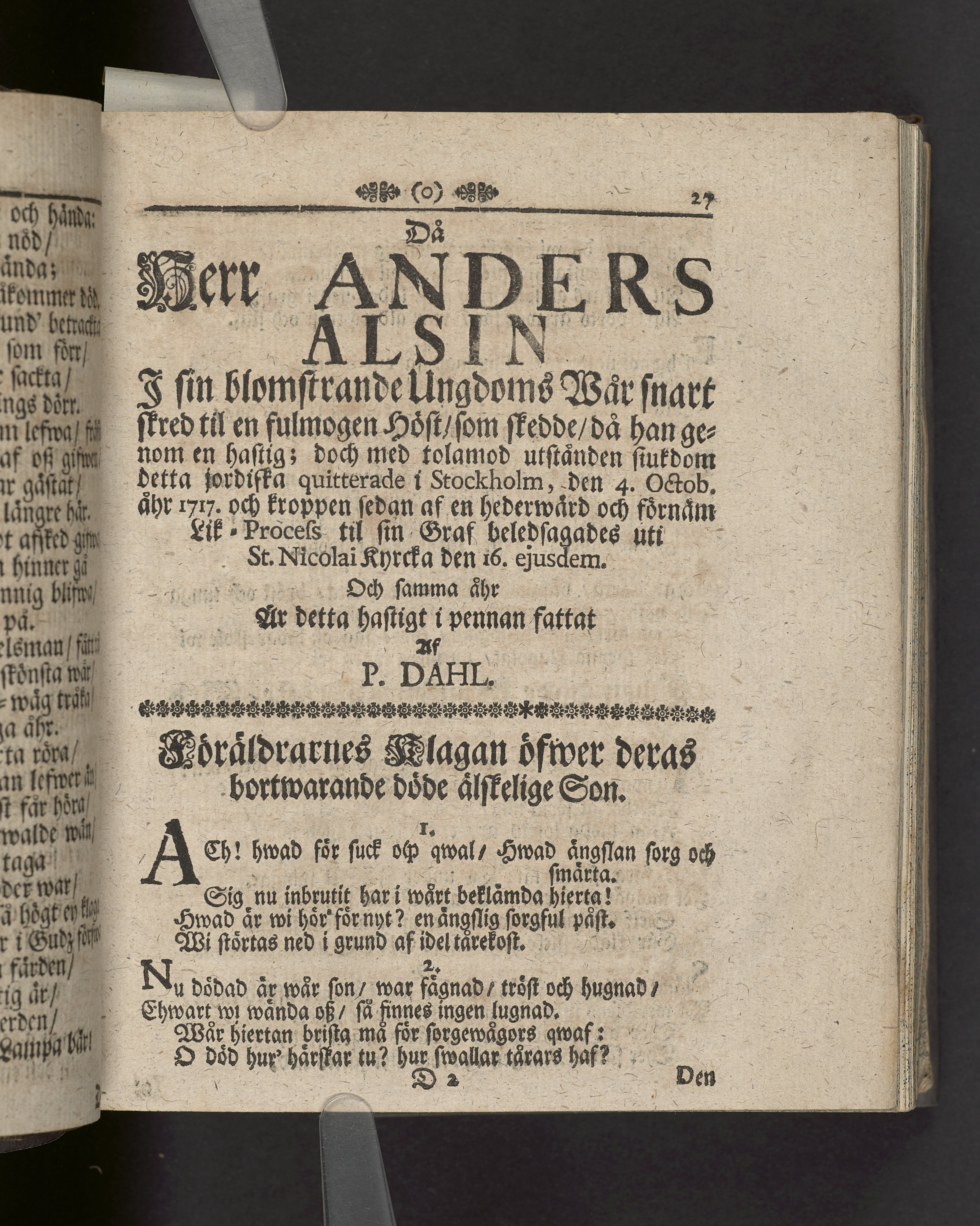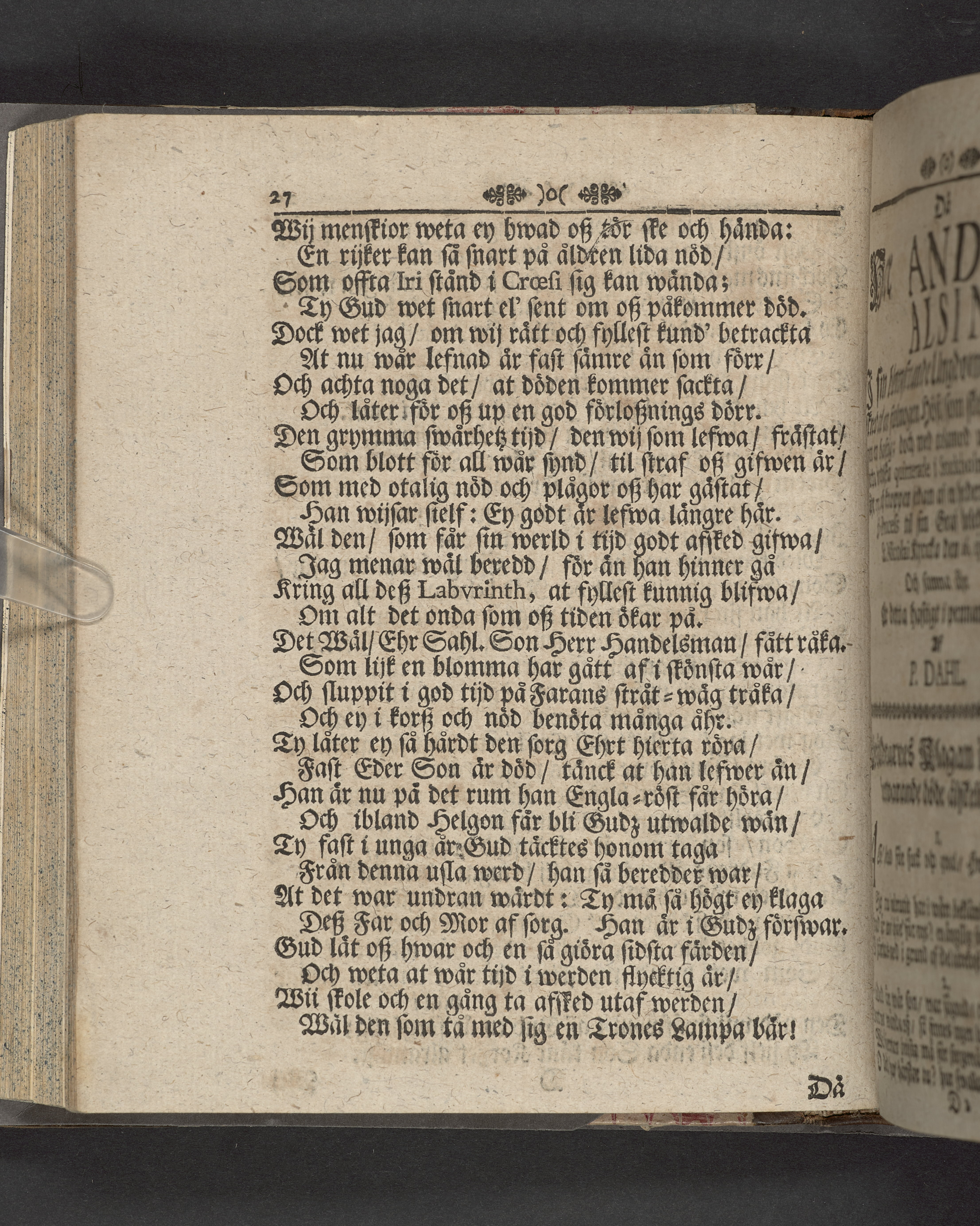 Innehåller även 7 gravskrifter samlade under rubriken "Sorg- och tröst-tanckar, yttrade wid ... Anders-sons Alsins dödelige frånfälle".