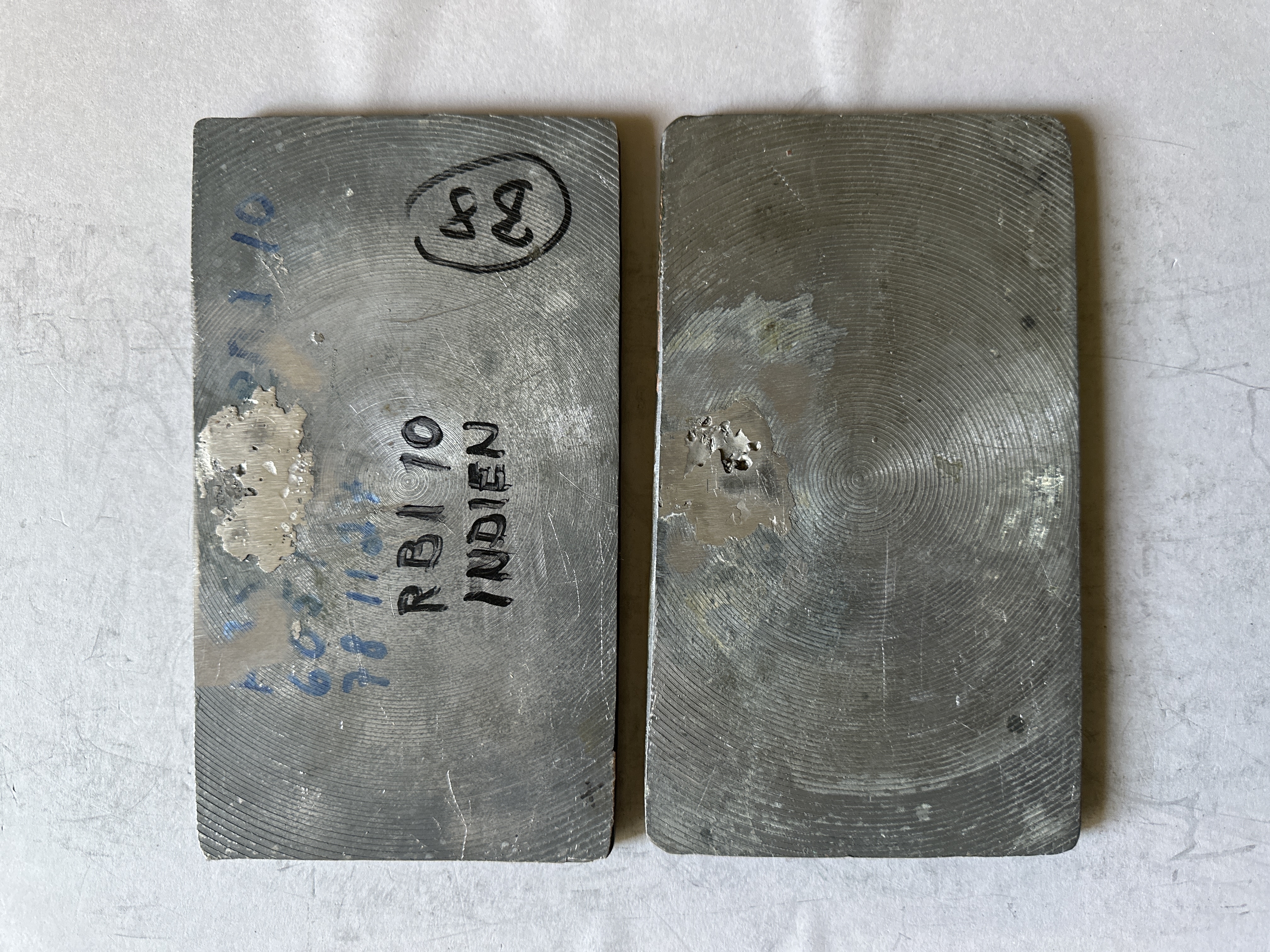 Pressplattor för vattenmärkestillverkning. Två rektangulära plattor, matris och patris, tillverkad i koppar och bly. Plattorna med motiv föreställande lejon-kapitälen av Ashoka, samt skriften "RBI 20". Påskrift i tusch på framsidan av båda plattorna: "B. 34". Påskrift på baksidan av patrisen: "RBI 10 INDIEN B8".
