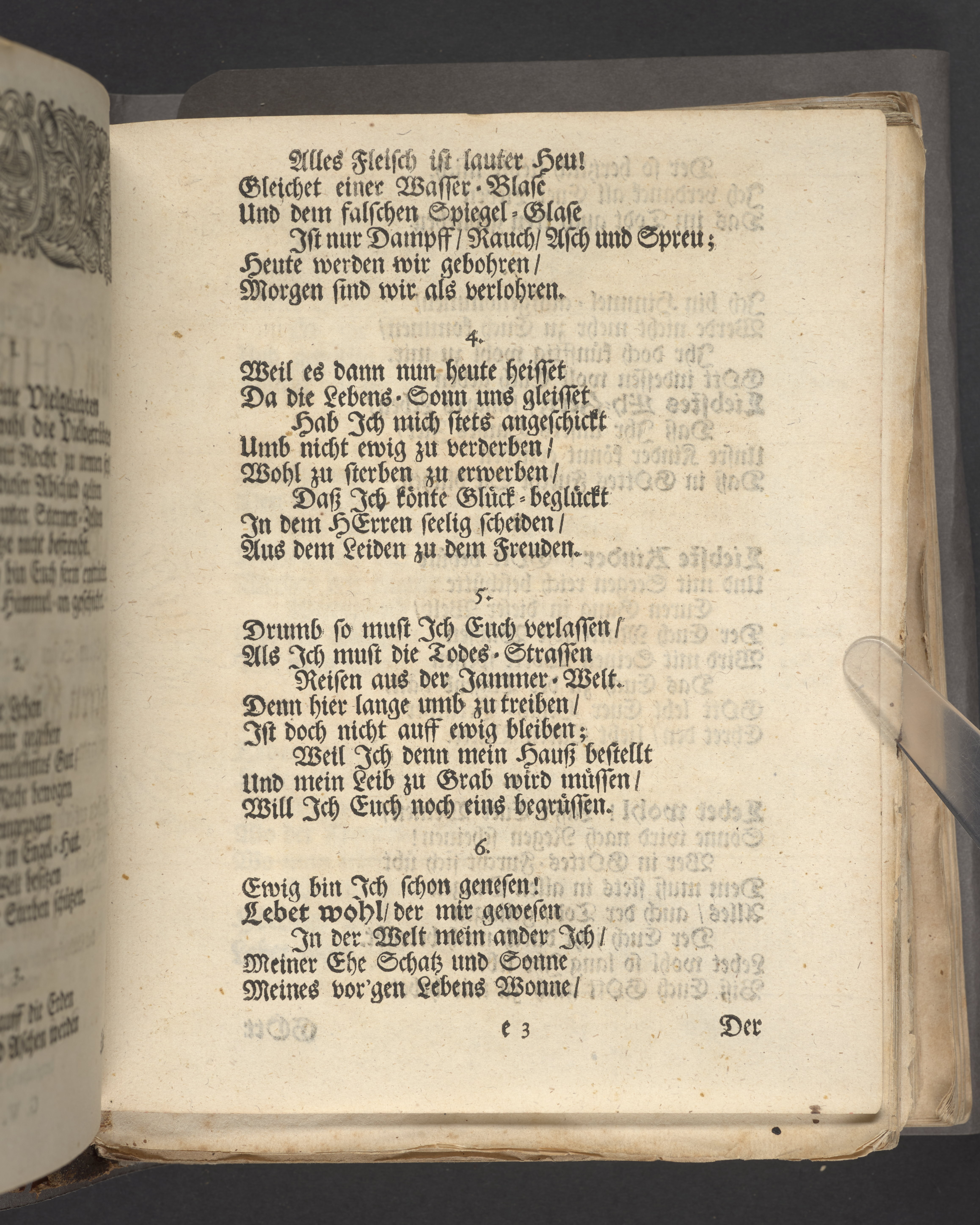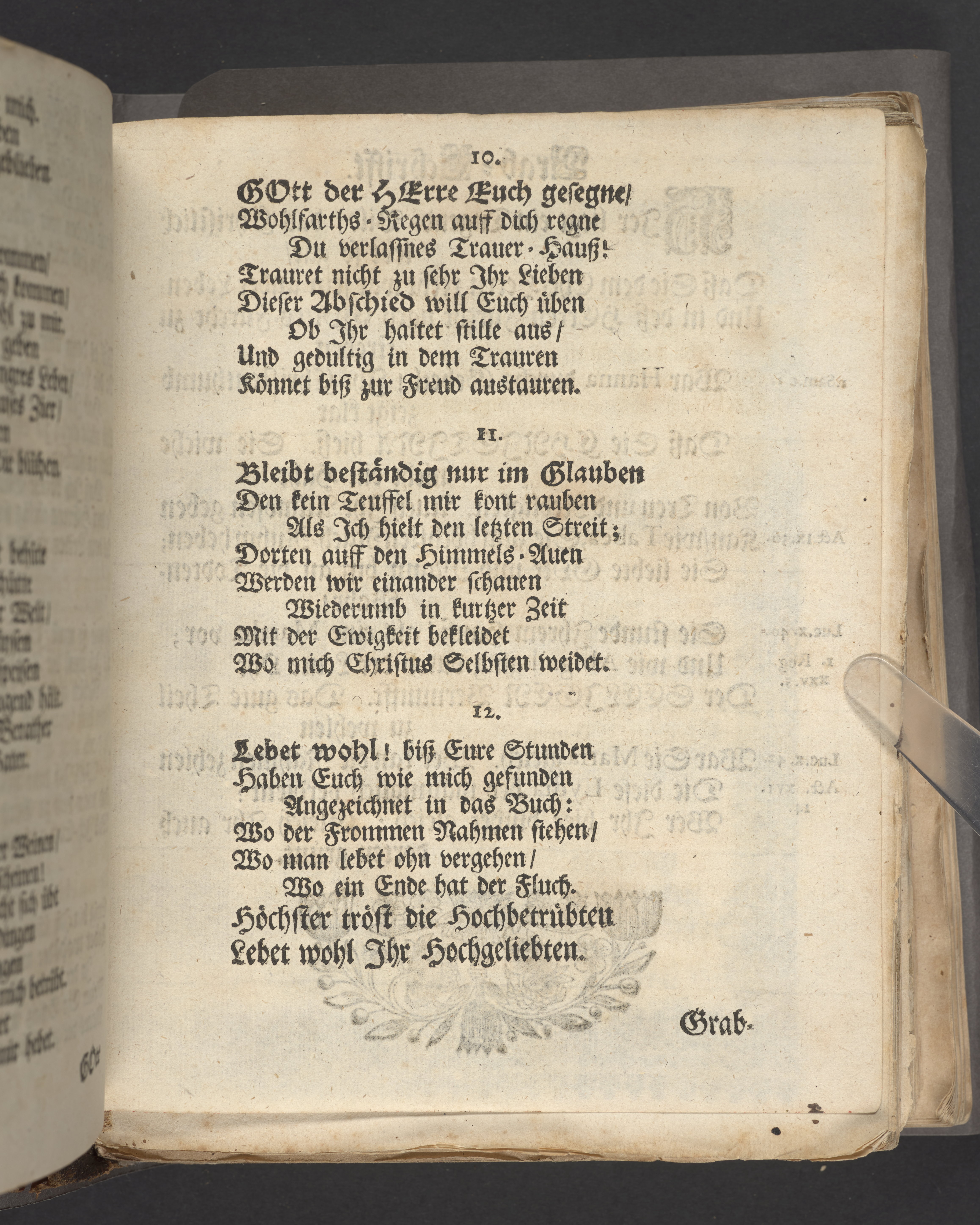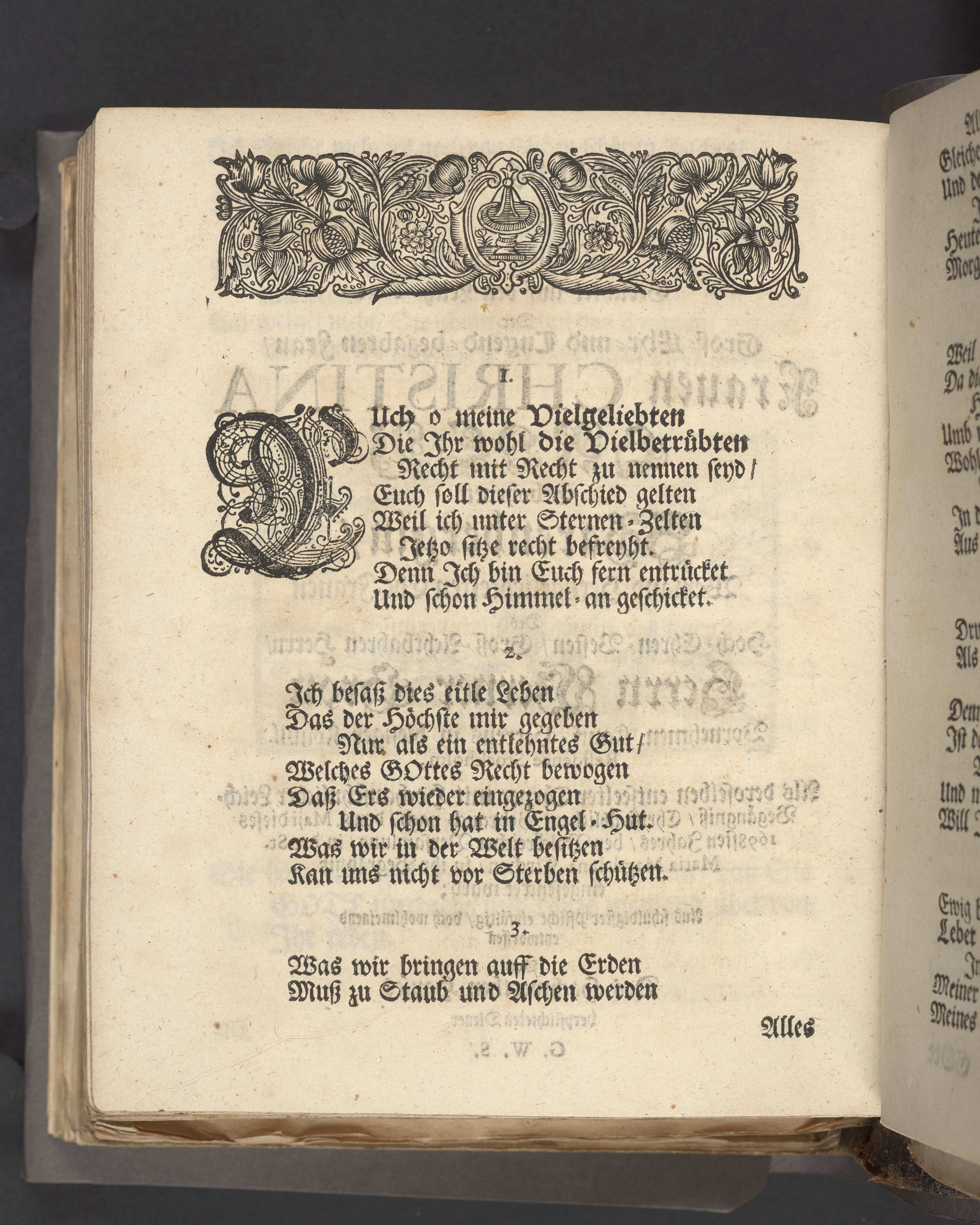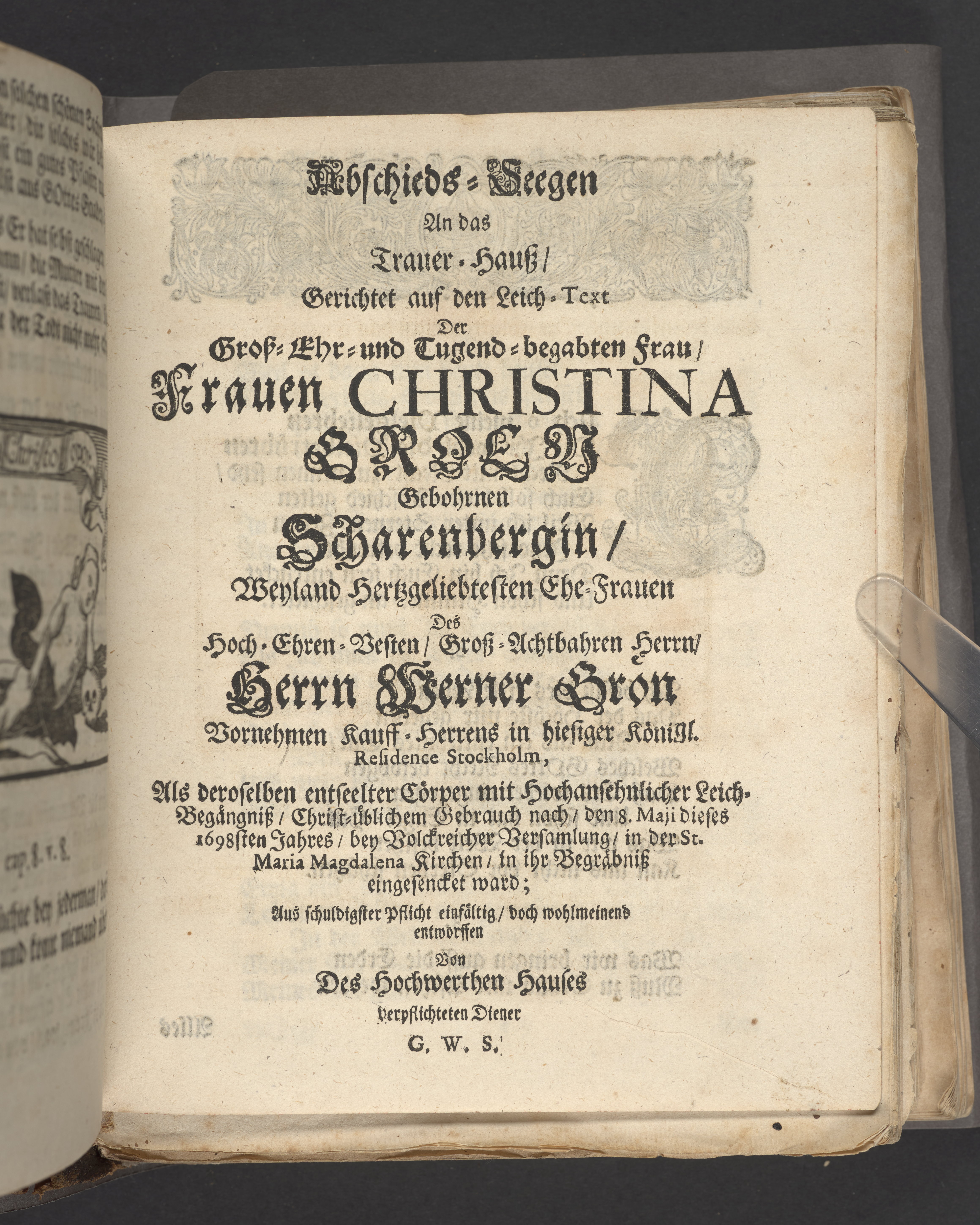 Abschieds-Seegen an das Trauer-Hauß/ gerichtet auf den Leich-Text Groß- Ehr - und tugend-begabten Frau/ Frauen Christina Groen gebohrnen Scharenbergin/ Weyland Hertzgeliebtesten Ehe-Frauen des Hoch-Ehren-Vesten / Groß-Achtbahren Herrn/ Herrn Werner Grön Vornehmen Kauff-Herrens in hiesiger Königl. Residence Stockholm, Als deroselben entseelter Cörper mit Hochansehnlicher Leich-Begängniß eingesencket ward; Aus schuligster Pflicht einfältig / doch wohlmeinend entworfen von Des Hochwerthen Hauses verpflichteten Diener G.W.S.
