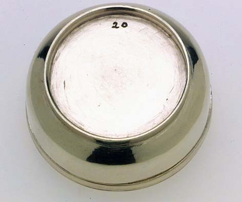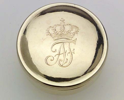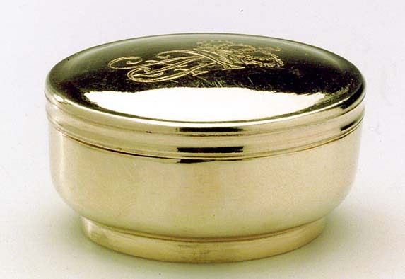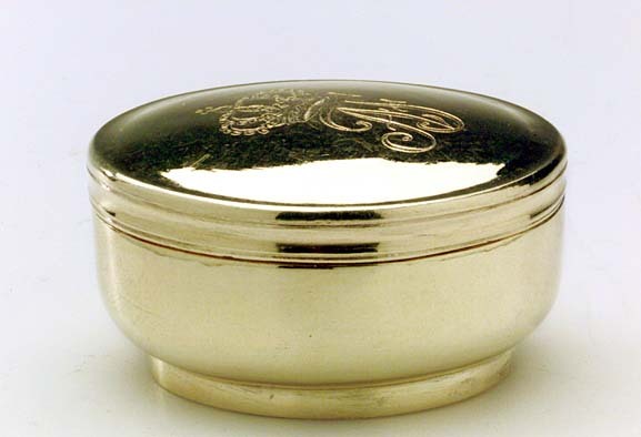 Dosa av förgyllt silver. Slätt, något bukigt liv. Bandformig låg fot. Plant svagt välvt lock utan gängor. På locket graverat namnchiffer under kunglig krona: AF. Stämplar på dosans kant: HVI, U 2, S:t Erik (Stockholm 1802). Senare komplettering eller lagring av del av Adolf Fredriks resekök(nr 16-23), överlämnat från Kronans silvermagasin till Historiska museet 1891, (SMH nr 8954, märkt med svart färg under botten).