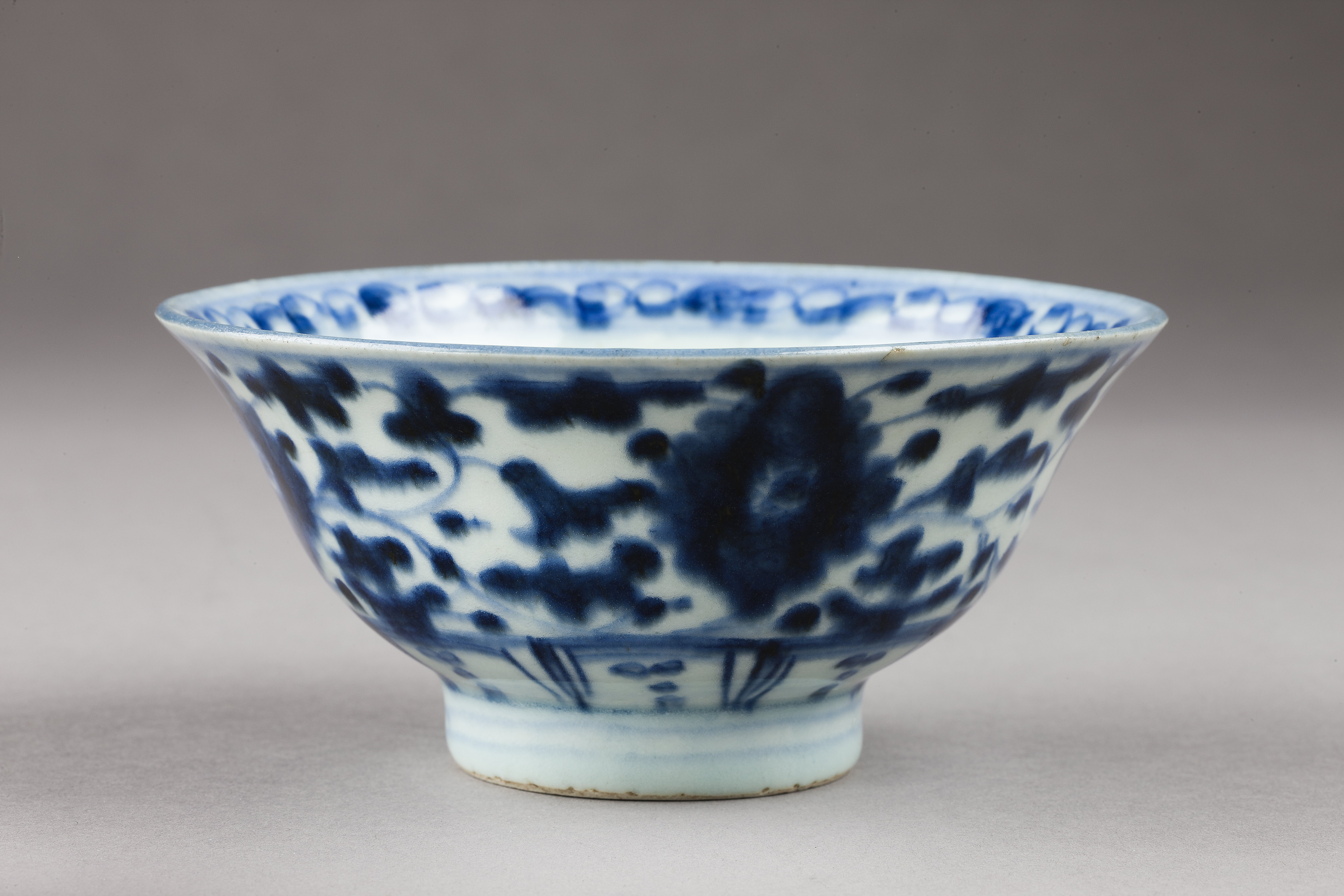 SKÅL. Klockformig på hög fotkant. Dekor i blått. På utsidan, täckandes större delen av skålen, fyra blommor med blad sammanbundna av skaft. Nedtill en bård av tvärstreck och ränder. På insidans botten en kvist med blomma inom två koncentriska ringar. Kring brädden en bård av ringliknande ornament. På undersidan ett otydligt tecken. Inköpt av Wilhelmina von Hallwyl under resa 17-26 oktober 1890 hos antikvitetshandlare Alessandro Scavini, Intra, Italien, för 6 Lire.