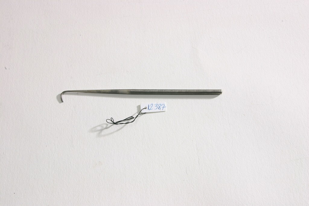 Verktyg av stål med smalt finräfflat skaft, avsmalnande framåt i en uppåtböjd krok. Svagt synligt ett inslaget "W" samt "S" och ett "I".