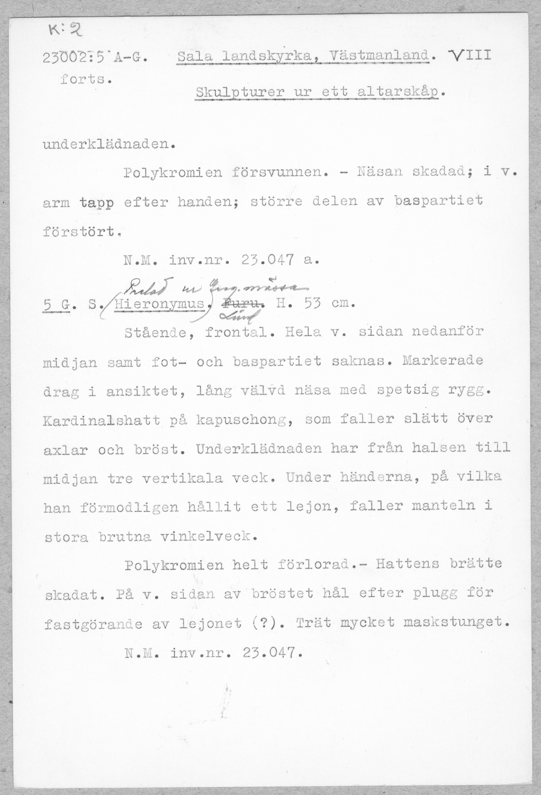 Kondition: Kristusbilden har förlorat båda armarna, Barbaras vänstra hand och krona skadade, kardinalens nedre parti bortbrutet, hatten fragmentarisk. Färg: endast obetydliga fragment bevarade.
