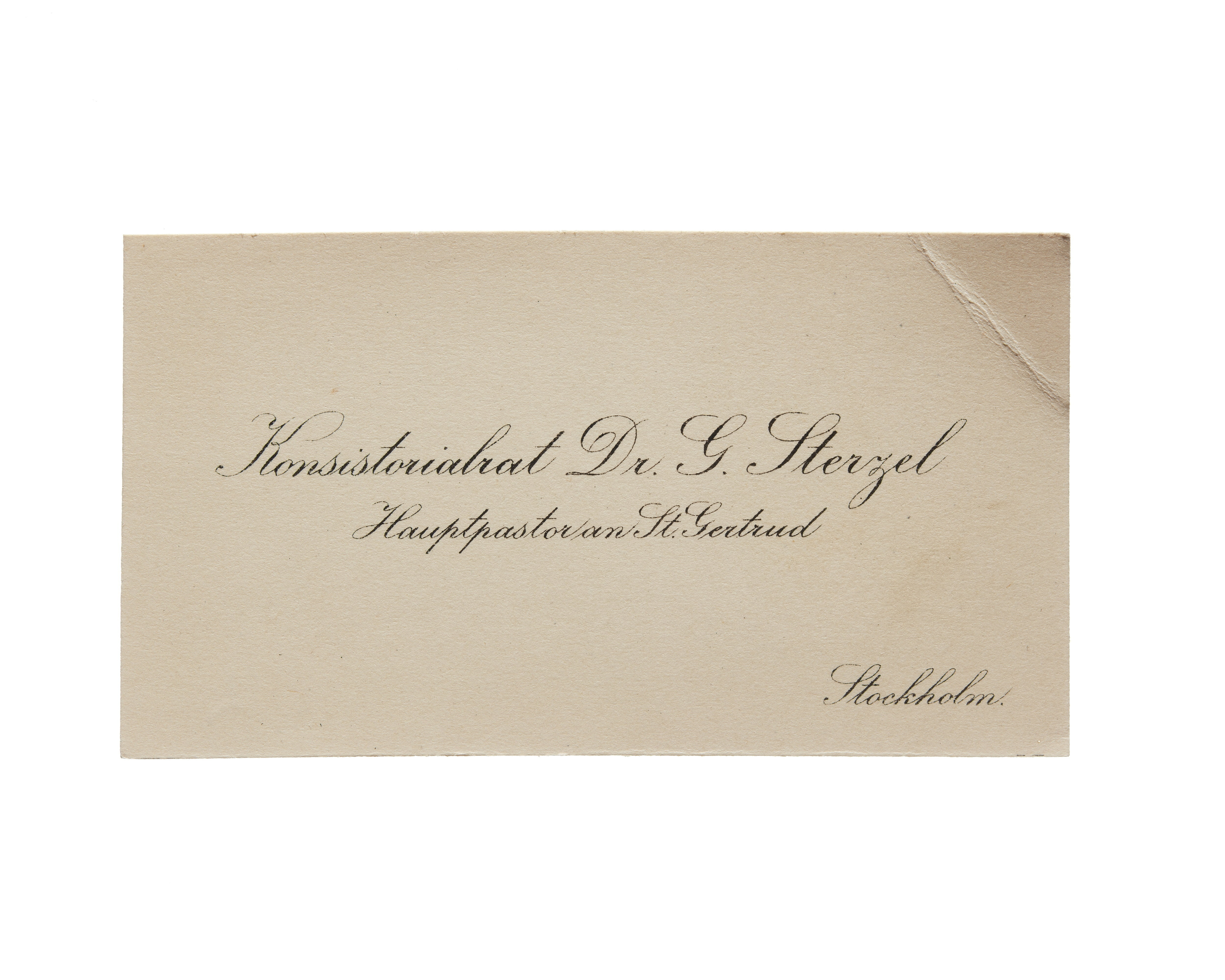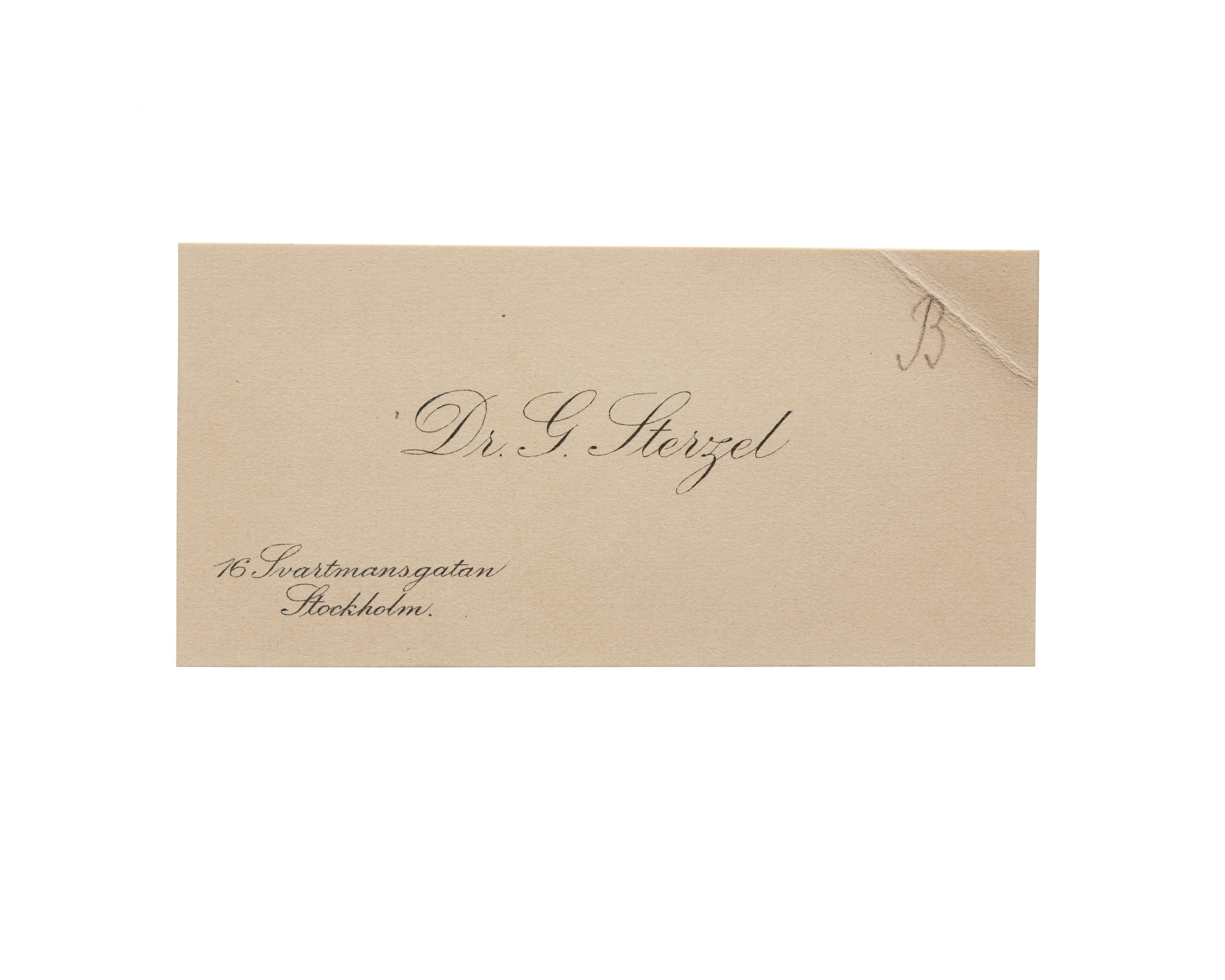 Tretton visitkort från Dr. G. Sterzel, Kyrkoherde. Första kortet är utan datum, vikt i högra sidan. Adress (nedre vänstra hörnet) 16 Svartmangatan, (nedre högra hörnet) Stockholm. Andra kortet är utan datum, vikt i högra sidan. Tredje kortet är utan datum, vikt i högra sidan. Fjärde kortet daterat 1914, vikt i högra sidan. Femte kortet daterat 1916, vikt i högra sidan. Sjätte kortet daterat 1916, vikt i högra sidan. . Sjunde kortet daterat 1915, vikt i övre högra hörnet. Överlämnat i samband med Vilhelminas bilolycka i 1915. Åttonde kortet daterat 1916, vikt i övre högra hörnet. Nionde kortet daterat 1916, vikt i övre högra hörnet. Tionde kortet daterat 1916, vikt i övre högra hörnet. Elfte kortet daterat 1920, vikt i övre högra hörnet. Tolfte kortet daterat 1921. Handskrift "....". Trettonde kortet daterat 1921.