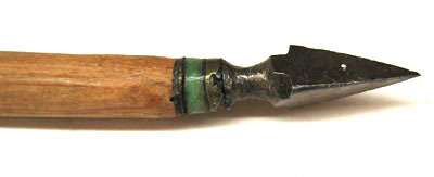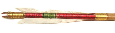 Spets av stål, l 20 mm, tresidig med konkav, cirkulär hals och tången inslagen i skaftet. Mellan spets och skaft dekoration, ca 4 mm bred, i form av grön sten? mellan tunna plattor av gulmetall. Skaft av ljust trä liknande furu. Bakpartiet, l 133 mm, målat i fält: guld - rött - grönt - rött - guld med över mitten lindad tunn silvertråd i rutnät av romber. Vita styrfjädrar. Avslutas med strängläge tillskuret med två armar.